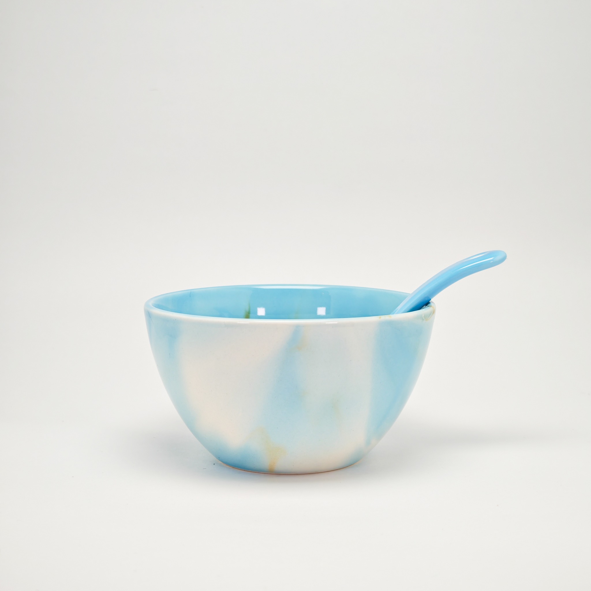 美しいマーブル模様が、まるでアート作品のようなスープボウルとスプーンのセット。