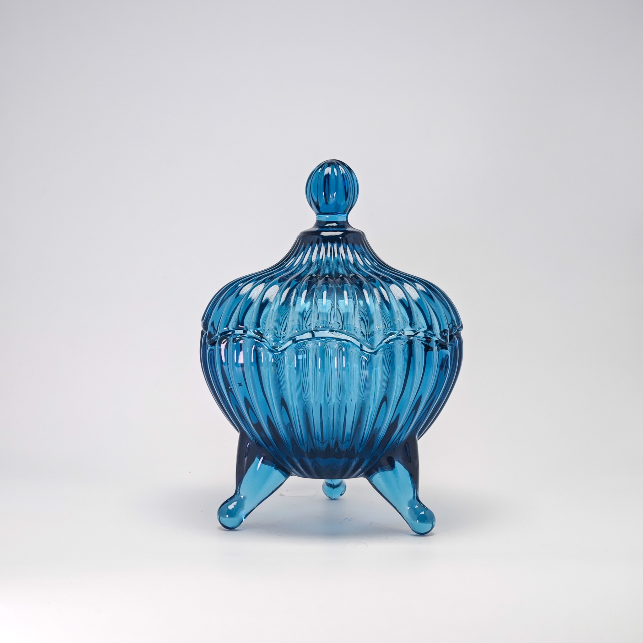 今回ご紹介したいのは、こちら。 まるでアンティークの宝石箱のような佇まいの、ブルーガラスが美しいコンポートキャニスターです。