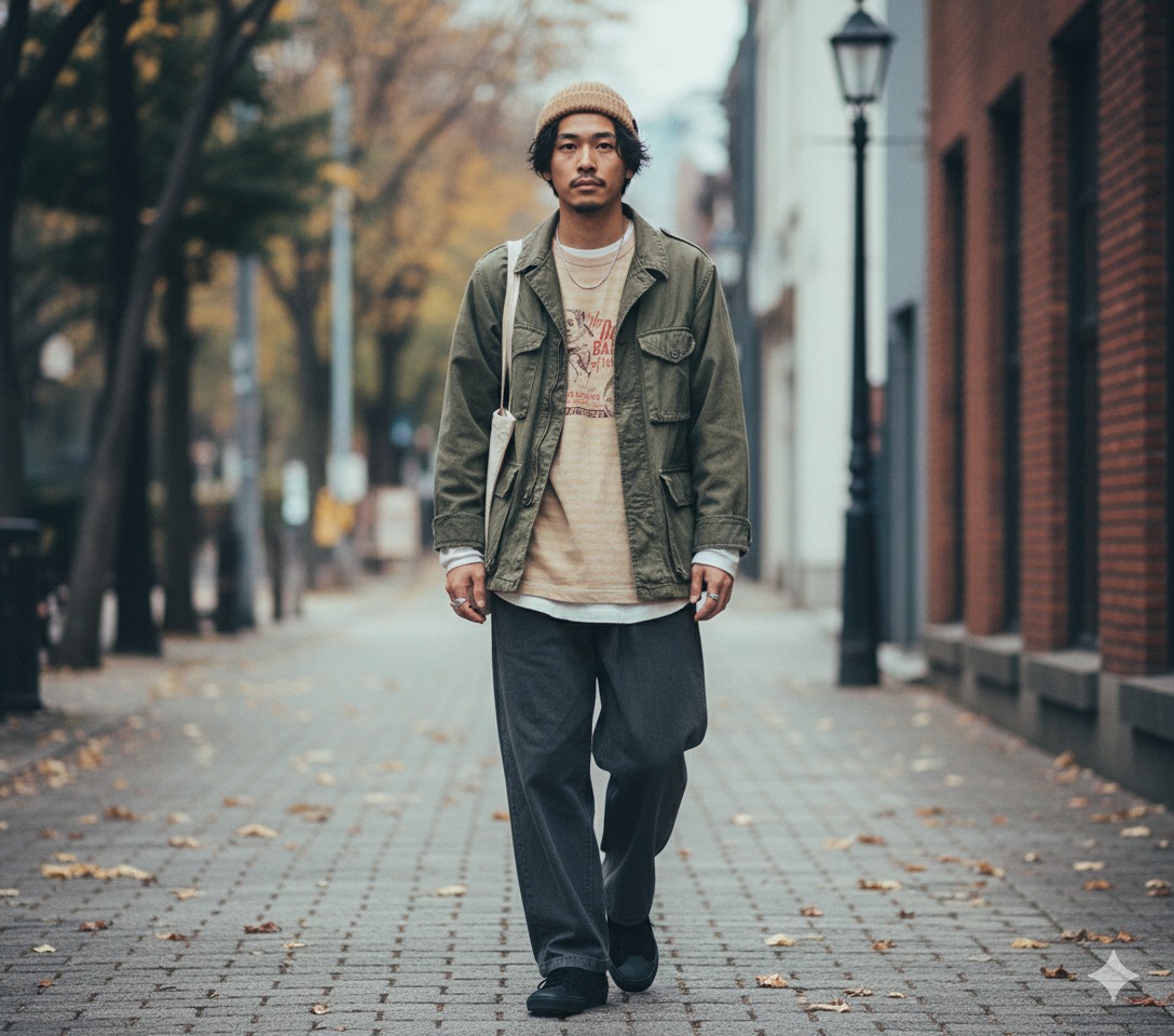 着こなしの提案: 古着のミリタリージャケットのインナーとして使うのがおすすめです!Tシャツの下に白のロンTをレイヤードし、上からカーキなどのミリタリーアウターを羽織ることで、温かいベージュが秋らしい柔らかな雰囲気に。劇画のパンチが、全体をぐっと引き締めます。