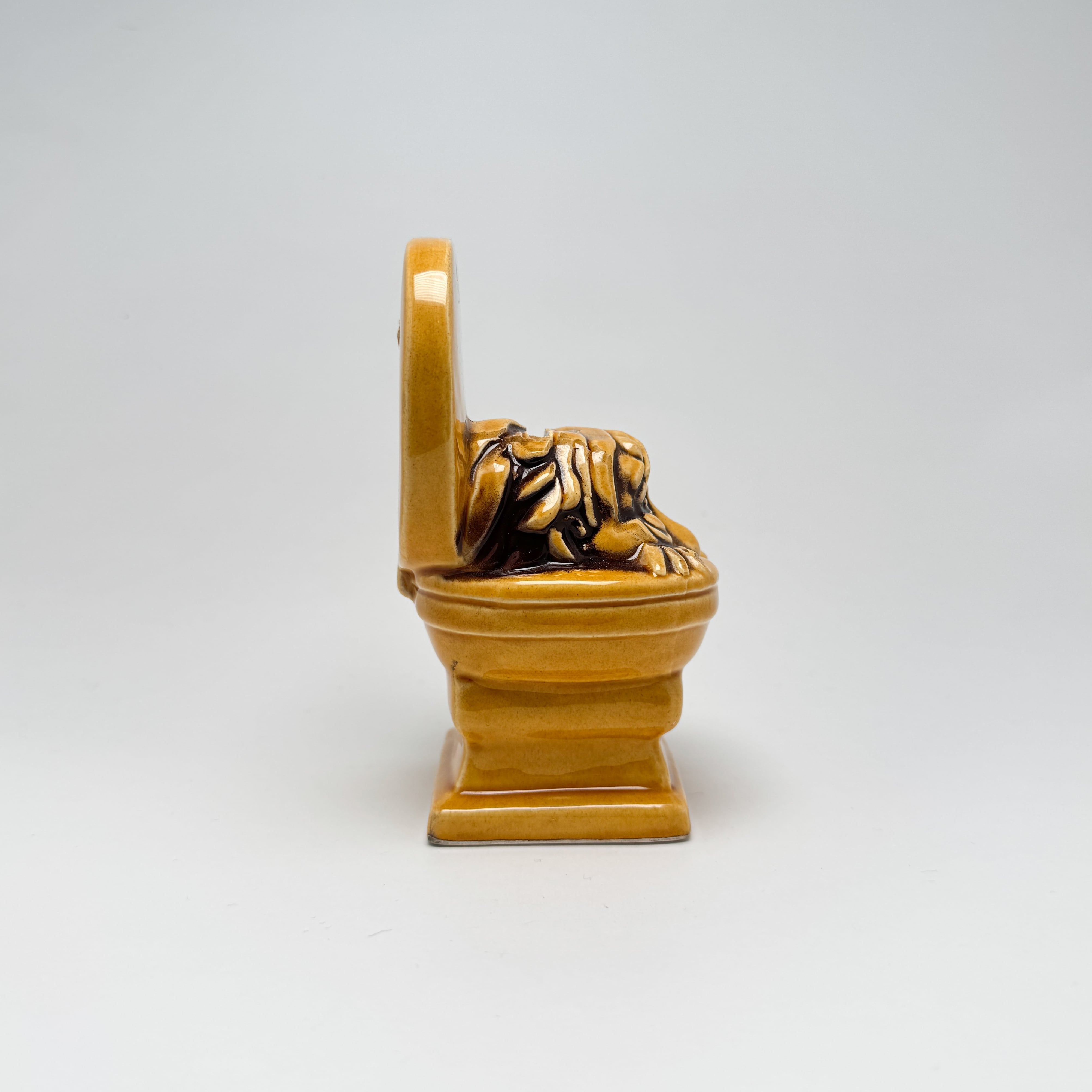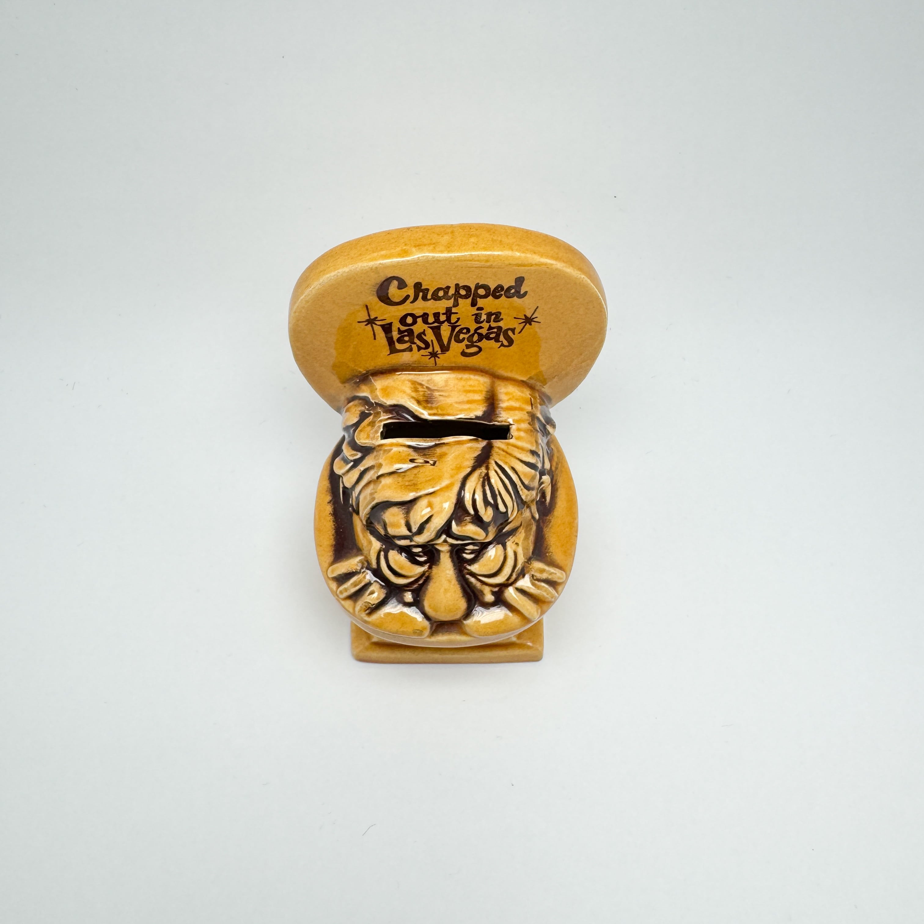 1960年代に日本で製造されたトイレ型のセラミックコインバンク。"Crapped out in Las Vegas"の文字がデザインされており、ラスベガスらしいユーモア溢れるアイテムです。
