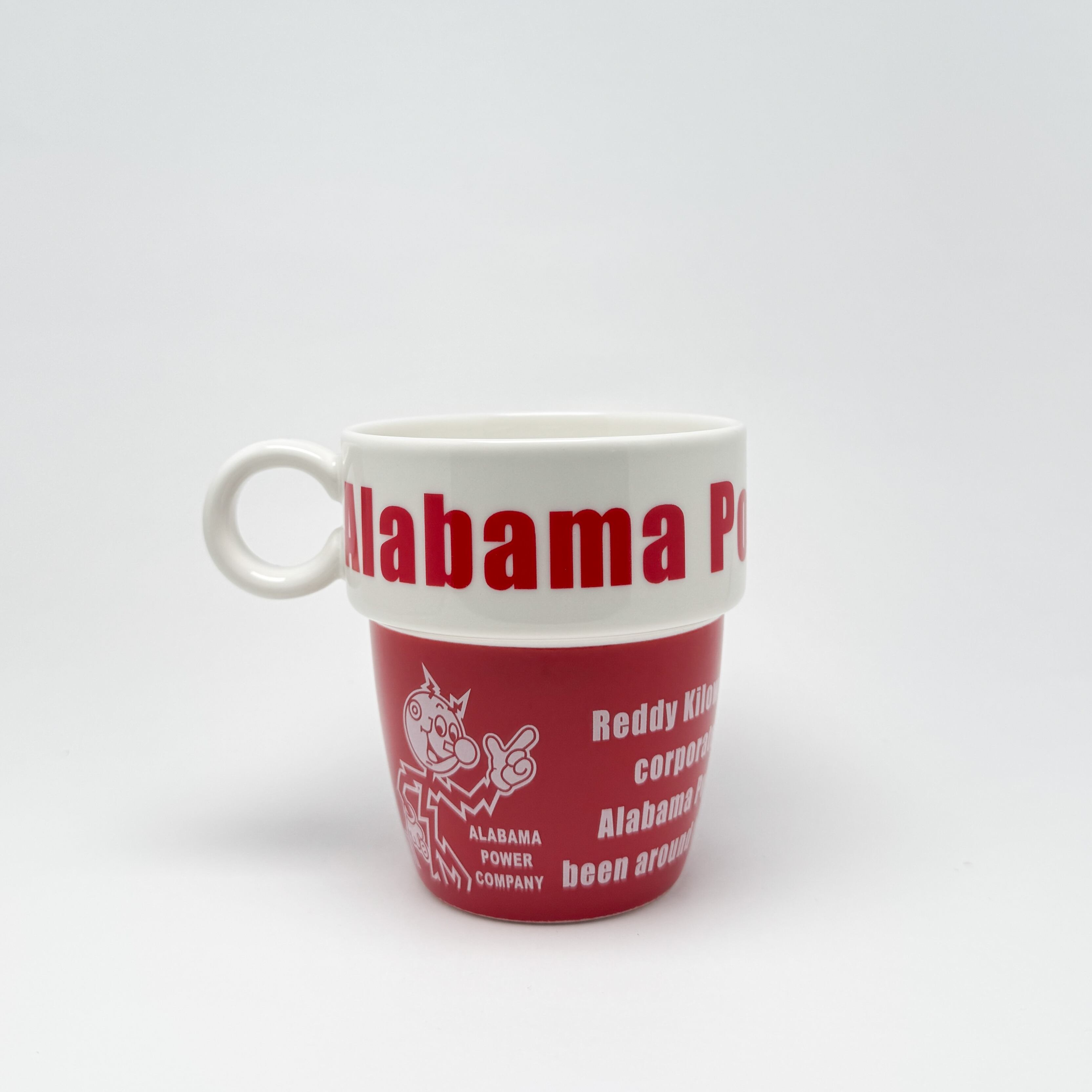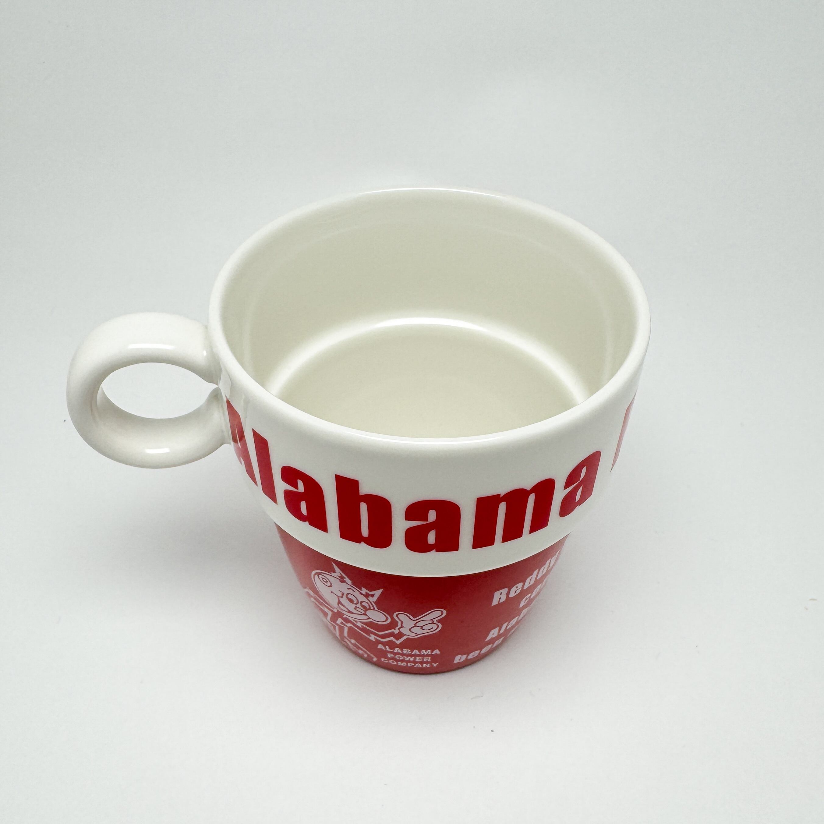 アラバマ電力(Alabama Power Company)のロゴとキャラクター「レディ・キロワット」が描かれたレトロなマグカップ。赤と白のデザインが特徴で、アメリカの企業プロモーションアイテムとして人気のヴィンテージ品です。