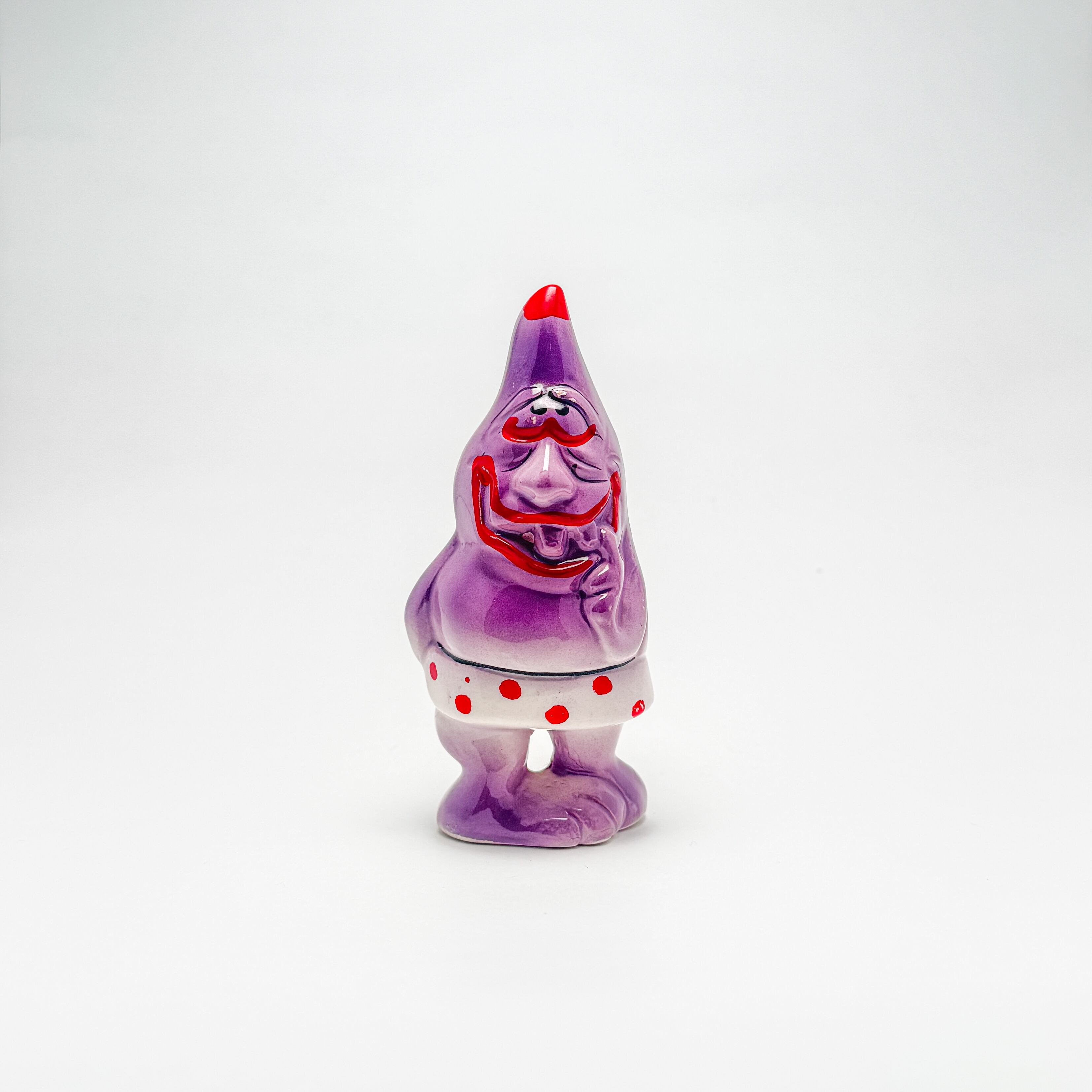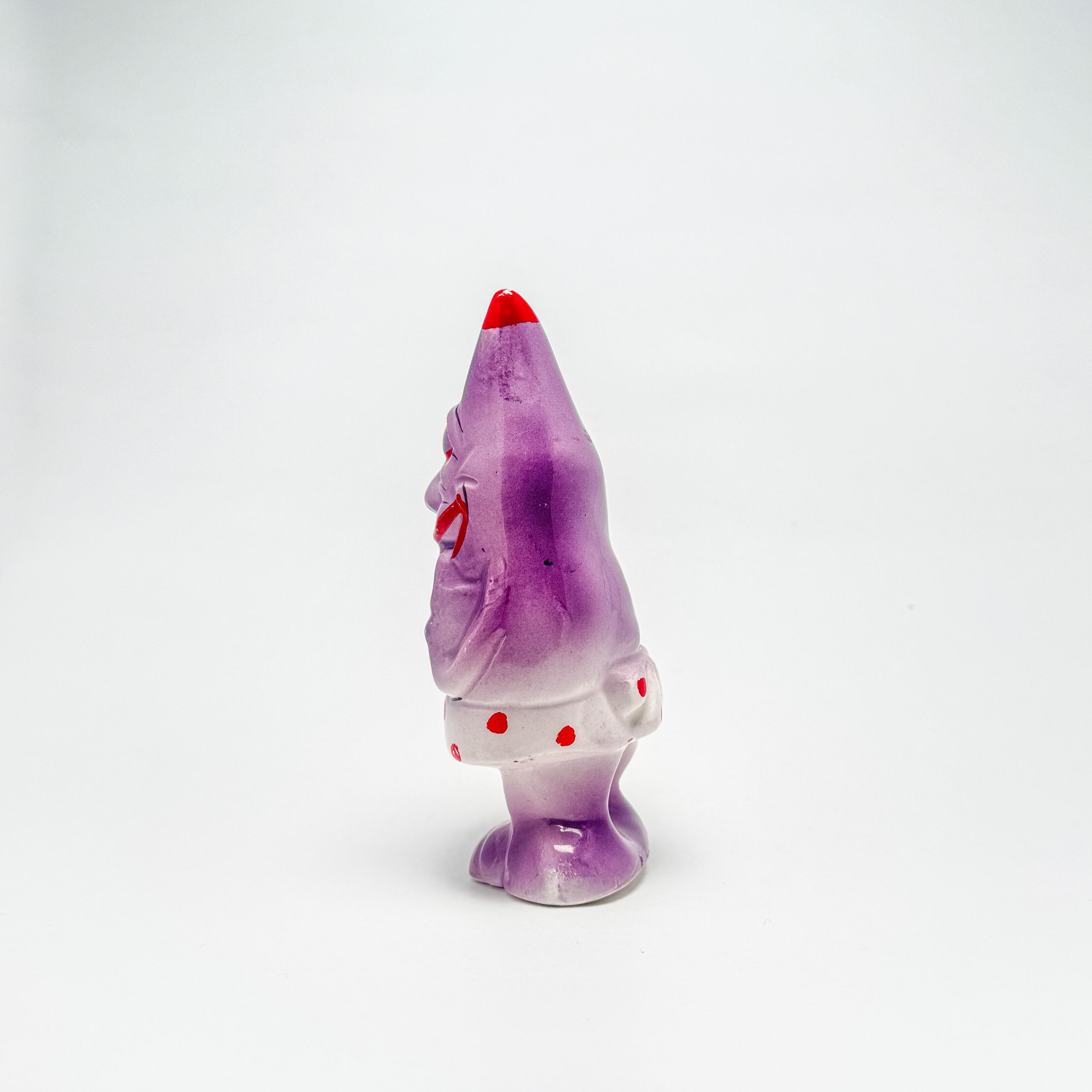 パープルのボディに、赤い顔のペイントと赤い水玉模様の白いバンドが特徴的な小人モチーフのドール。不気味ながらも愛嬌のある表情が魅力的で、コレクターの間で人気があります。