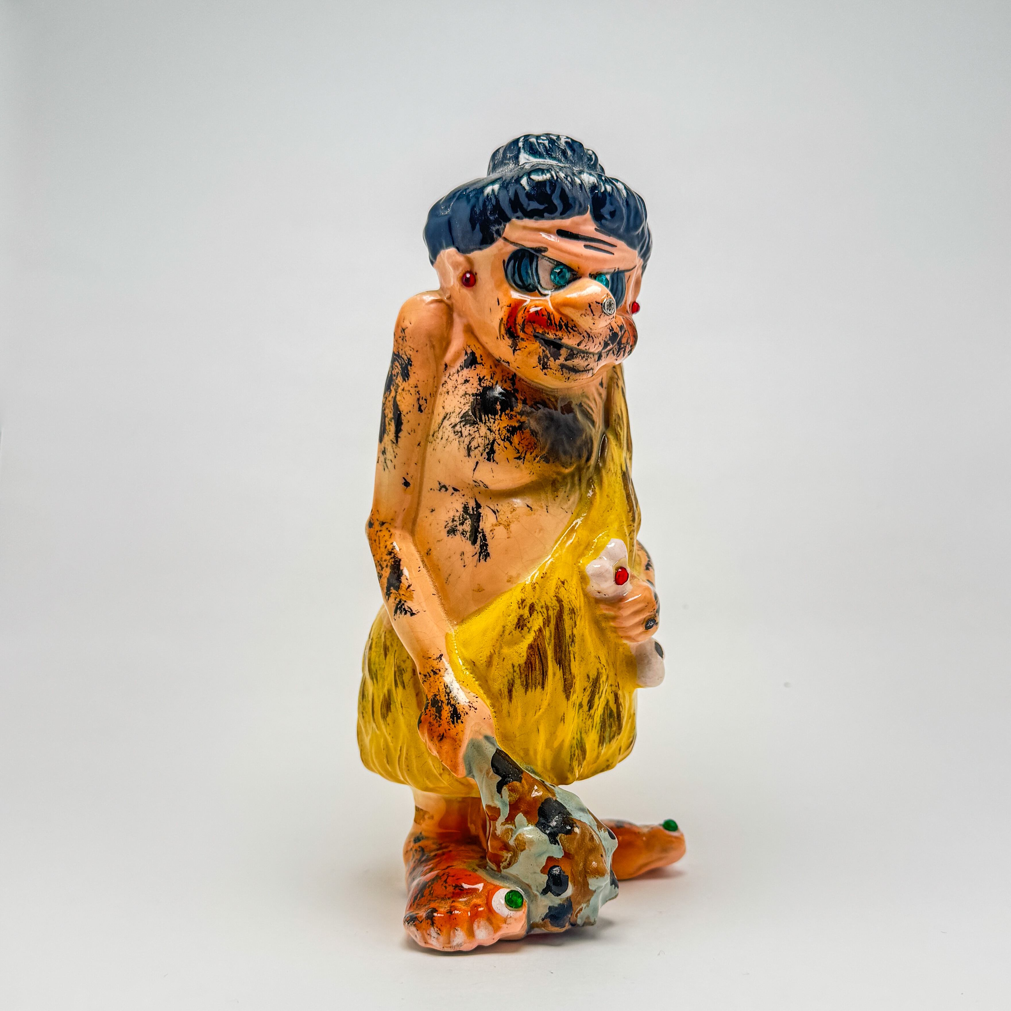 黄色い毛皮のようなものを身につけ、こぶし大の石を持ち、足にもジュエルアイが付いた女性の原始人を表現しています。