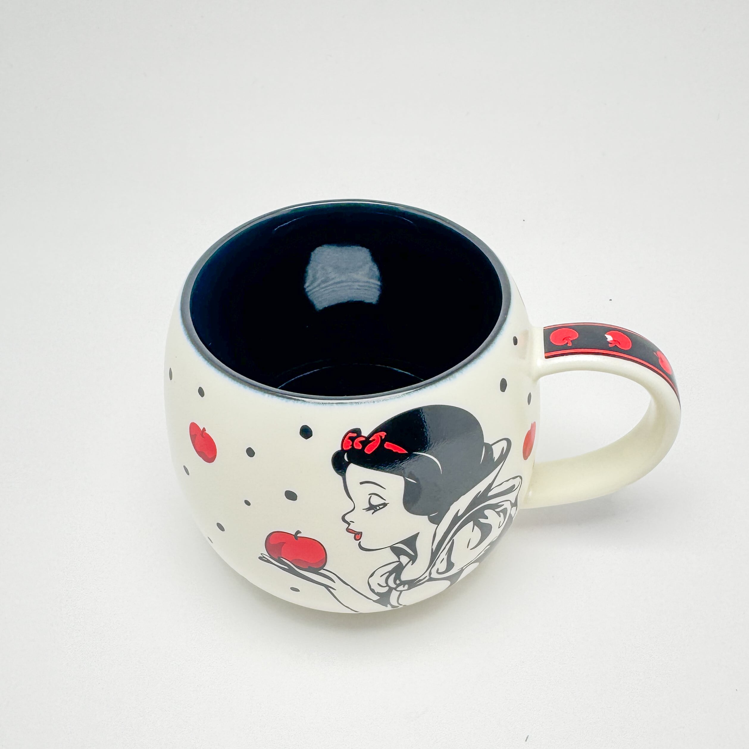 白を基調とした丸みを帯びた形状で、片面には、リンゴを持った白雪姫の横顔イラストが描かれています。マグカップ全体に、赤いリンゴと黒いドットが散りばめられ内側は紺色で、落ち着いた印象です。