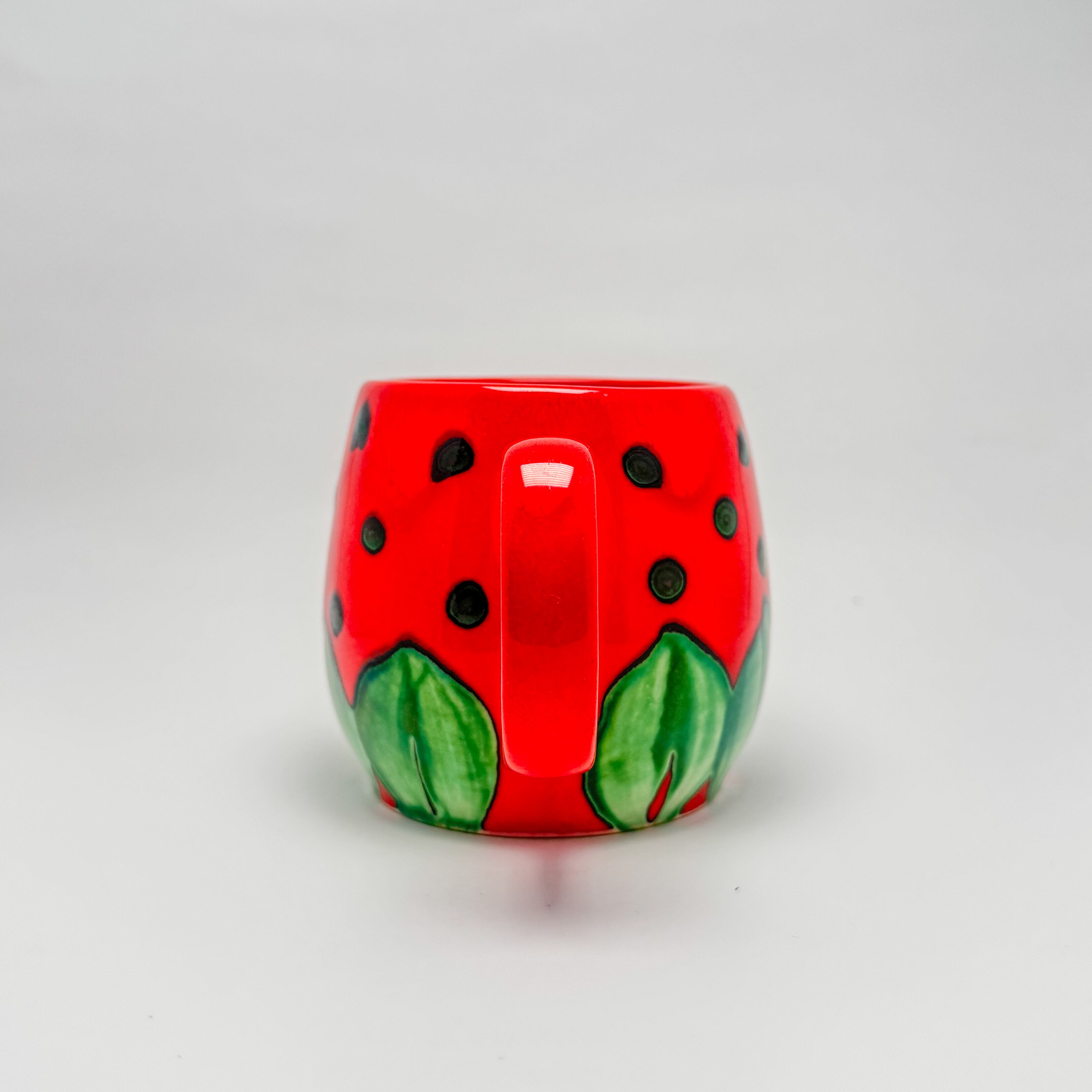 赤いボディに黒い種が描かれ、緑色の葉が付いたイチゴのデザインです。