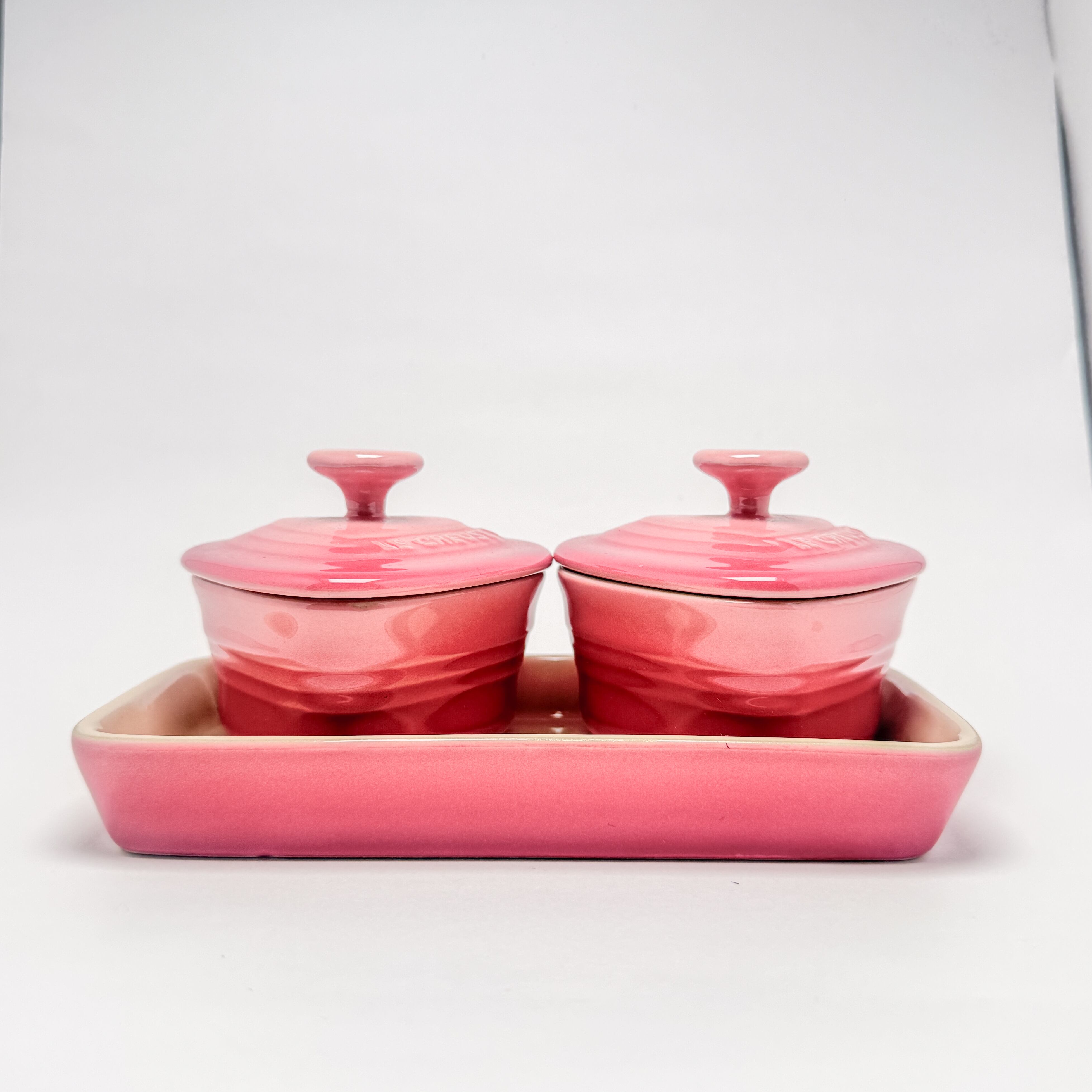 ル・クルーゼの人気シリーズ「L'Amour コレクション」より、ハート型の陶器キャニスター2個と専用トレイのセット。
