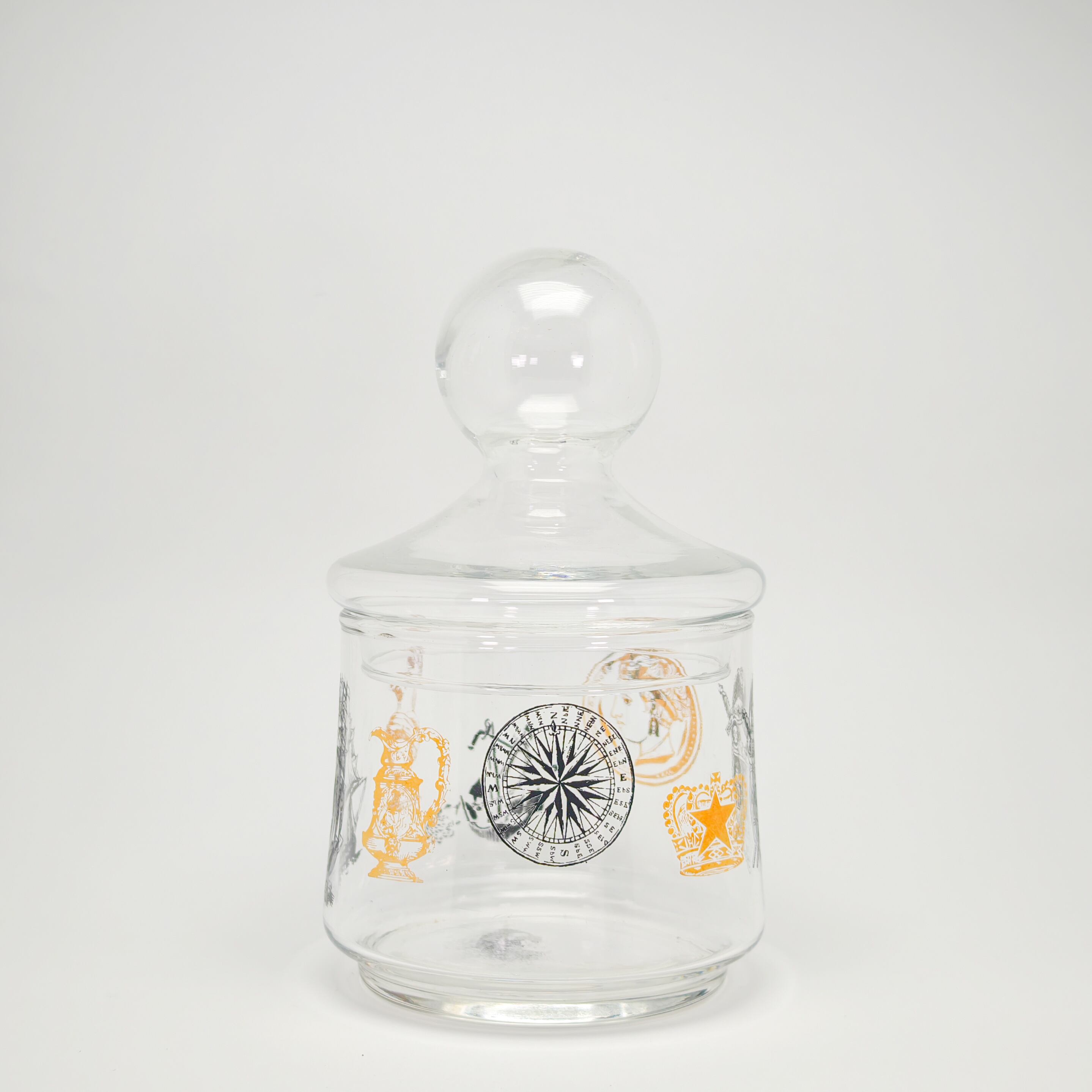 胴には船やコンパス、紋章など、航海を思わせるグラフィカルなプリントが施されています。蓋はぽってりとした球体のつまみが特徴的。透明度が高く、ディスプレイとしても美しい逸品です。