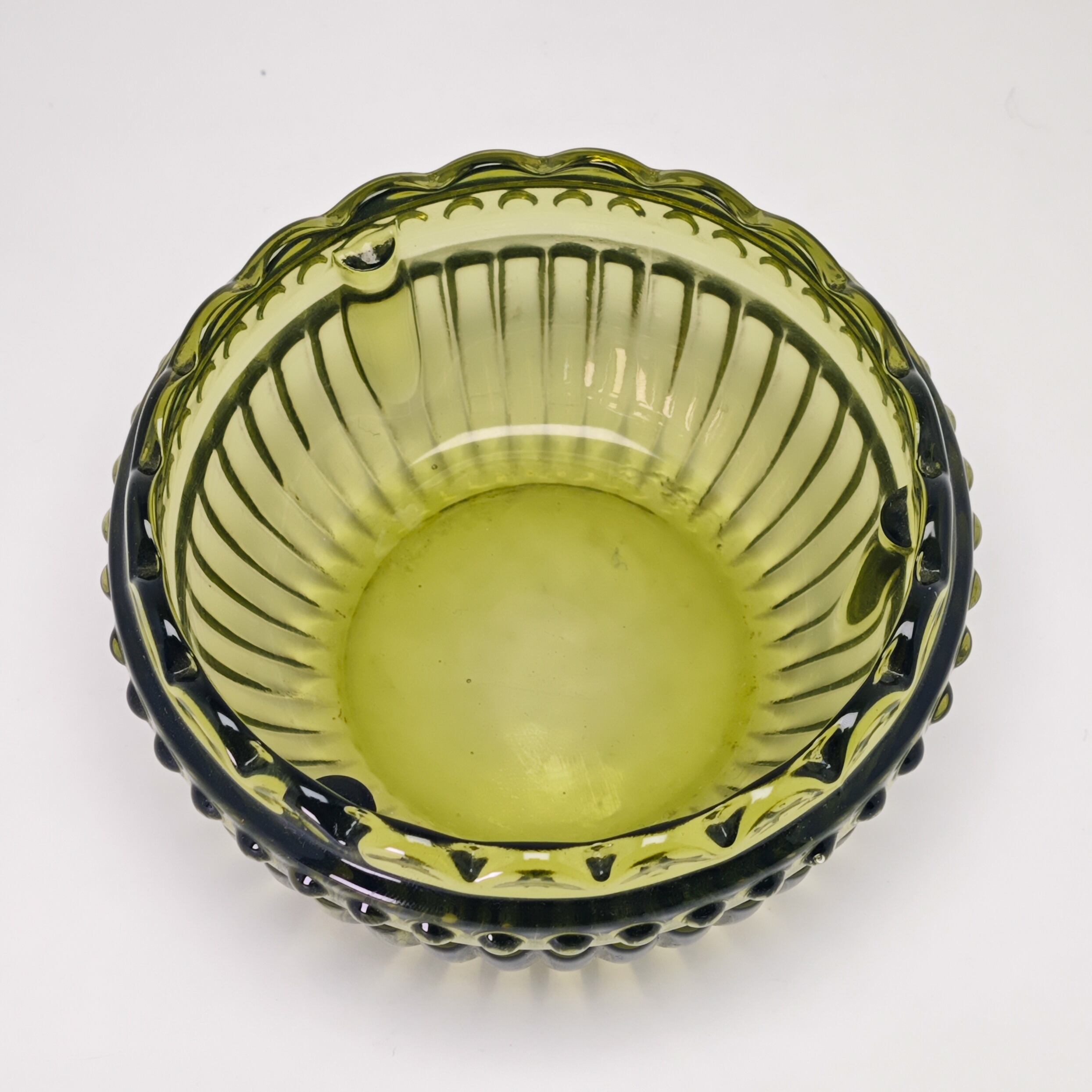 深いグリーンのガラスが光を受けるたびに柔らかく輝き、置いておくだけでも空間に華やぎを添えます。ふたのつまみや縁のデザインも細部まで丁寧に仕上げられており、菓子入れやアクセサリーケースとしてはもちろん、飾り棚の一角を彩るオブジェとしてもおすすめです。サイズ感はコンパクトながらも存在感があり、アンティーク好きの方にぜひ手に取っていただきたい一品です。