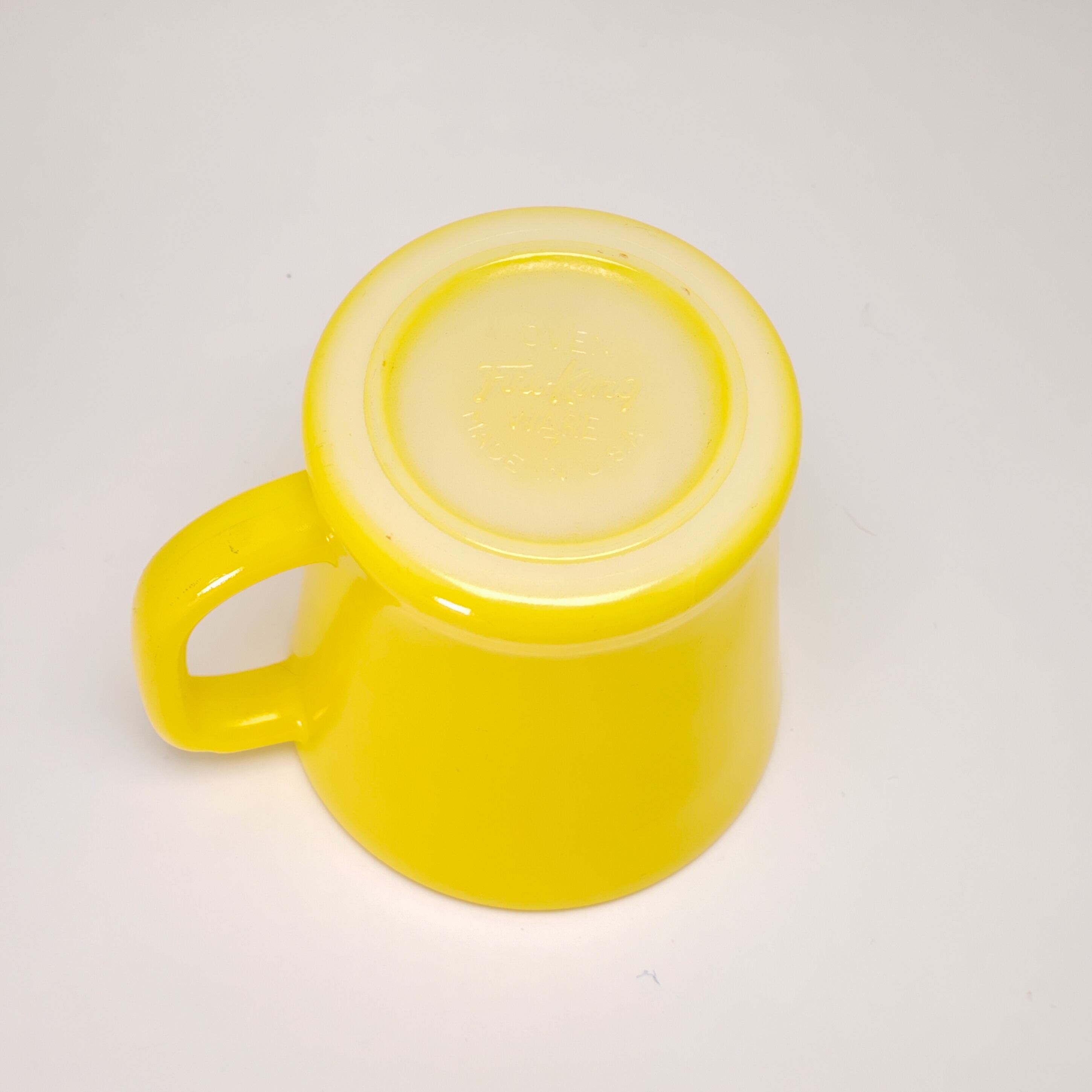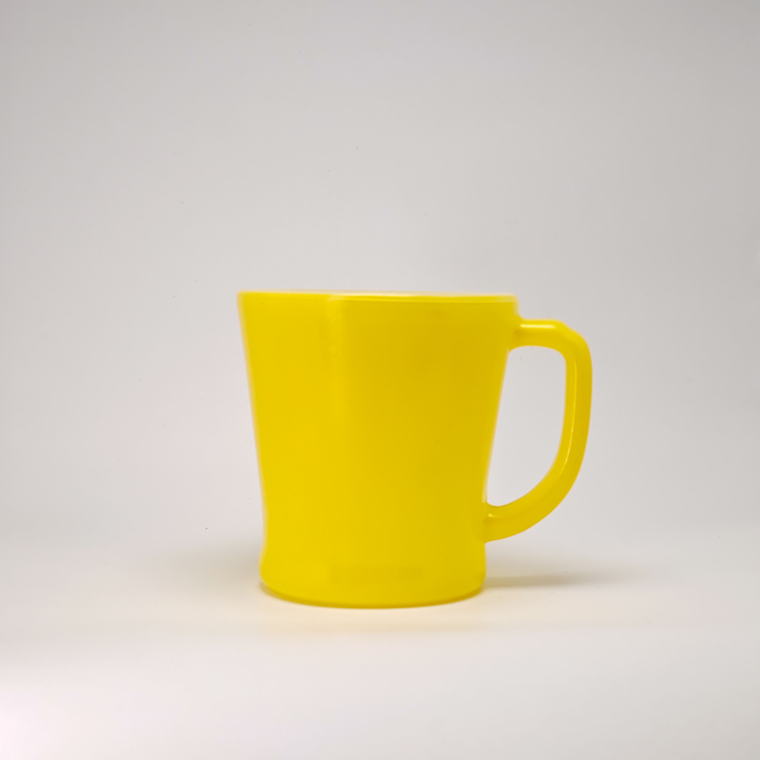その特徴的な丸みを帯びたハンドルとぽってりとした厚みのあるフォルムが手に優しくなじみます。こちらはビビッドなイエローが印象的な一品。ミルクガラス特有のやわらかな光沢が美しく、置いておくだけでも絵になります。コーヒータイムに彩りを添えてくれる、ヴィンテージ好きにはたまらないマグカップです。