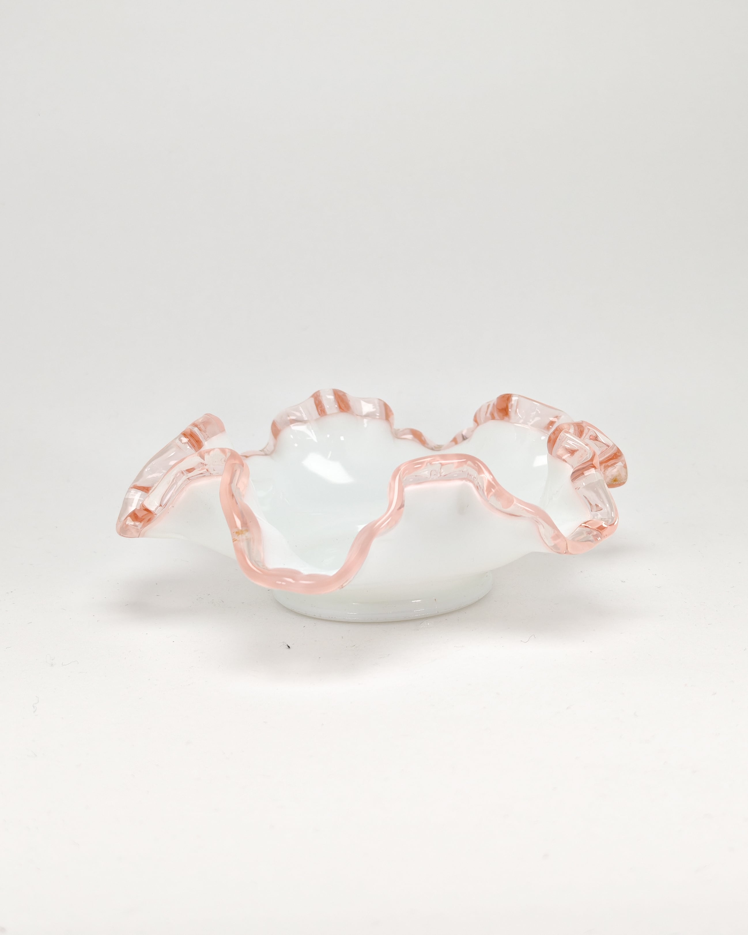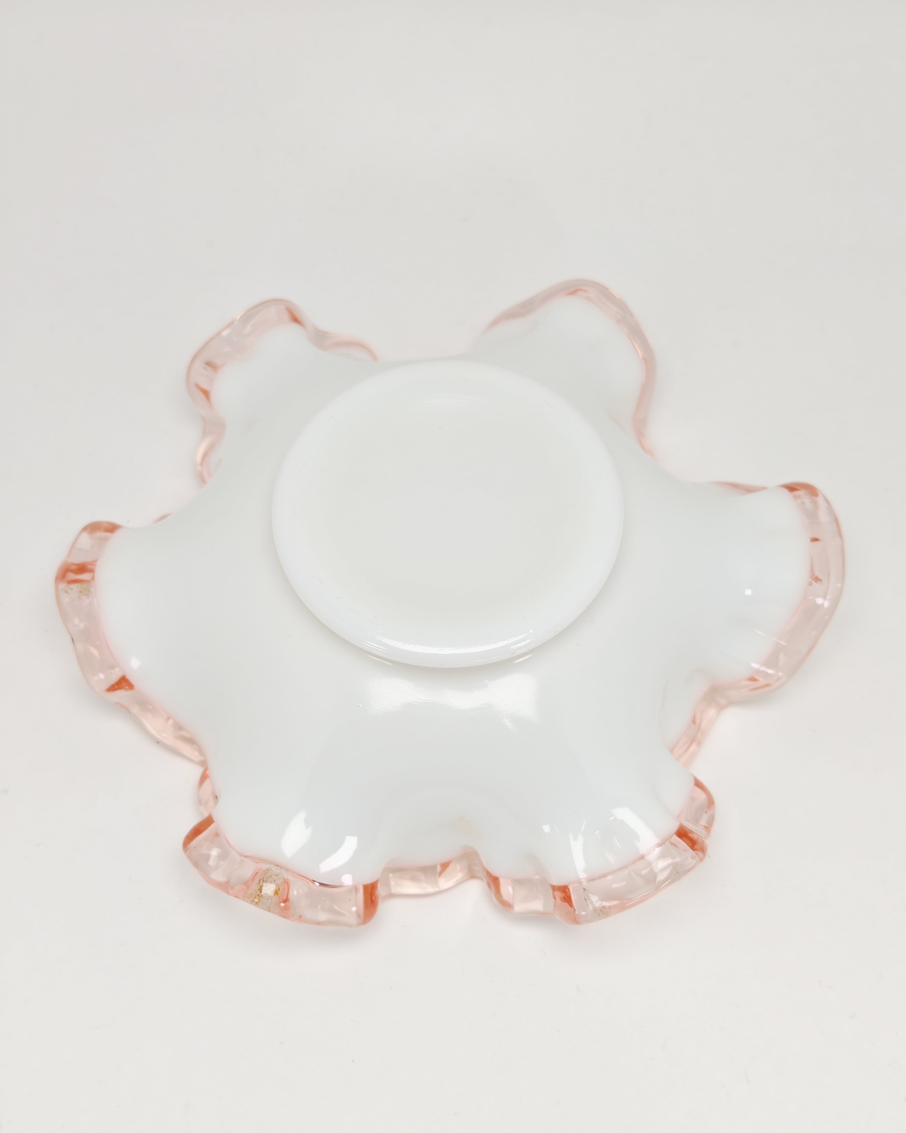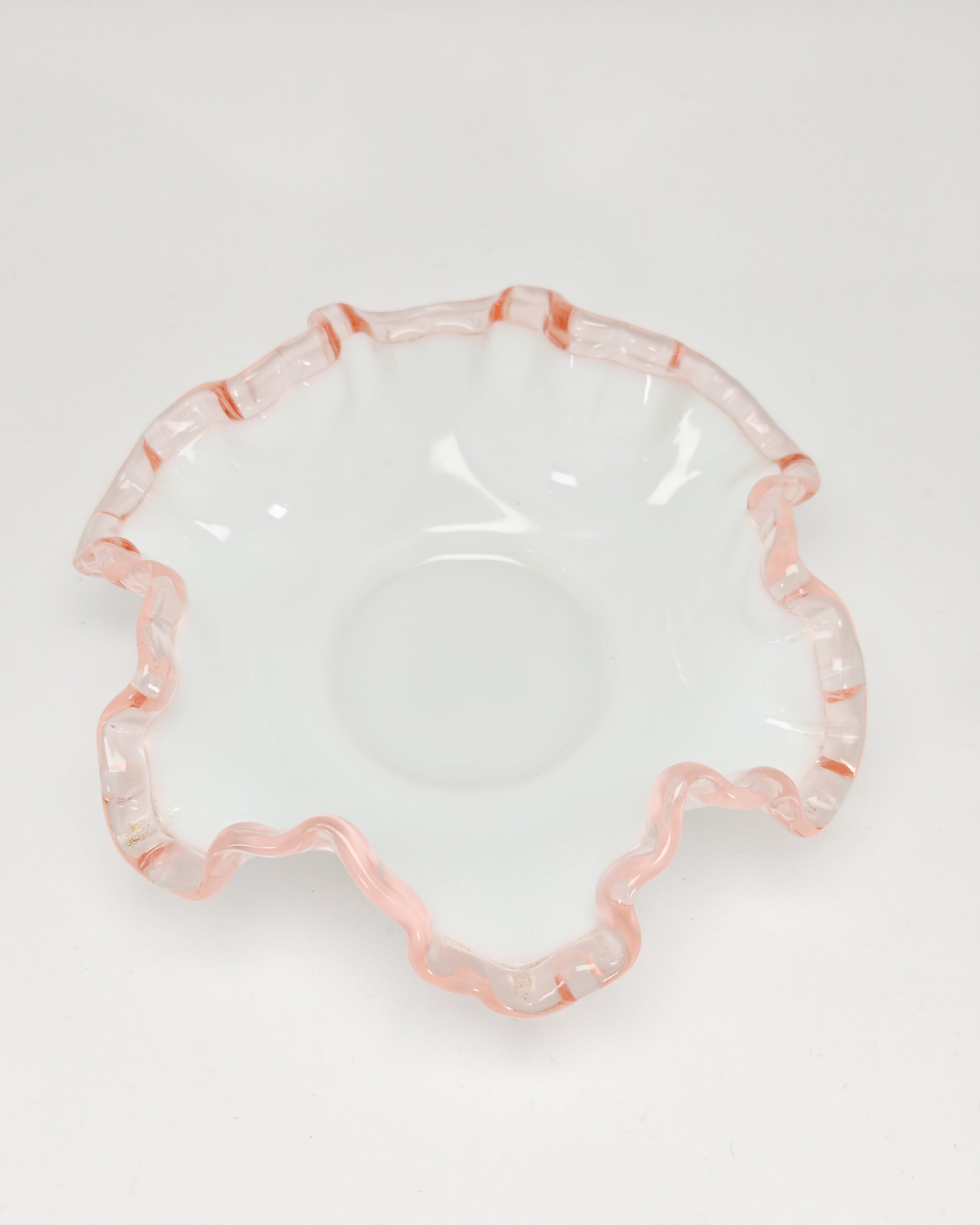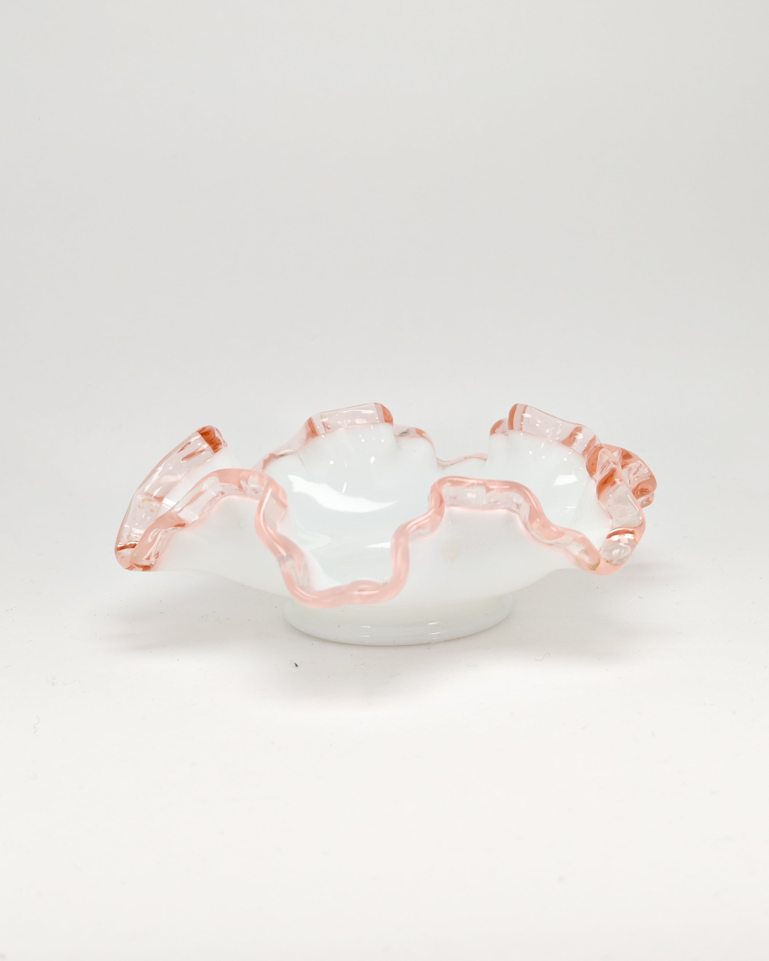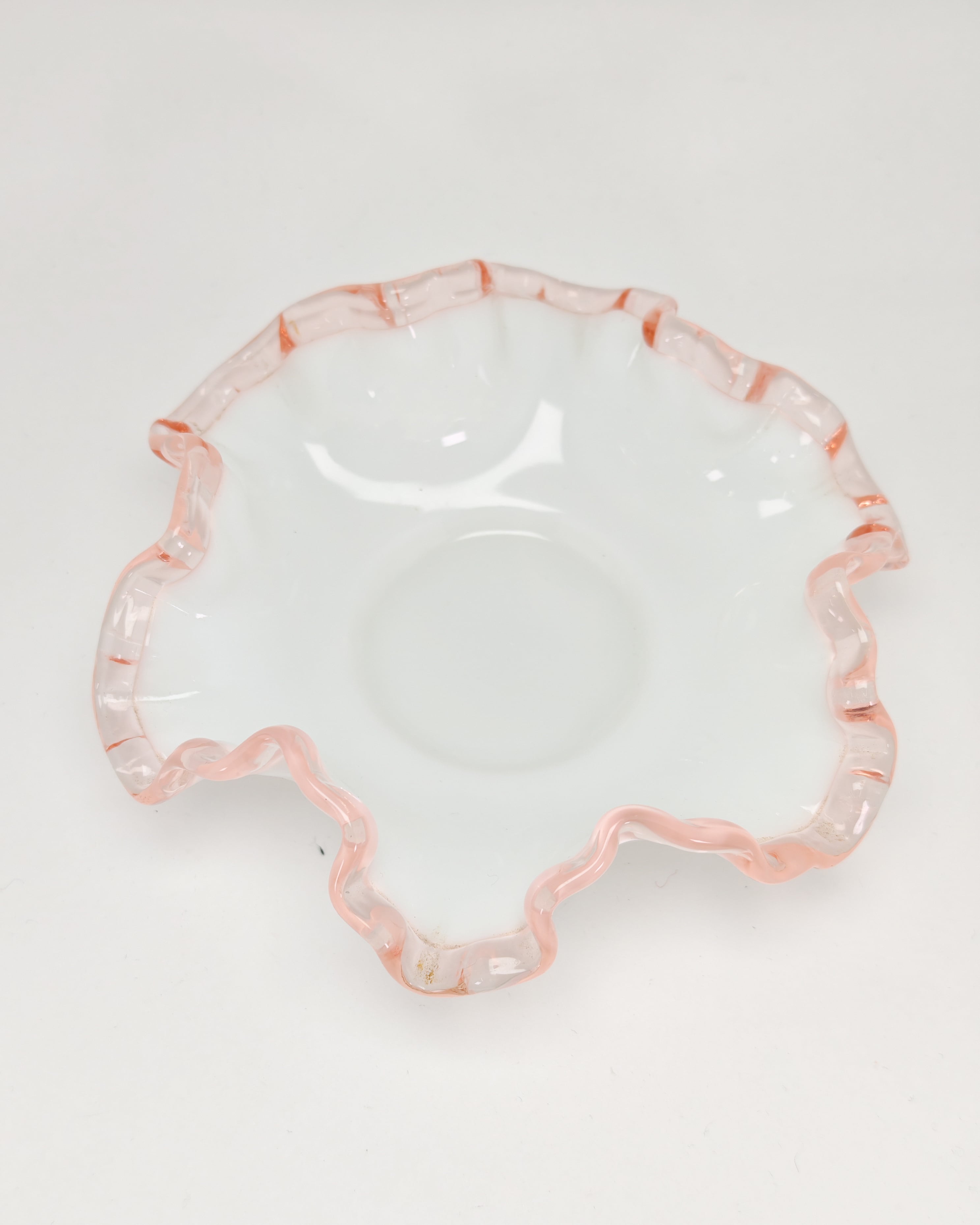 ミルクガラス特有のやさしい乳白色のガラスに、淡いピンクの縁取りが施されたヴィンテージのフリルボウルです。