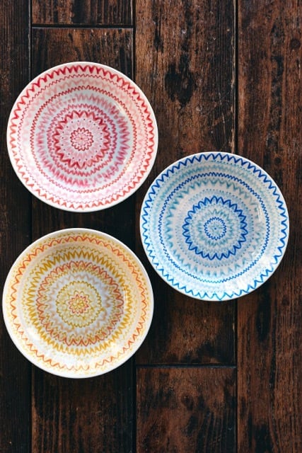 こちらは、赤・青・黄の3色展開で展開されるハンドペイント風の幾何学模様プレートです。中央から広がる放射状のジグザグ模様は、それぞれの色ごとに異なる配色バランスで構成されており、1点ずつ異なる個性を持っています。現代的なカラーパターンでありながら、どこかノスタルジックな雰囲気も感じられ、昭和レトロやエスニック、ボヘミアンな空間にも相性のよいデザインです。