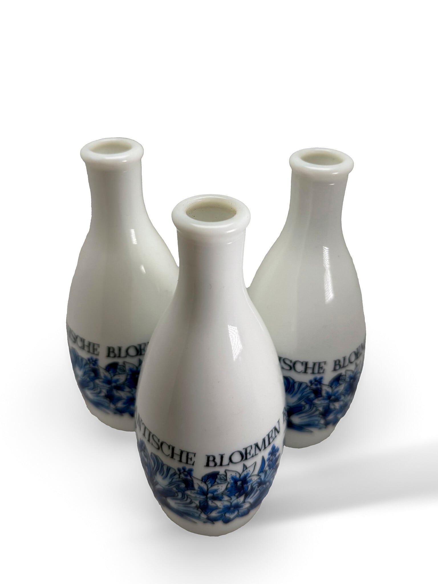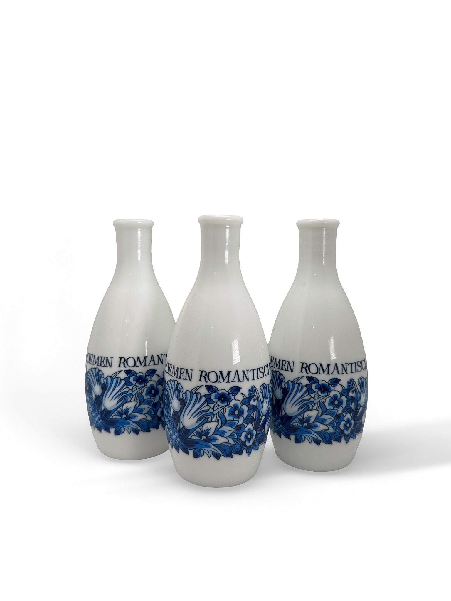 乳白色のミルクガラスに、ブルーの花柄モチーフと「ROMANTISCHE BLOEMEN」の文字があしらわれた、一輪挿し3点セットです。
