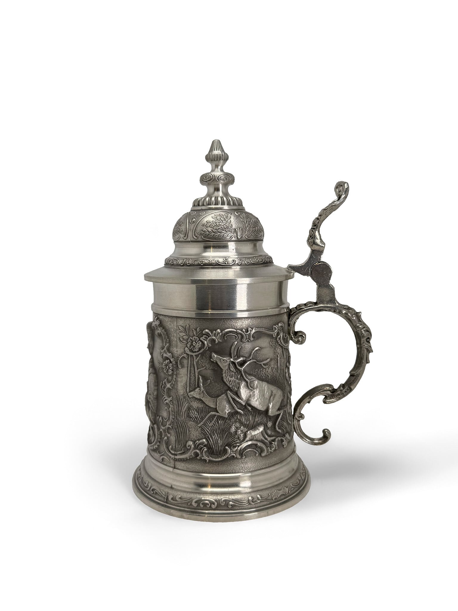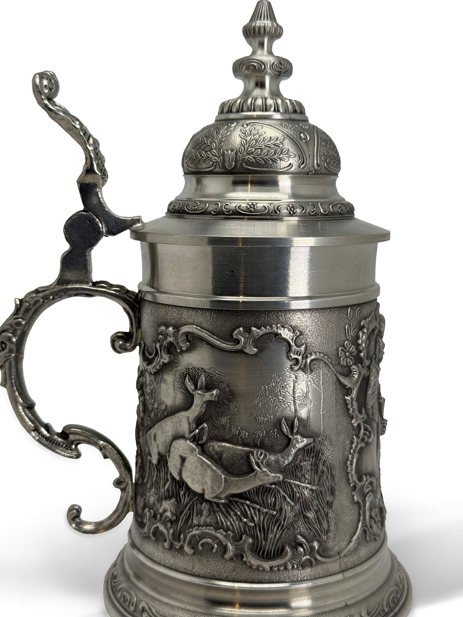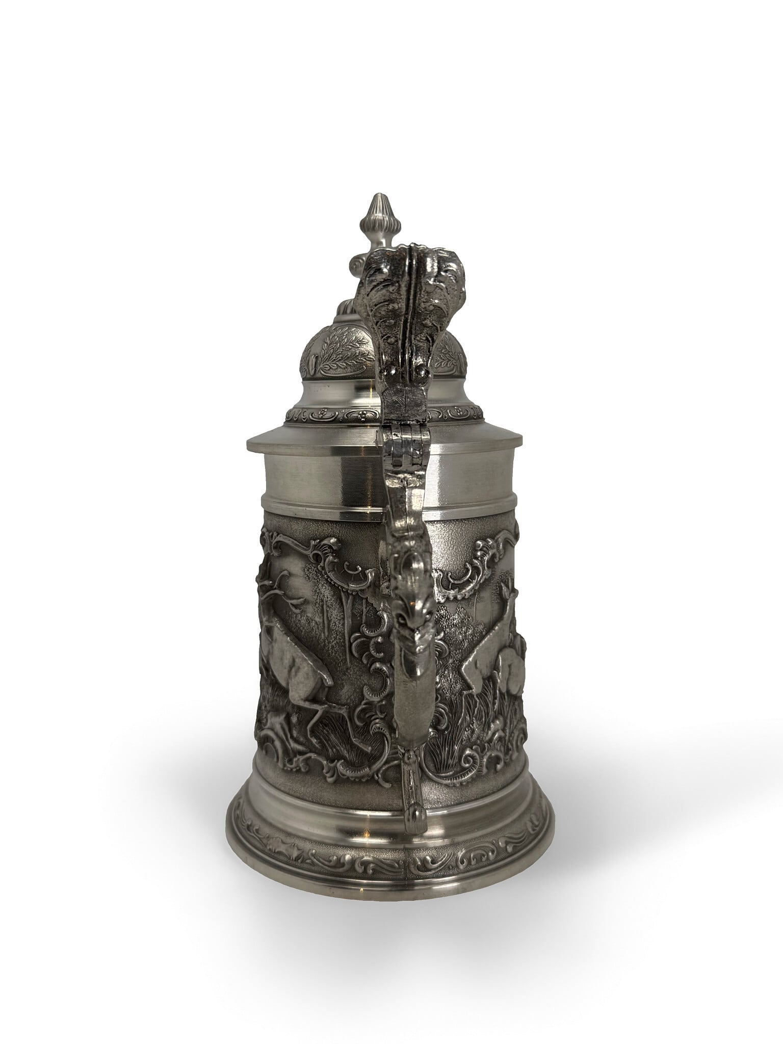 本体全体には、鹿や狩人、草花などをモチーフにしたハンティングシーンの立体レリーフが施されており、ドイツの伝統的なビアジョッキらしい重厚で装飾性の高いデザインが特徴です。