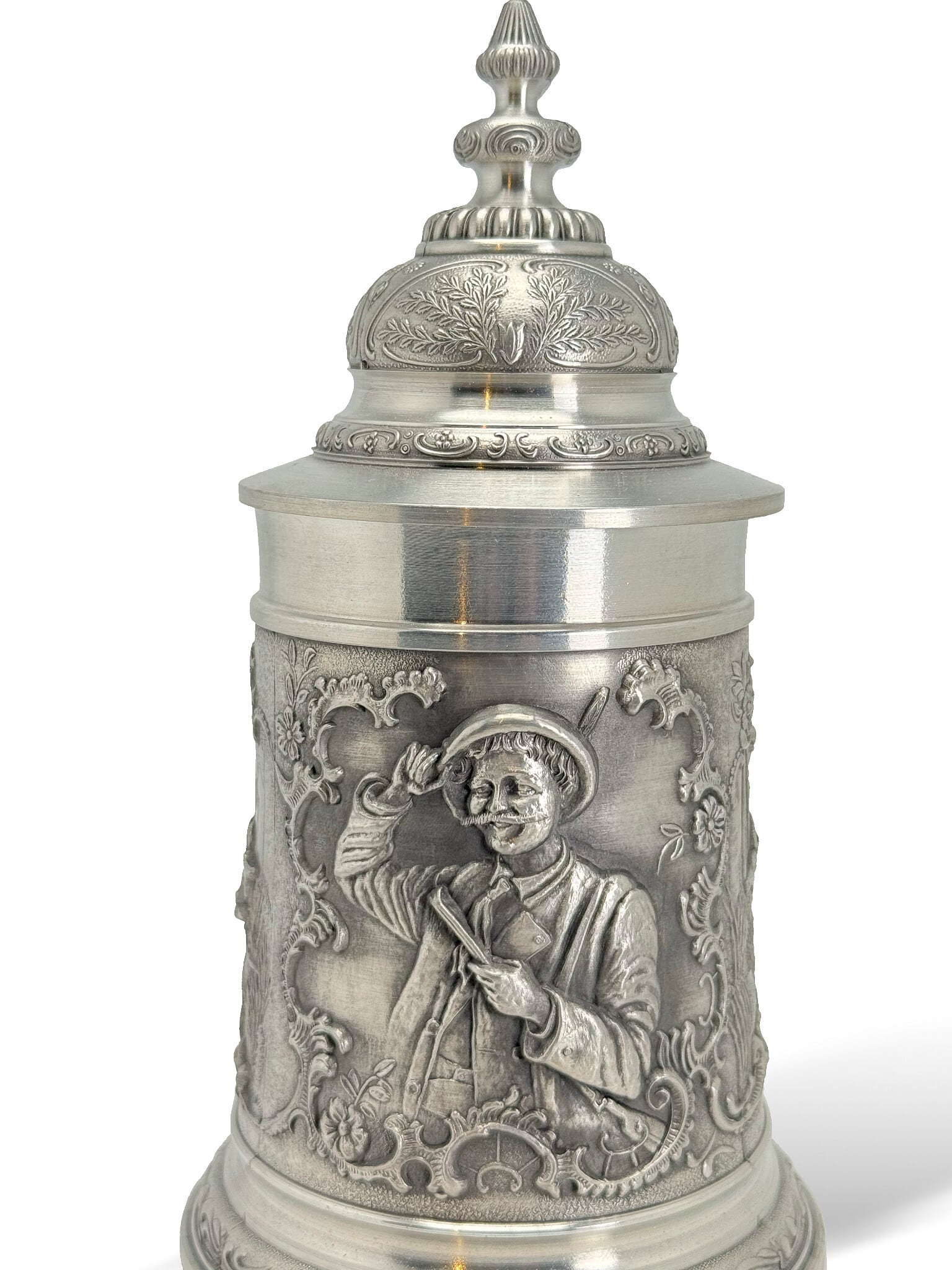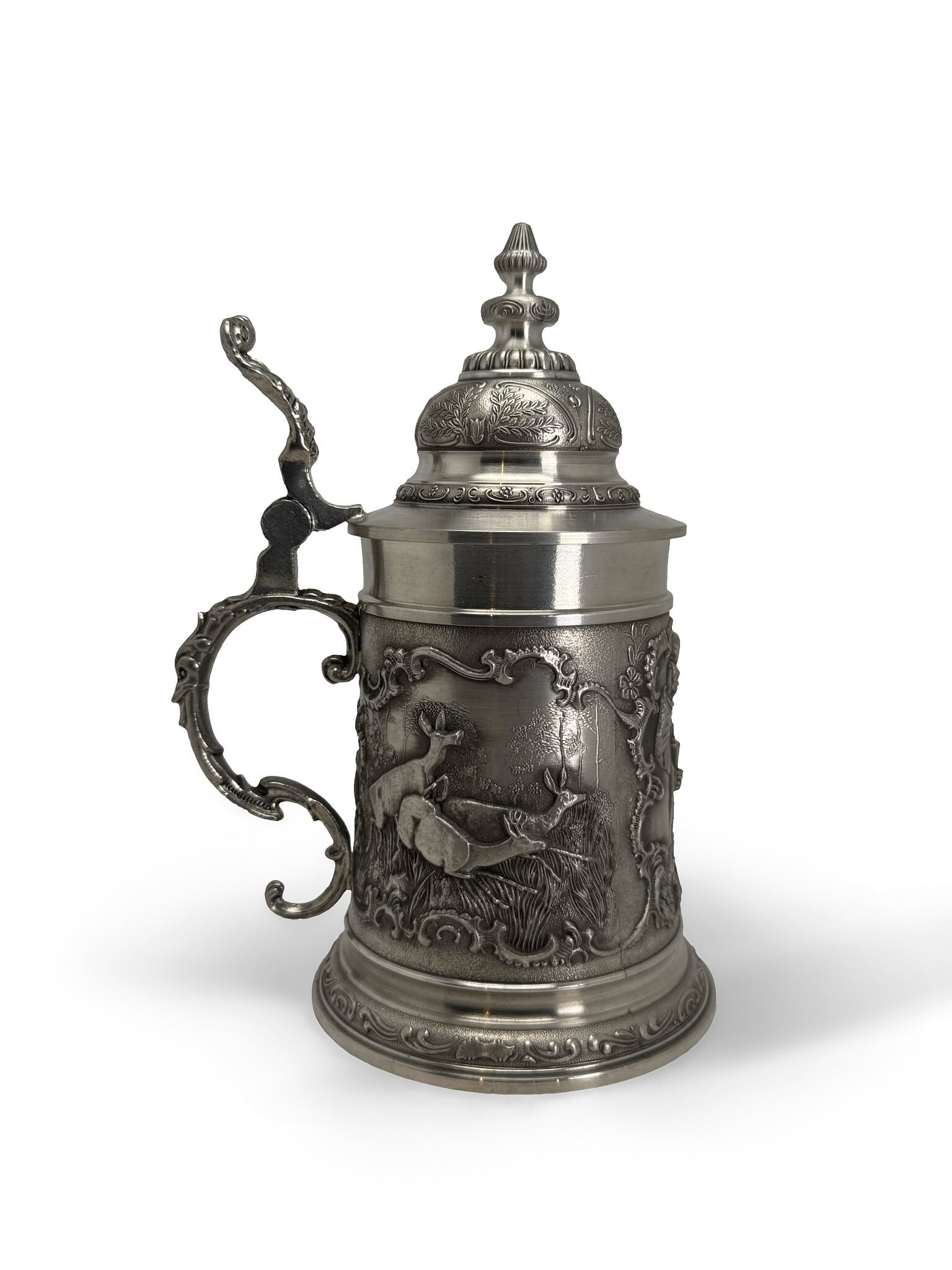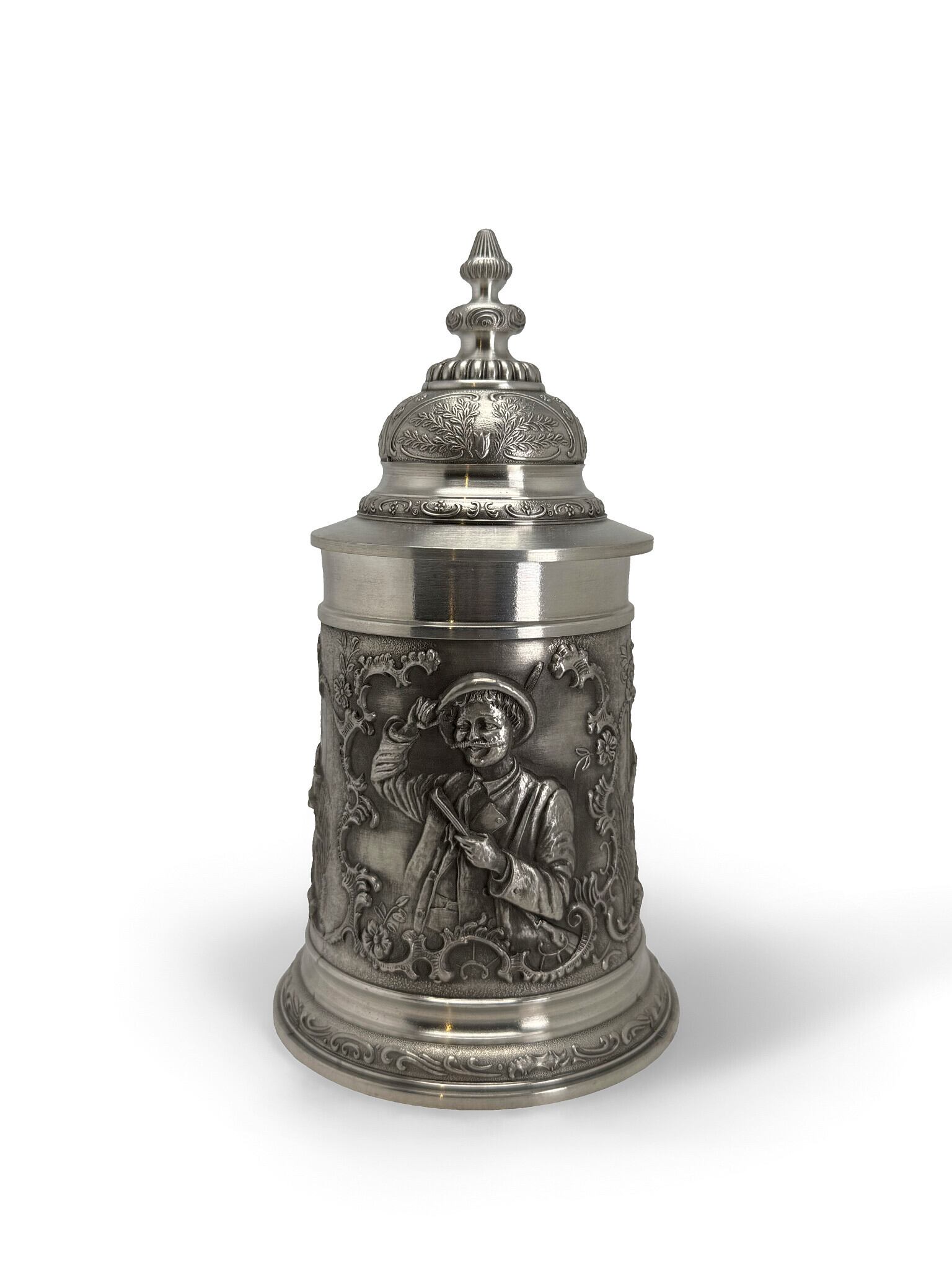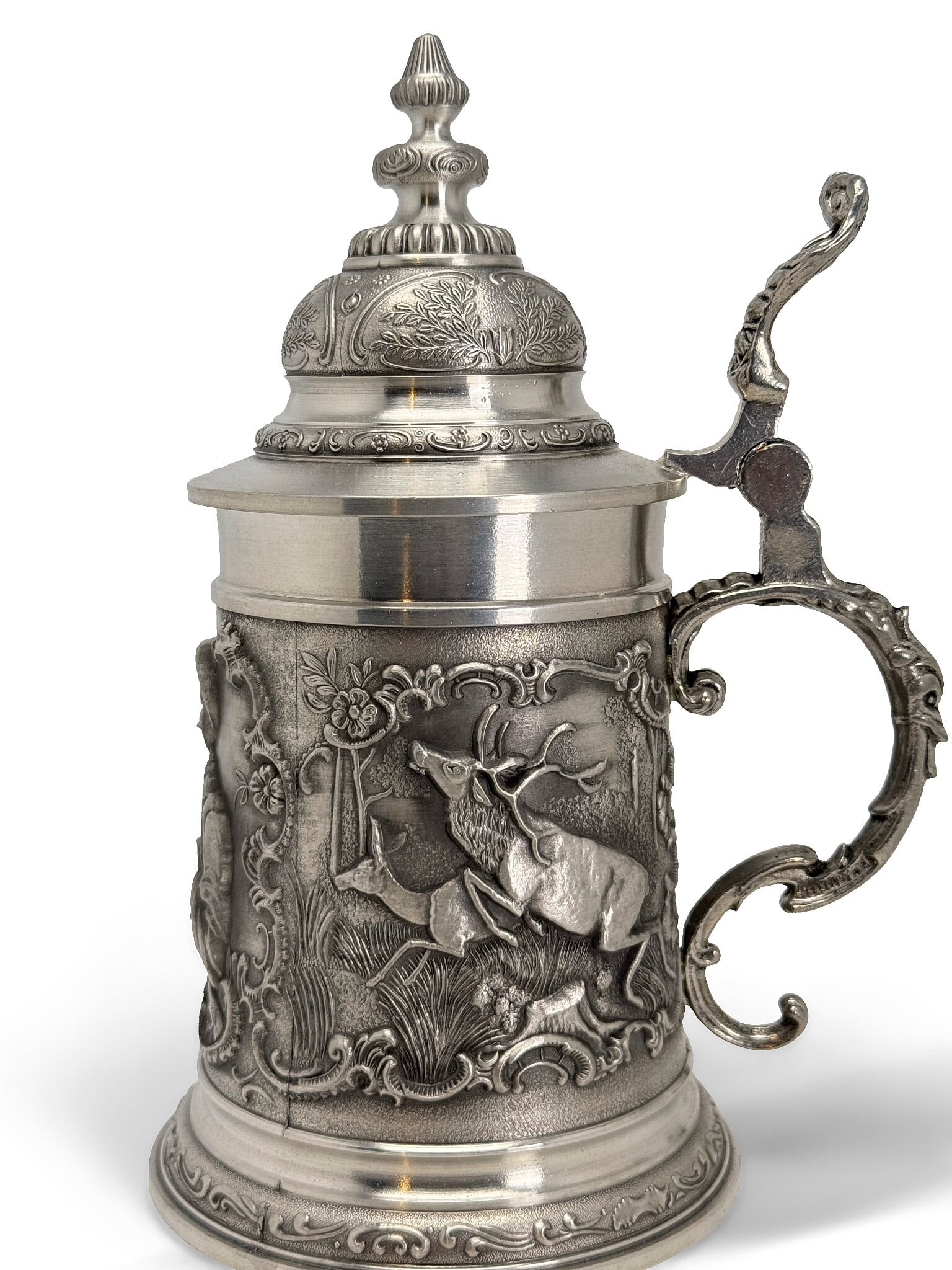本体全体には、鹿や狩人、草花などをモチーフにしたハンティングシーンの立体レリーフが施されており、ドイツの伝統的なビアジョッキらしい重厚で装飾性の高いデザインが特徴です。