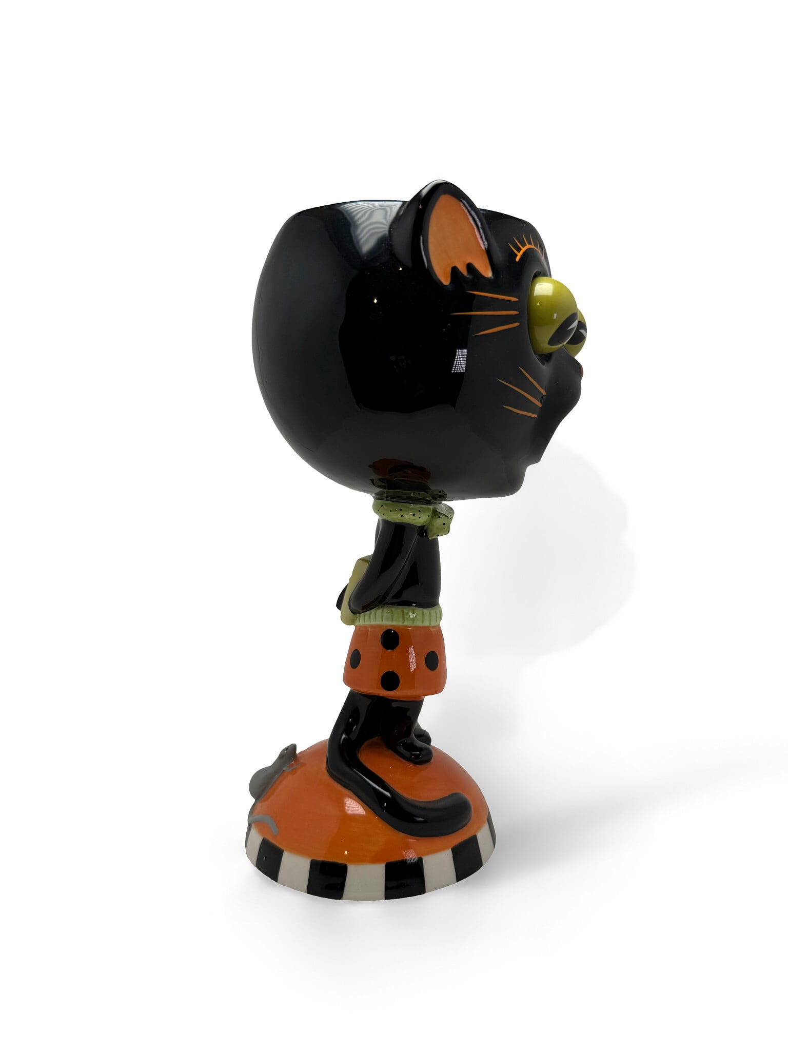 大きな黒猫の顔がカップ部分になったユーモラスな造形で、オレンジ×ブラックを基調としたハロウィンらしい配色が特徴。足元にはネズミの立体モチーフがあしらわれ、90’s USA雑貨ならではのポップでコミカルな世界観が表現されています。