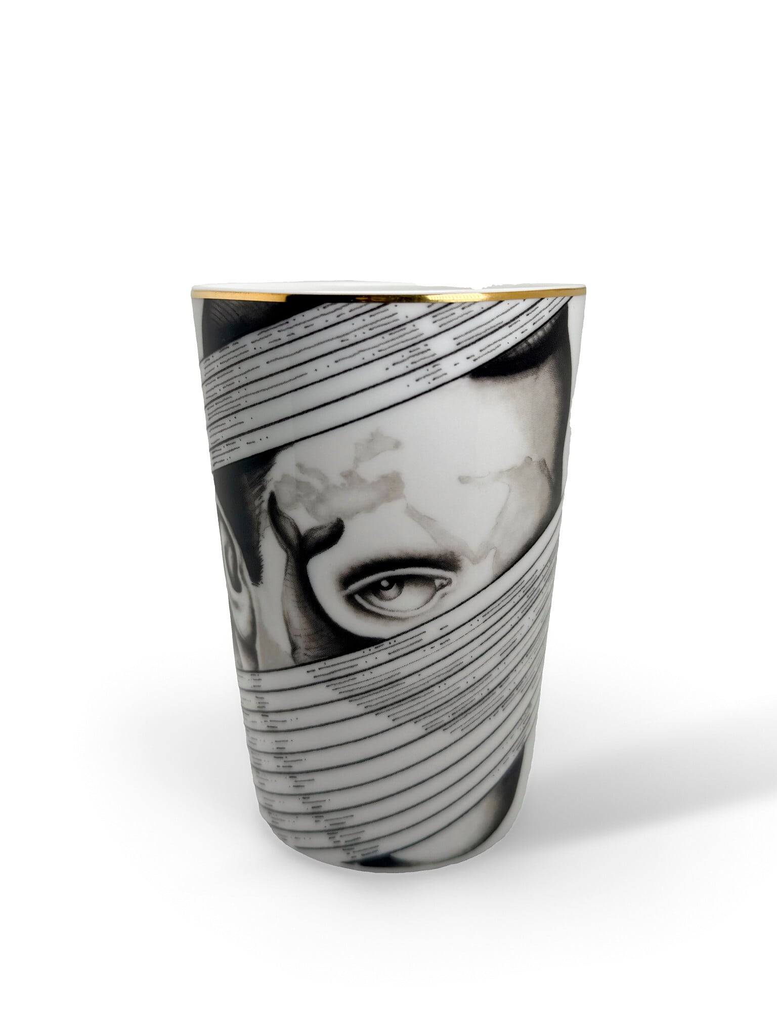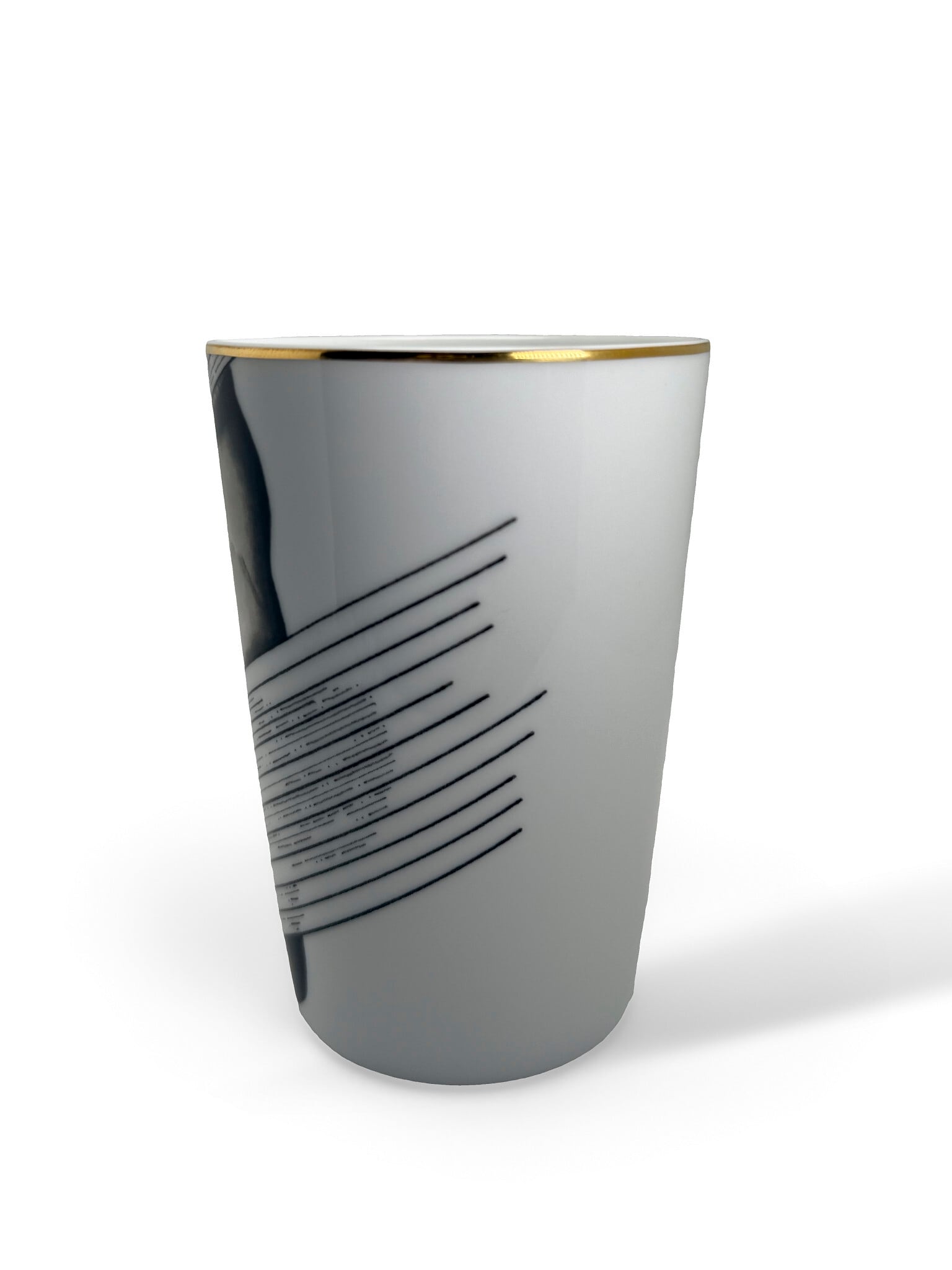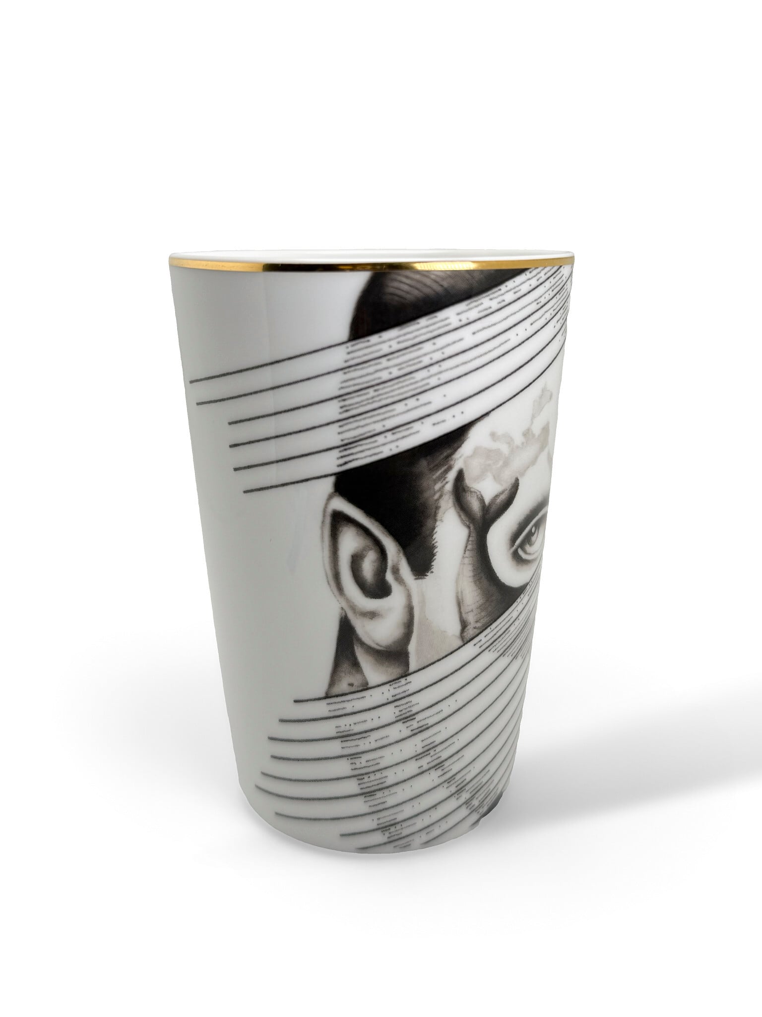 モノトーンを基調とした人物の肖像と、流れるような線描が組み合わされたデザインが印象的で、現代アートと陶磁器が融合したような存在感があります。