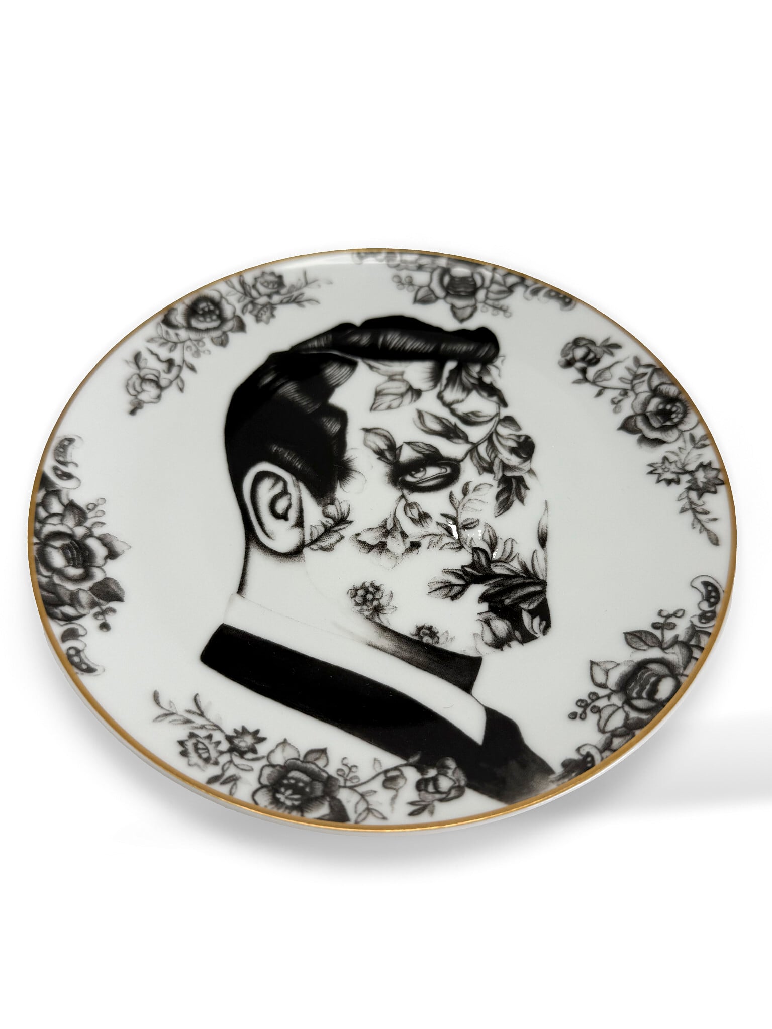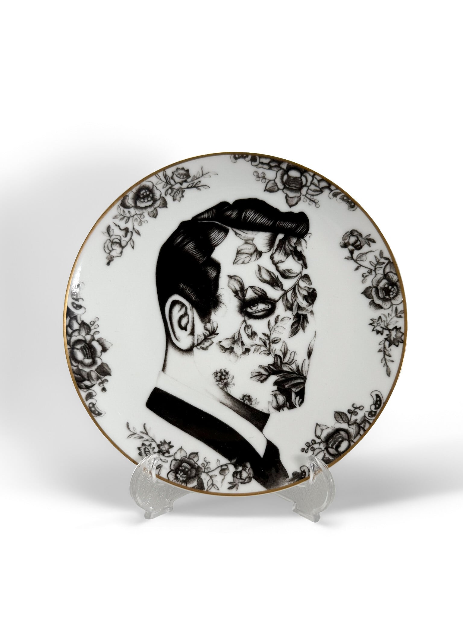 男性の横顔をモチーフに、顔の輪郭と重なるように繊細なフローラルパターンが描かれた印象的なデザイン。