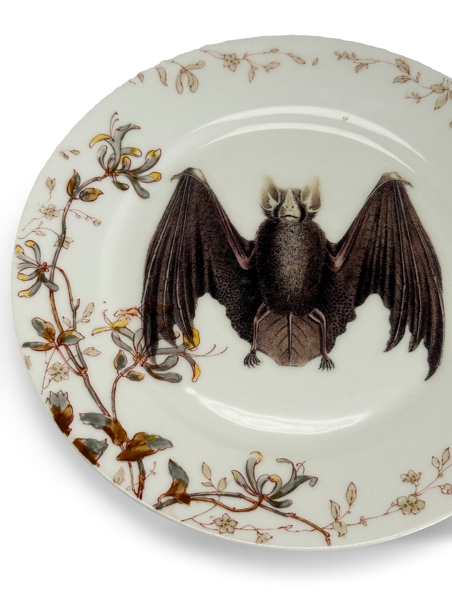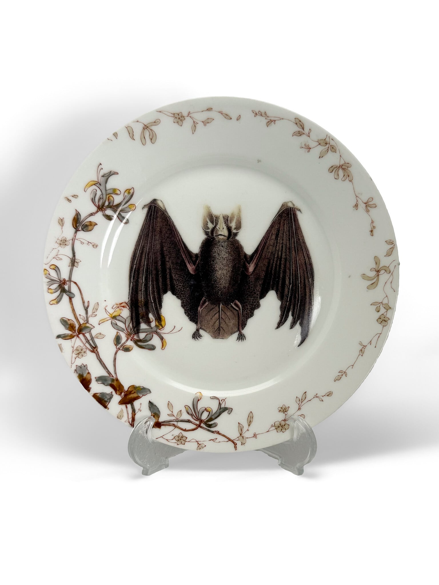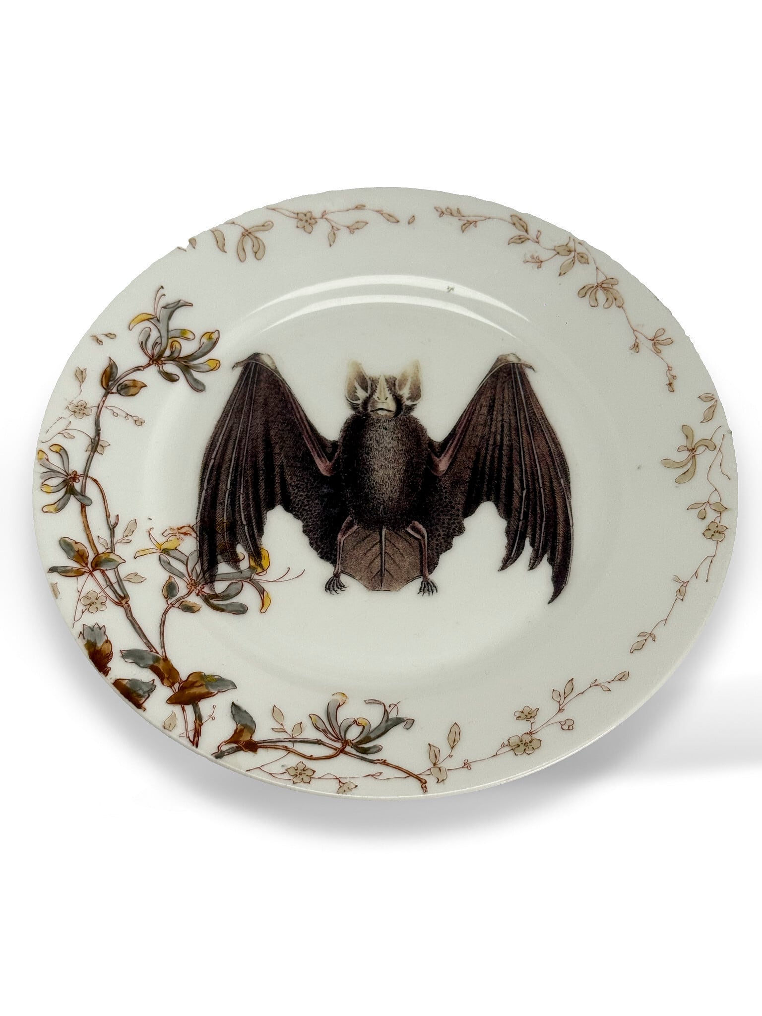 その優雅なアンティークプレートの中央に、大胆なコウモリ(bat)モチーフが描かれた、モダンアートリメイク作品となっています。
