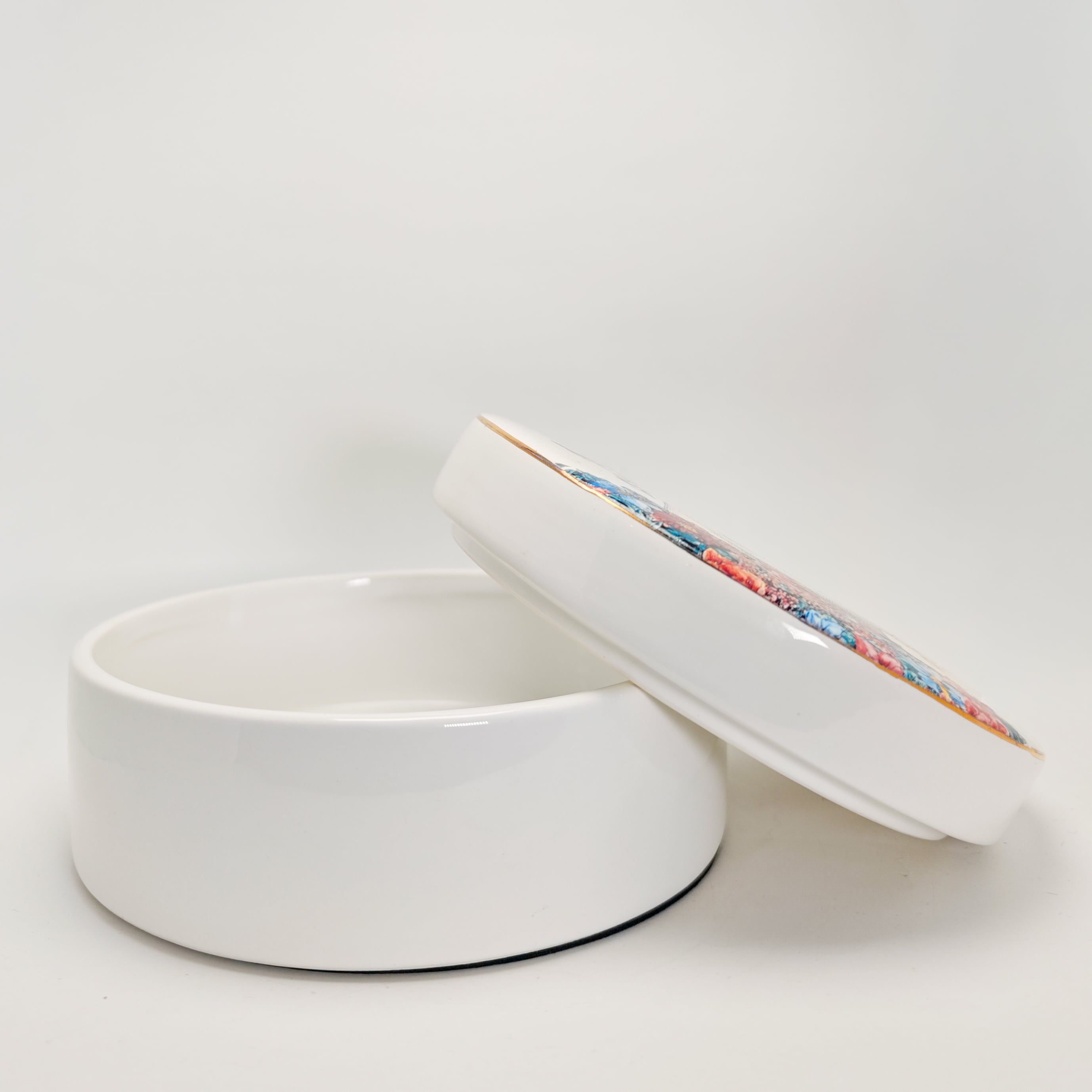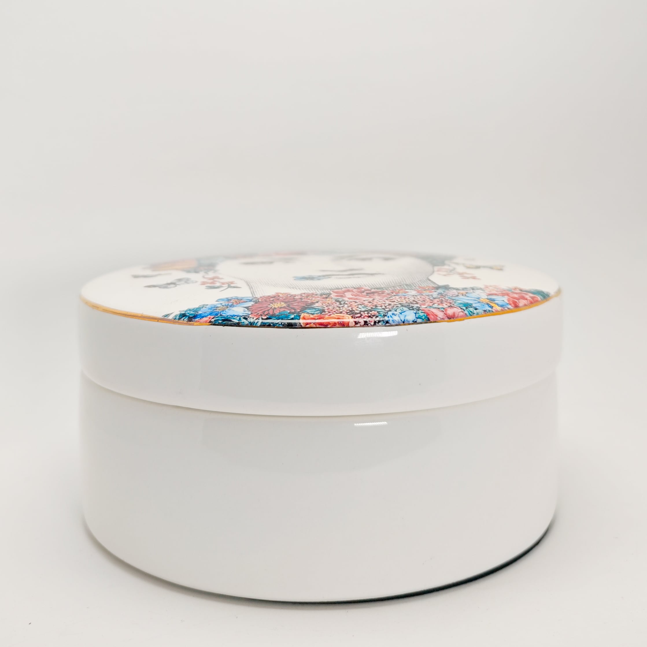 白地を基調とした本体に繊細なプリントが映え、インテリアオブジェとしても存在感のある一点です。