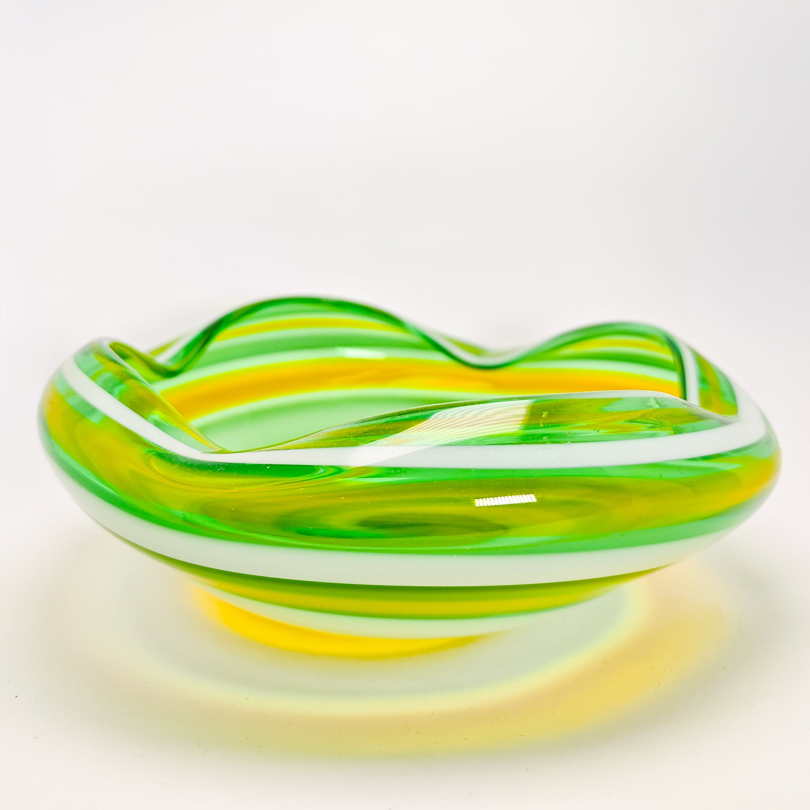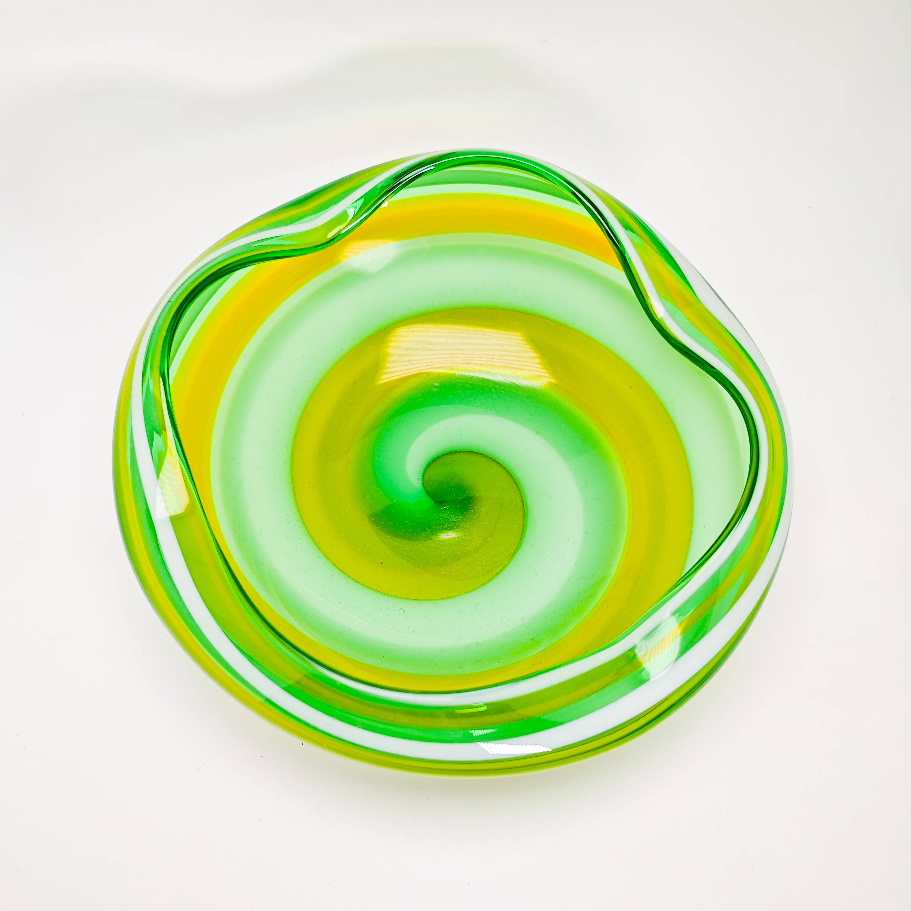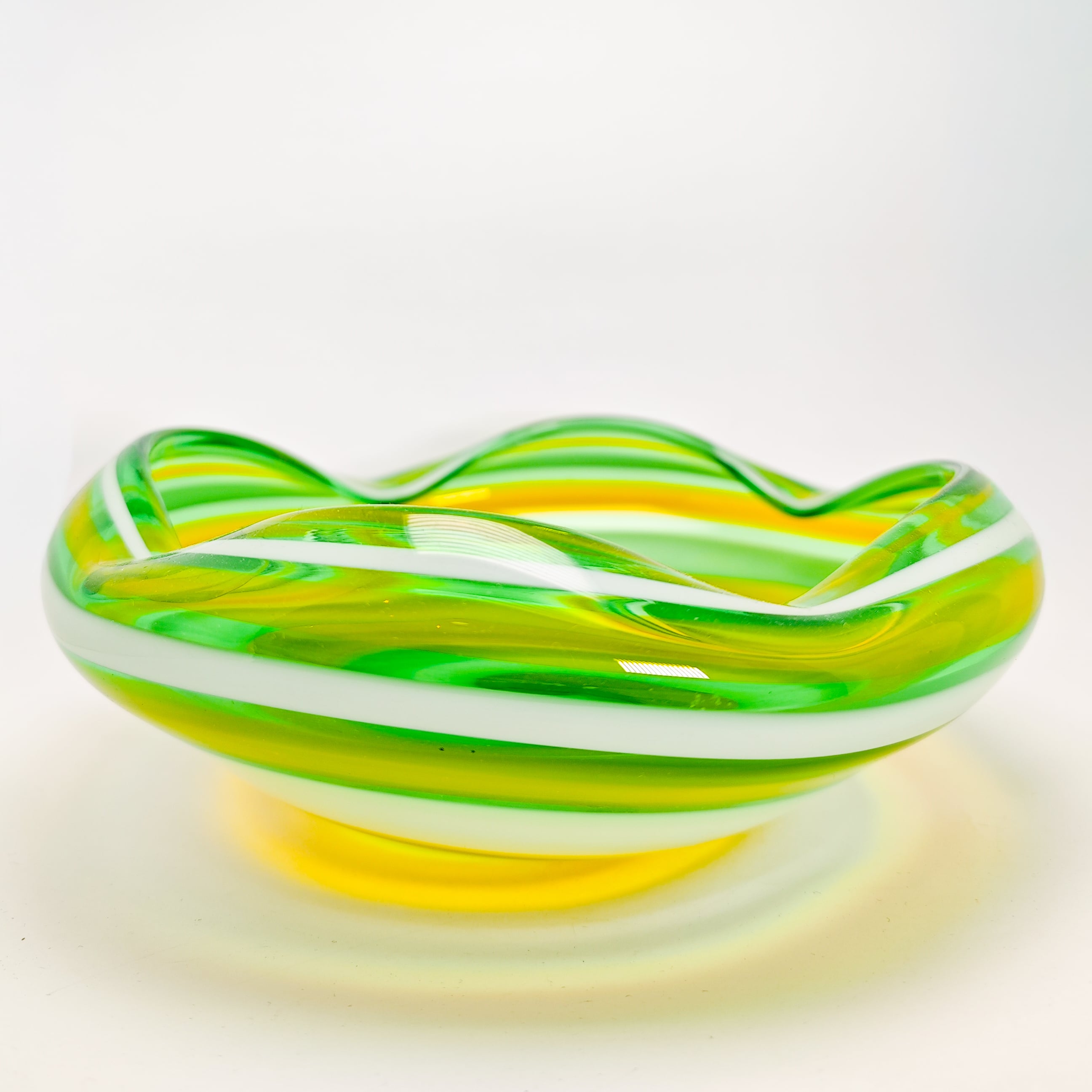 グリーン・イエロー・ホワイトの色ガラスを重ねた、マーブル模様が印象的なガラスボウルです。