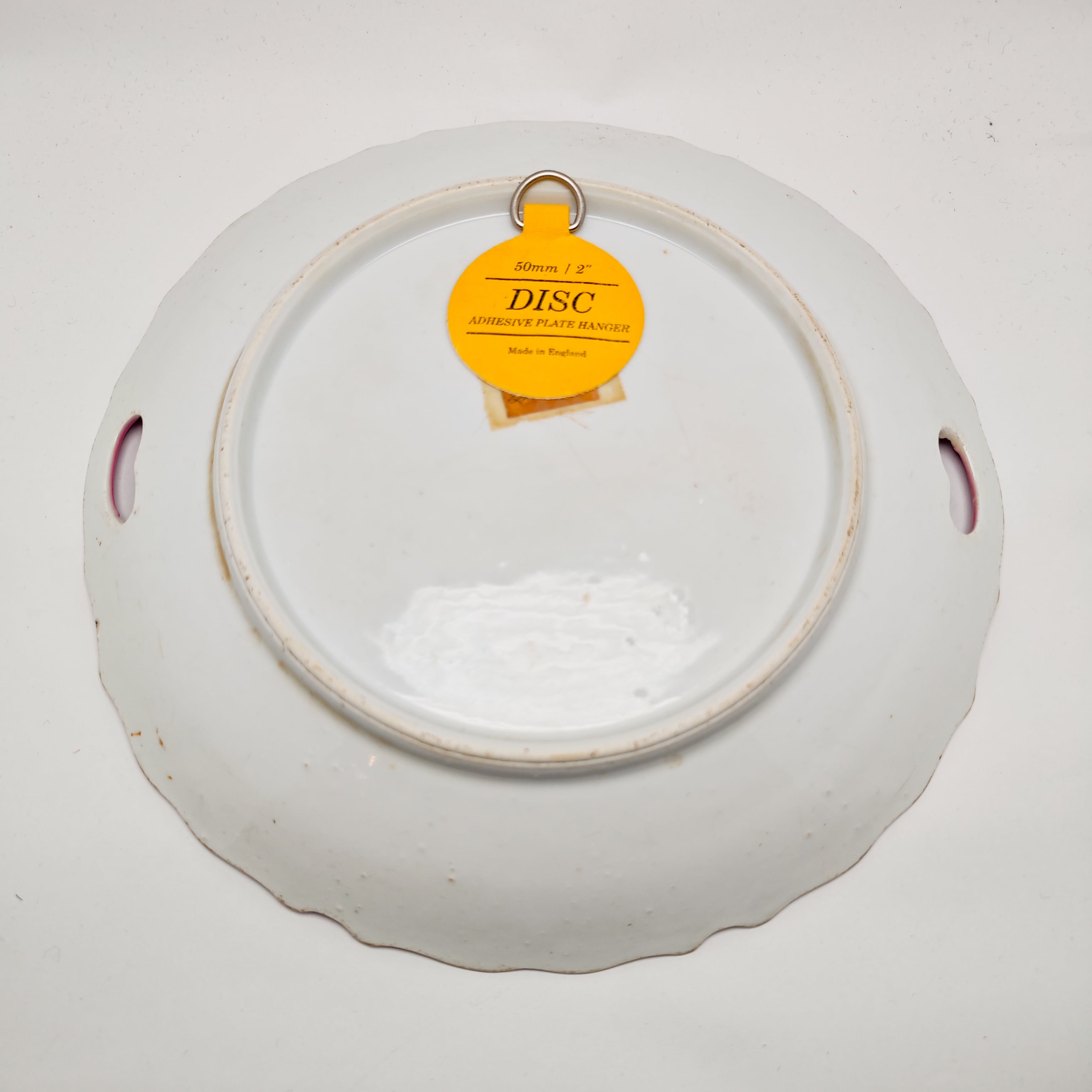 裏面には「DISC ADHESIVE PLATE HANGER(Made in England)」のラベルが貼付されており、ディスプレイ用として使用されていたことが伺えます。