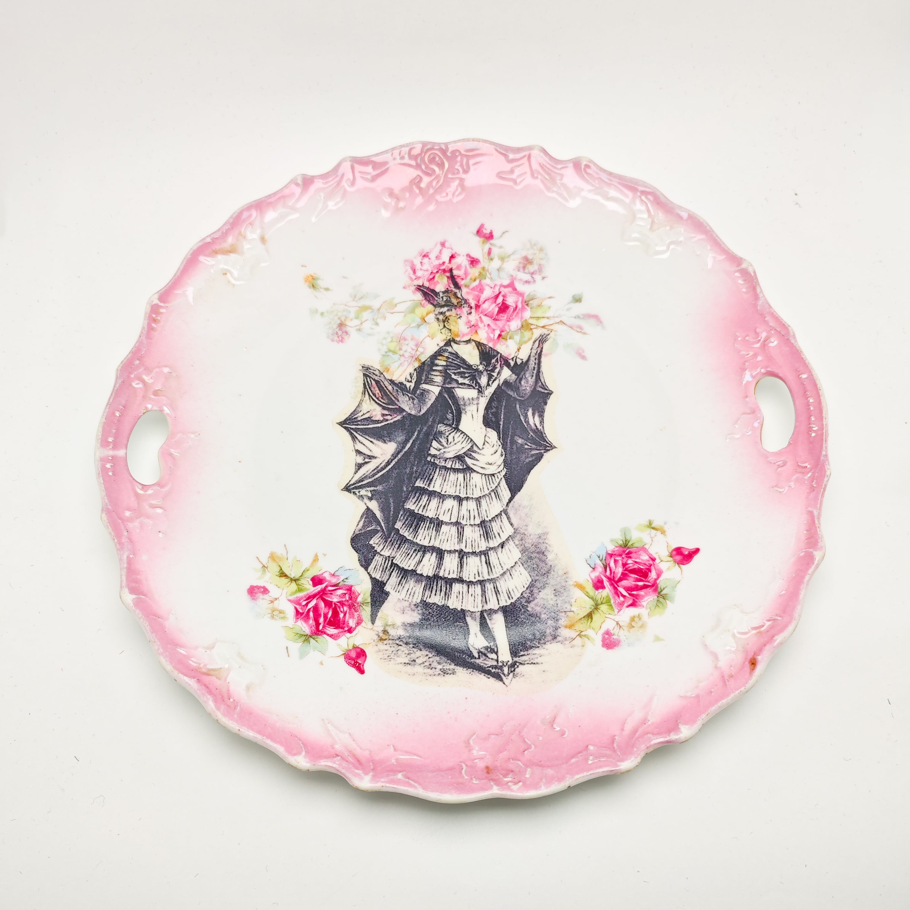 ピンクのグラデーションリムと二穴の持ち手が印象的な、ヴィンテージのデコラティブアートプレート。