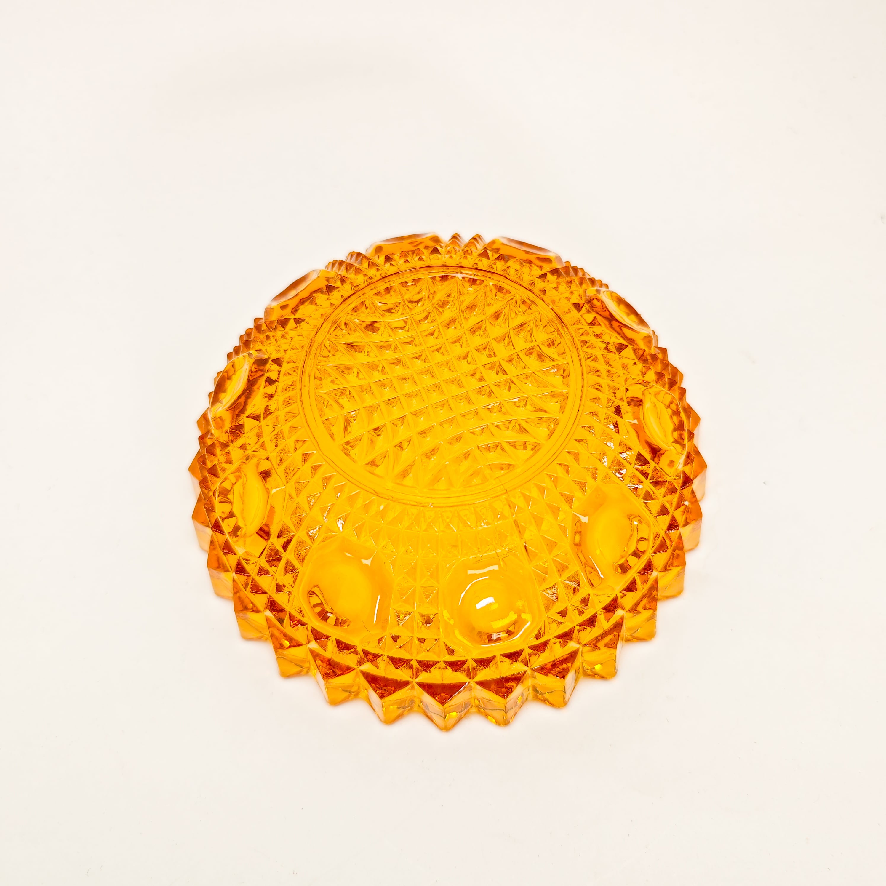 縁に施されたギザギザとしたカッティングと、内側全面に広がる幾何学的なプレス模様が特徴的で、光を受けるとガラス特有の陰影が際立ちます。