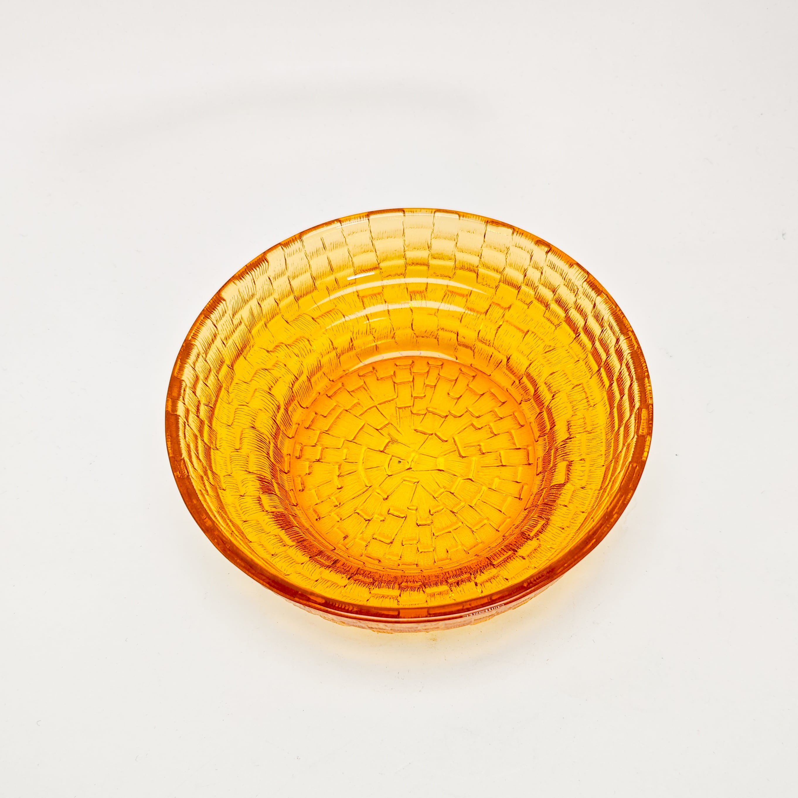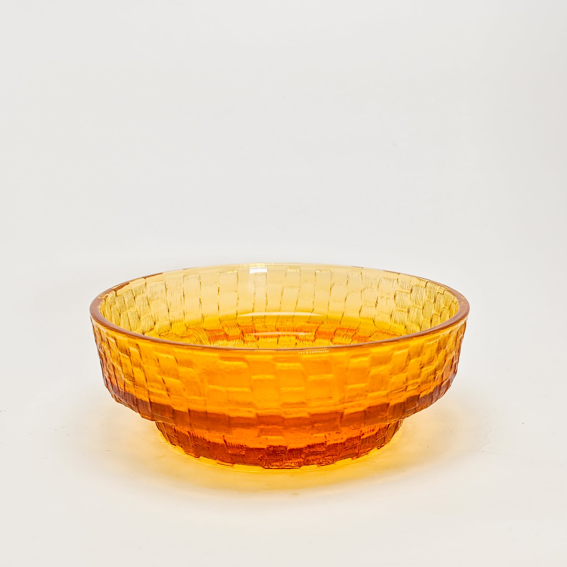 温かみのあるアンバーカラーが魅力のヴィンテージガラスボウルです。全体に施されたブロック状の凹凸デザインが特徴で、見る角度によって表情が変わる存在感のある仕上がりです。サラダやフルーツ、デザート用の器としてはもちろん、キャンディボウルや小物入れとしても活躍します。日常使いにも取り入れやすいサイズ感です。