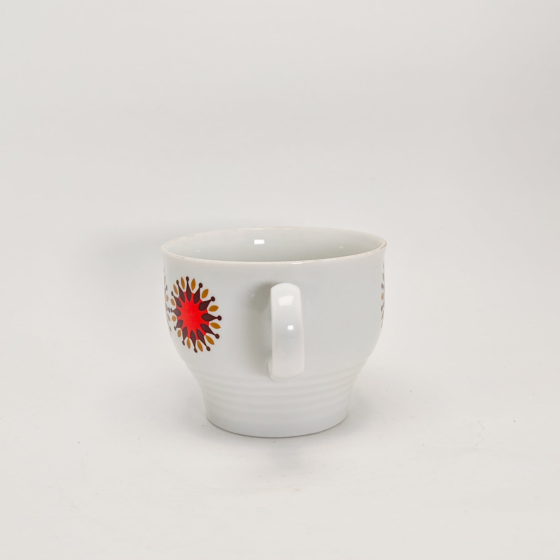 ホワイトボディに、赤を基調とした幾何学的なフラワーモチーフが配されたデザインは、1960〜70年代のミッドセンチュリーテイストを色濃く感じさせます。
