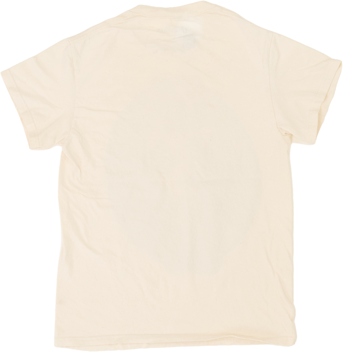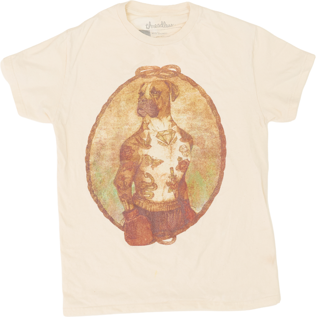 フロントは、タトゥーをまとったボクサー犬をリボン付きの楕円フレームに収めた、アンティーク肖像画×タトゥーカルチャーのミックスグラフィック。発色は経年で柔らかくフェードしており、雰囲気重視で着たい一枚です。バックは無地。ネックはプリントタグ仕様。