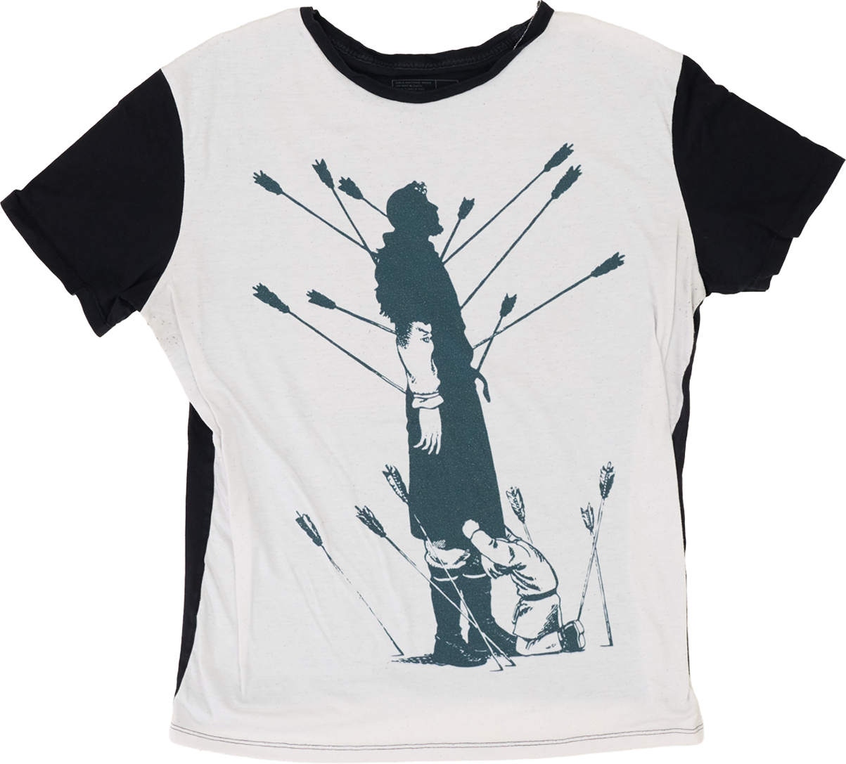 王冠をかぶった人物のシルエットに、背中から多数の矢が突き刺さる寓意的なモチーフが印象的なデザインです。