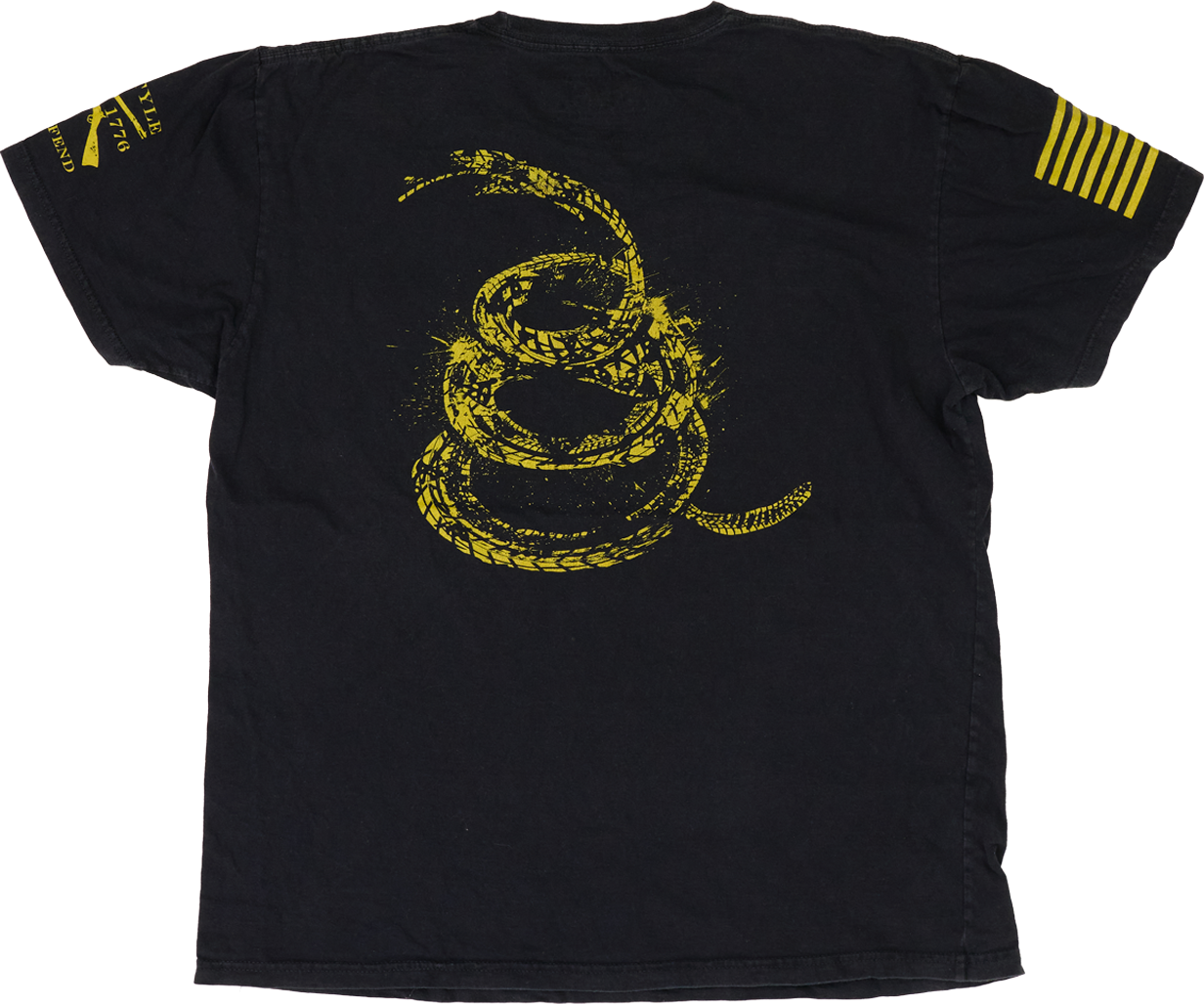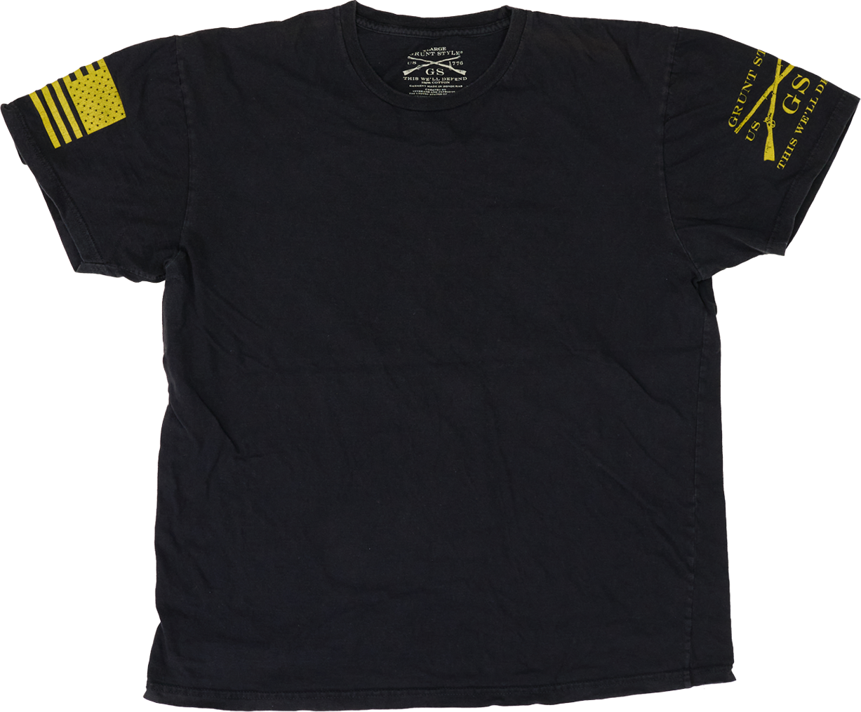 アメリカ発のミリタリー/パトリオット系アパレル「Grunt Style」のグラフィックT。両袖に星条旗モチーフとロゴ、背面に大判のコイルドスネーク(ガズデン系)プリントが入る、存在感強めの1枚です。ブラックボディのフェードとイエロープリントのコントラストが良く、ストリートにもミリタリーMIXにもハマります。
