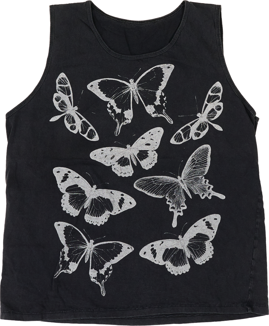 ブラックボディに、標本図鑑のようなタッチで描かれた蝶を全面に配したノースリーブTシャツ。モノトーン配色と繊細な蝶モチーフが印象的で、Y2K・ゴシック・モード寄りのスタイリングにも相性の良い一枚です。