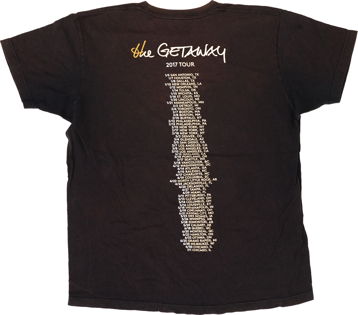 フロントにはアルバムアートを使用したフォトプリント、バックには「The Getaway 2017 TOUR」のロゴとツアーデイトが縦に入る定番のツアーTシャツデザイン。