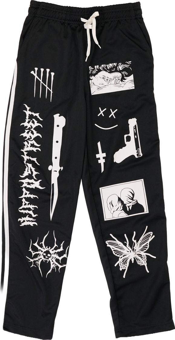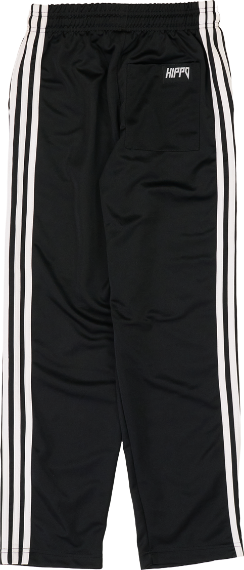 ブラックボディにホワイトのサイドラインを配した、HIPPOのグラフィックトラックパンツ。