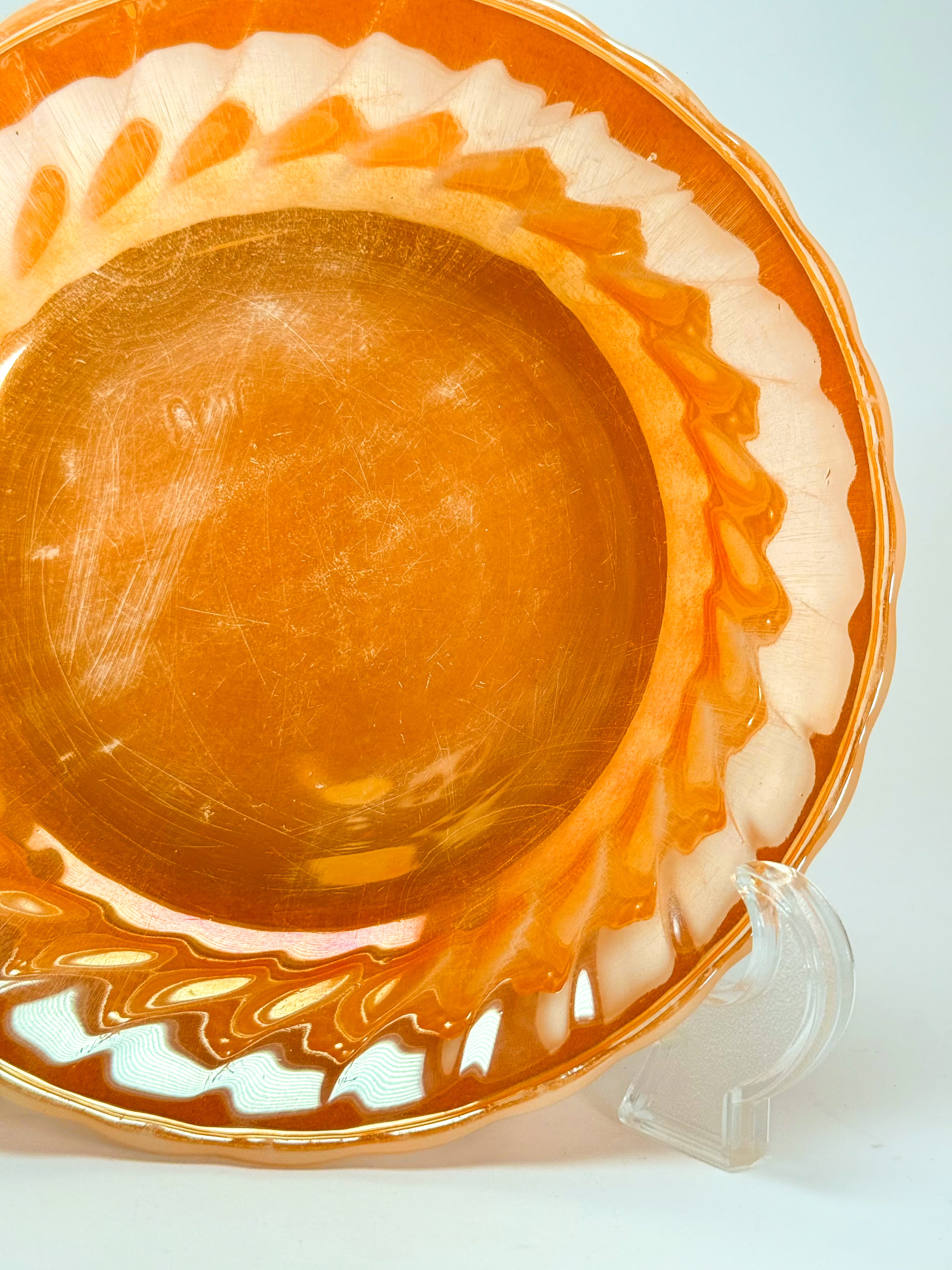 あたたかみのあるピーチ〜アンバー系のラスター(光沢)に、縁周りのミルキーな発色が重なり、角度によって表情が変わるのが魅力。リムはゆるやかな波打ち(スカラップ)形状で、テーブルに置くだけで雰囲気が出ます。