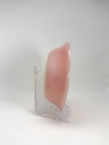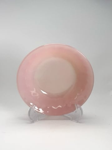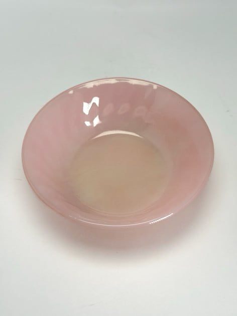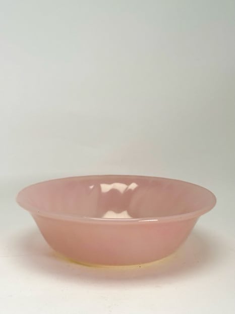 Fire-King(ファイヤーキング)の人気カラー「ピンクスワール」のデザートボウルです。やわらかなパステルピンクに、器の内側へ向かって流れるような“スワール(渦)”のラインが入り、光の当たり方で立体感がきれいに出るのが魅力。