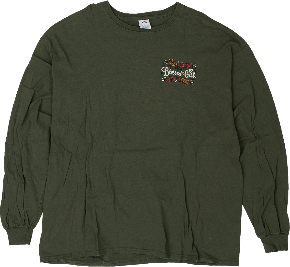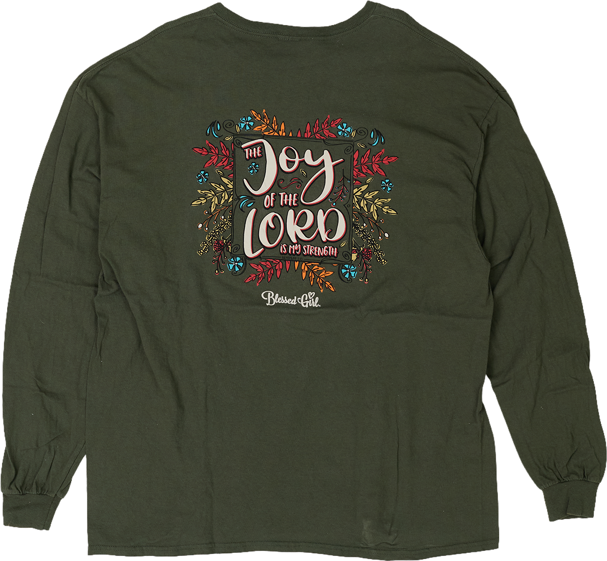 米国のクリスチャン・アパレル「Blessed Girl」による、巨大な2XLのロングスリーブ。 背面に刻まれた「The JOY of the Lord is my strength(主の喜びは私の力)」という聖句は、他者への宣教ではない。
