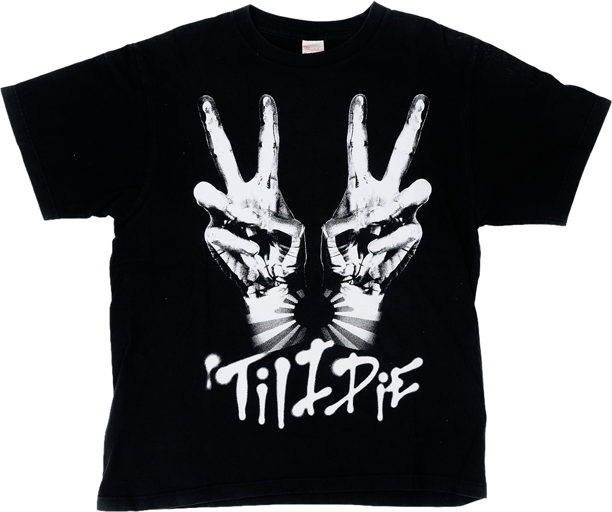スカルハンドのピースサインと「’TIL I DIE」のメッセージが印象的なグラフィックTシャツです。