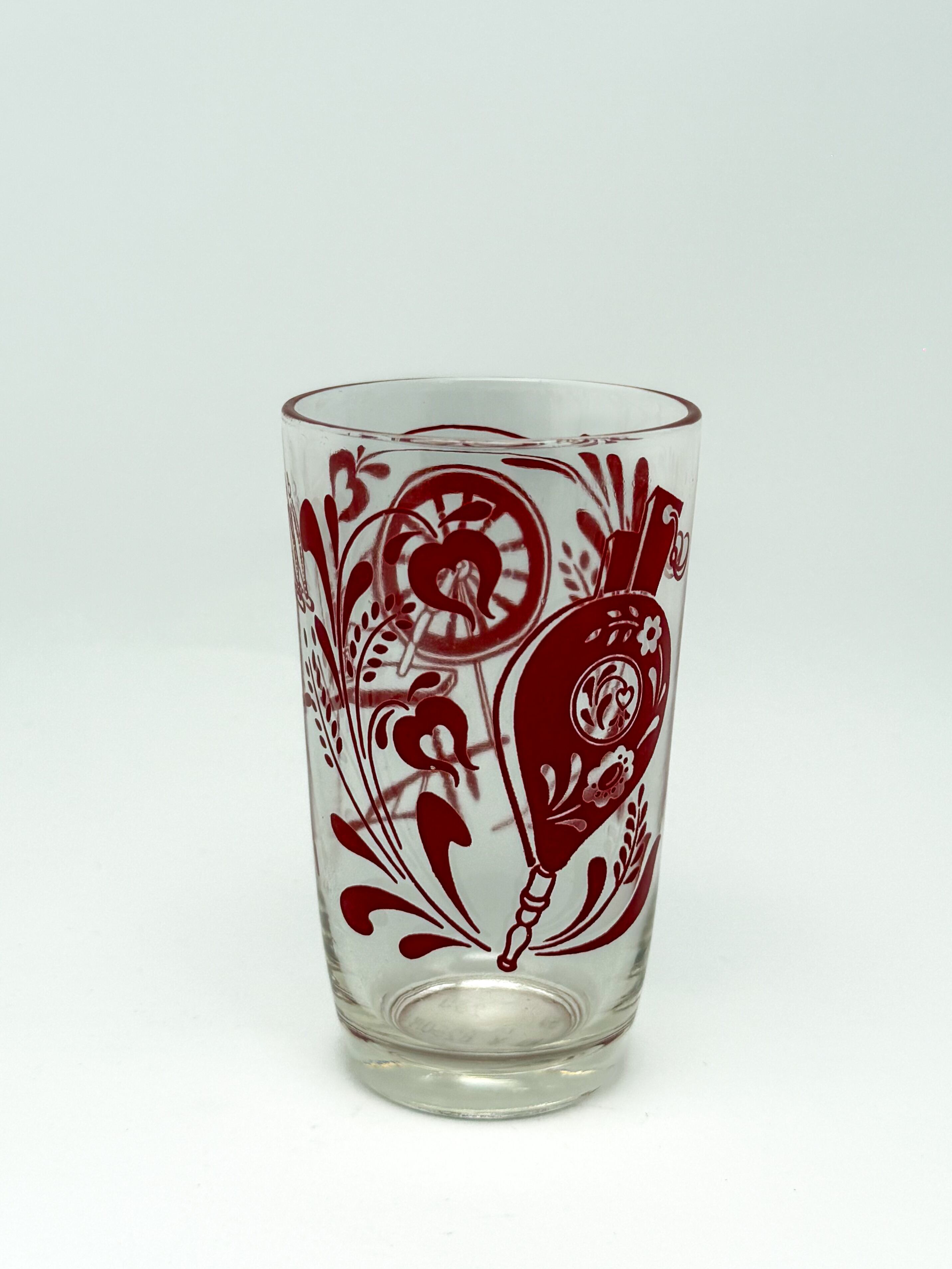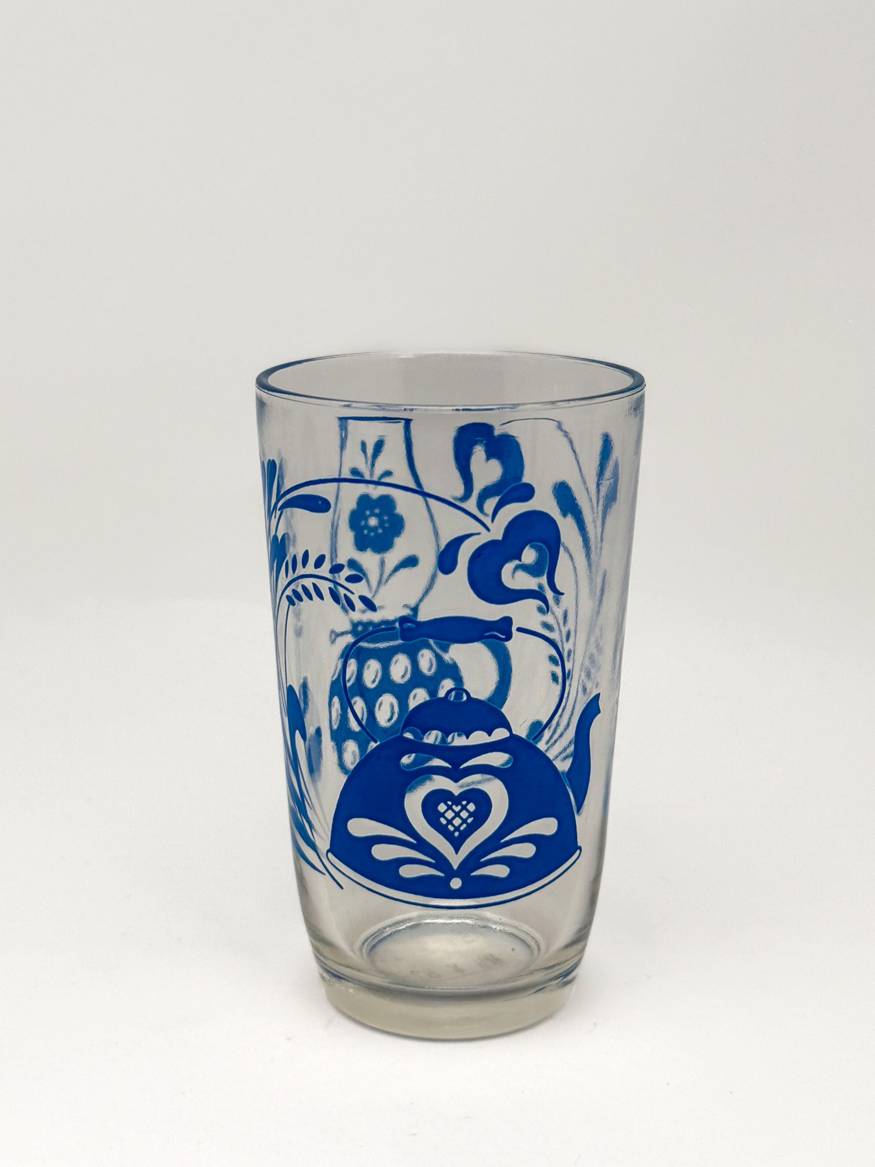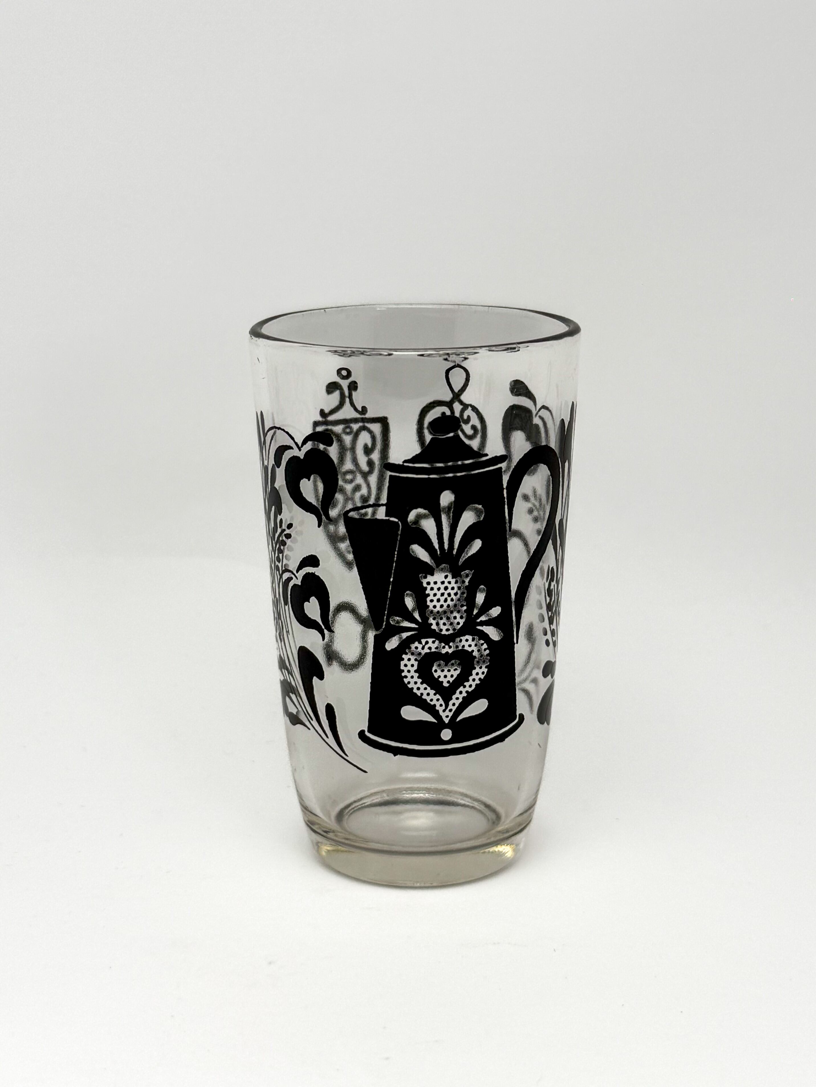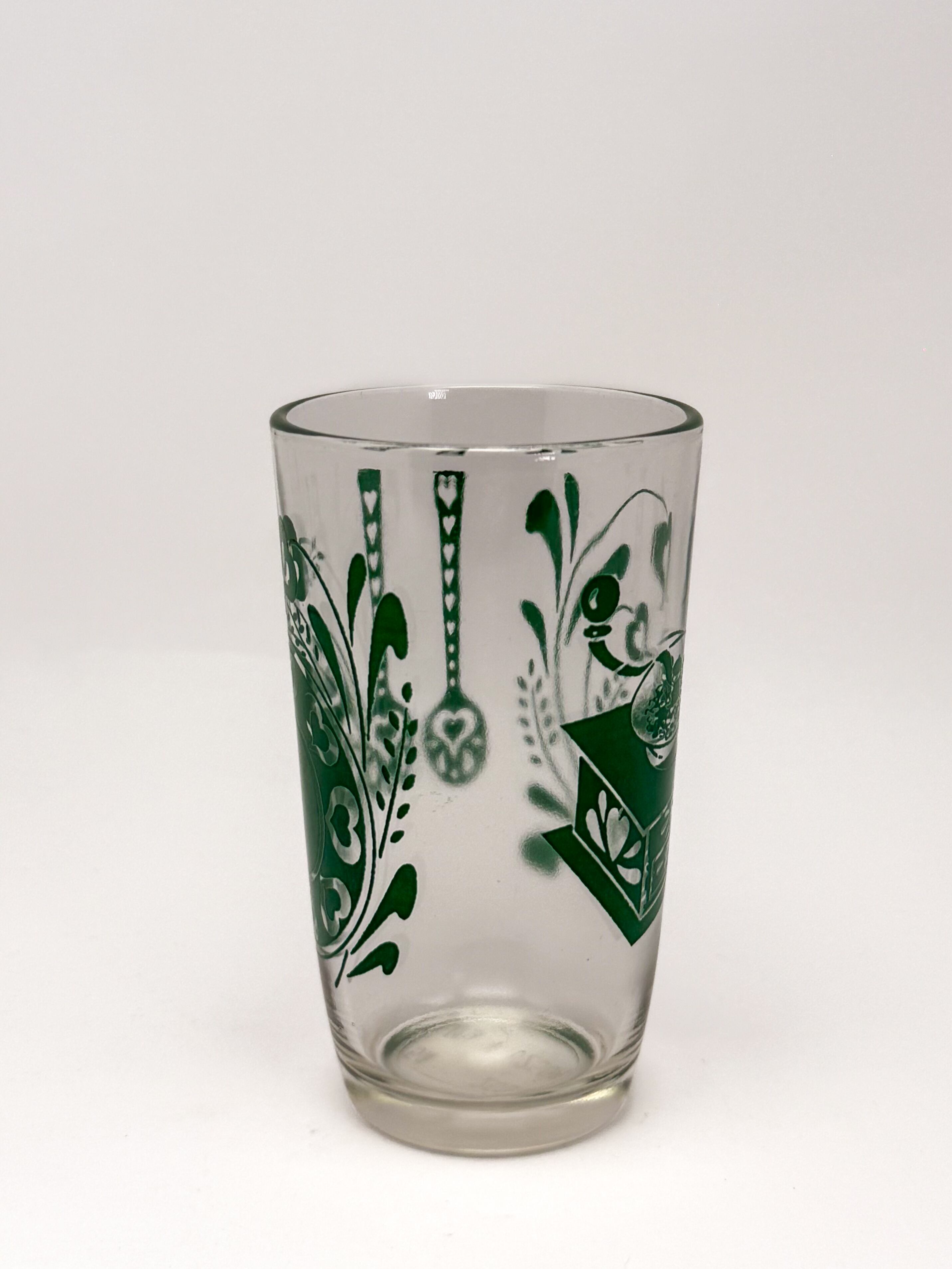 1950年代のアメリカでクラフト社のチーズ容器として親しまれた、多色のキッチンツールが描かれた「スワンキーグラス」の5客セットです。小ぶりで手に馴染む厚手のガラスに施されたデカールは、現存するセットとしての希少性も高く、当時のミッドセンチュリーな色彩を鮮やかに残しています。かつての日常品が放つ「毒のあるポップさ」を食卓へ招くことで、整いすぎた現代の暮らしに小気味よい違和感と自由なリズムをもたらします。