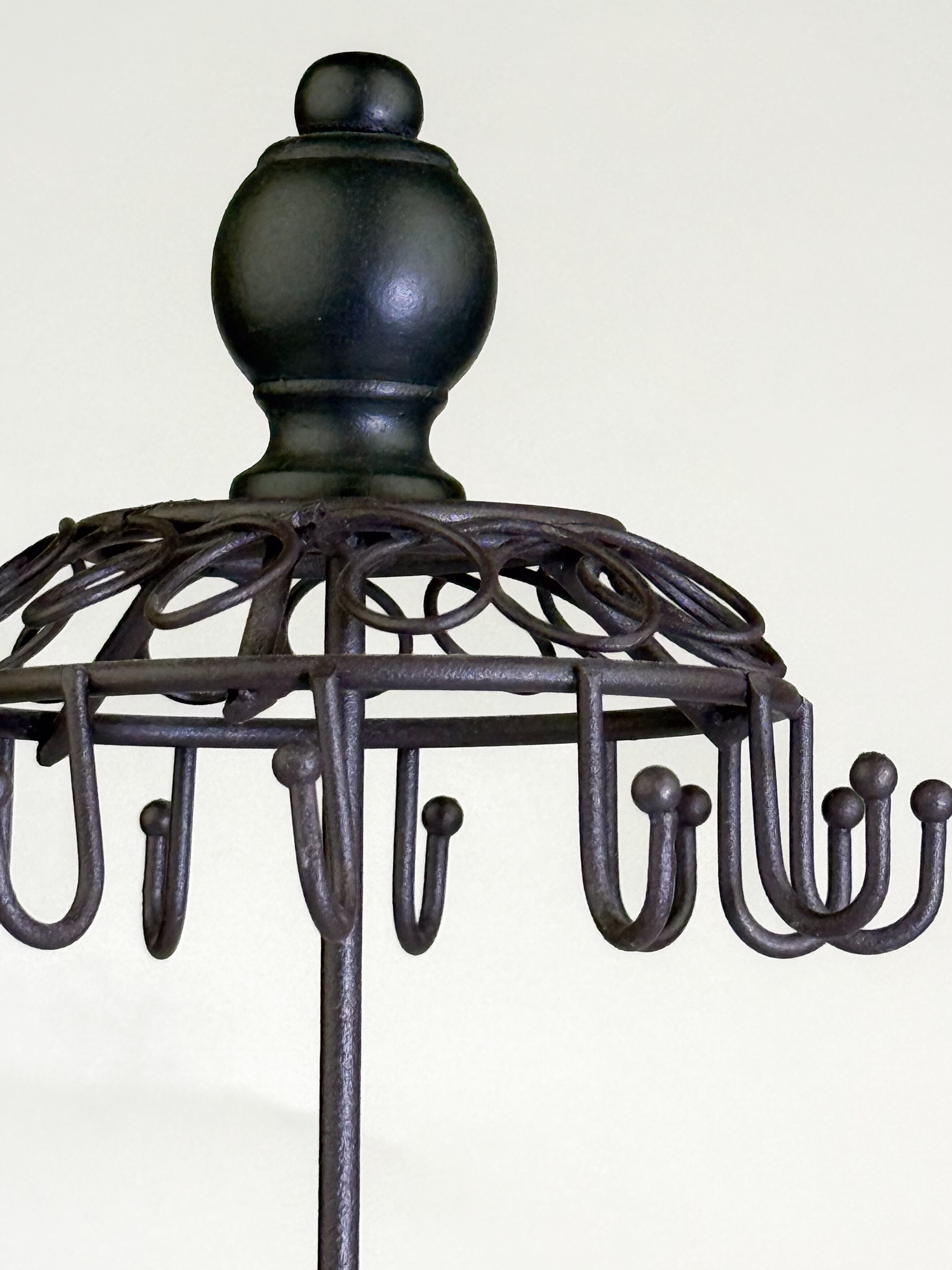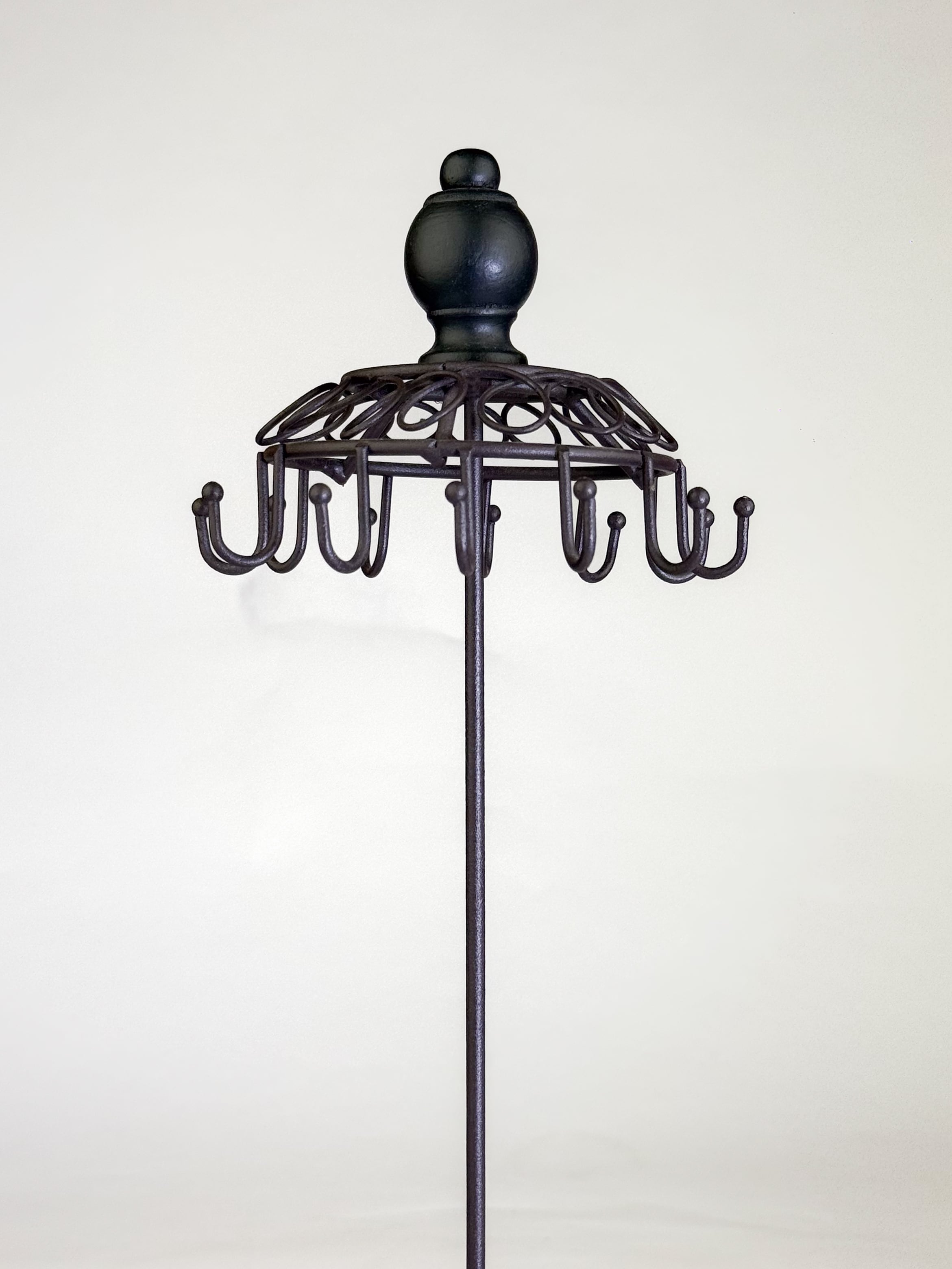 重厚なアイアンの支柱から傘状に広がるフックと、装飾的なスクロール脚が目を引くアンティーク調のアクセサリースタンドです。