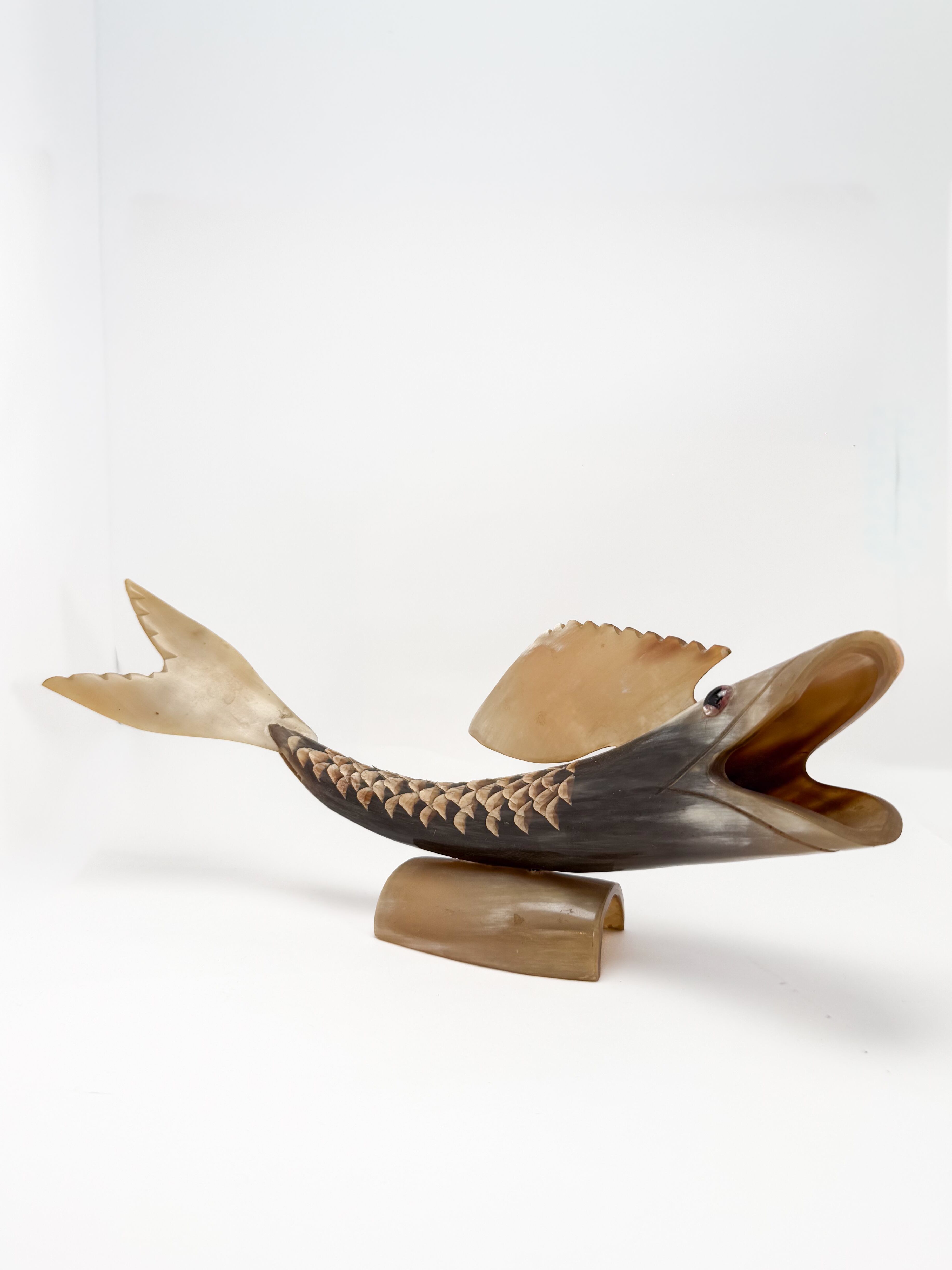 大きく口を開き深海を泳ぐ魚の姿を、天然の牛角が持つ琥珀色から漆黒へのグラデーションを活かして彫り上げた一点物のオブジェです。