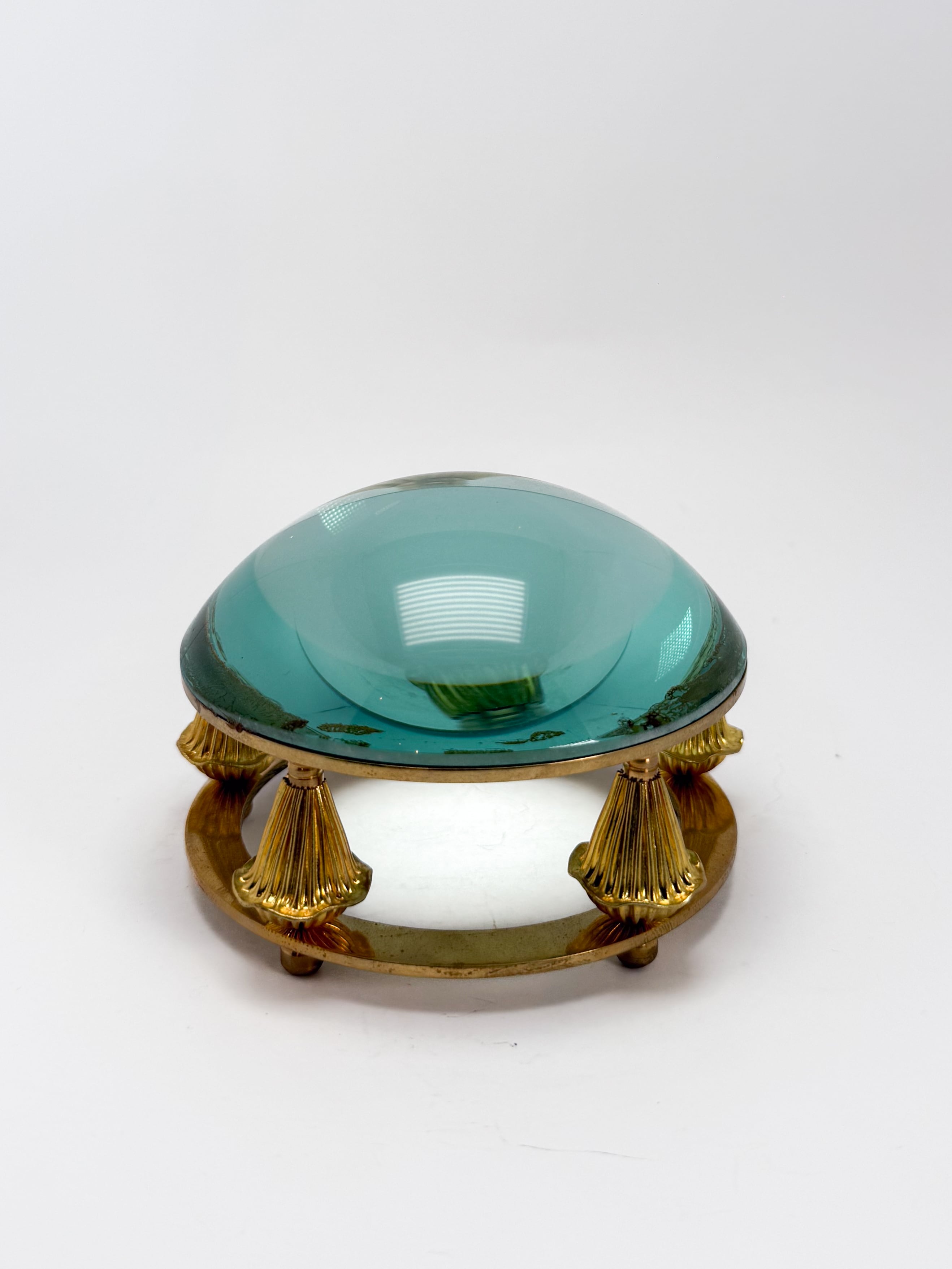 重厚な真鍮の三本脚がレンズを支える、機能美と装飾性が融合したヨーロッパ調のヴィンテージ卓上ルーペです。