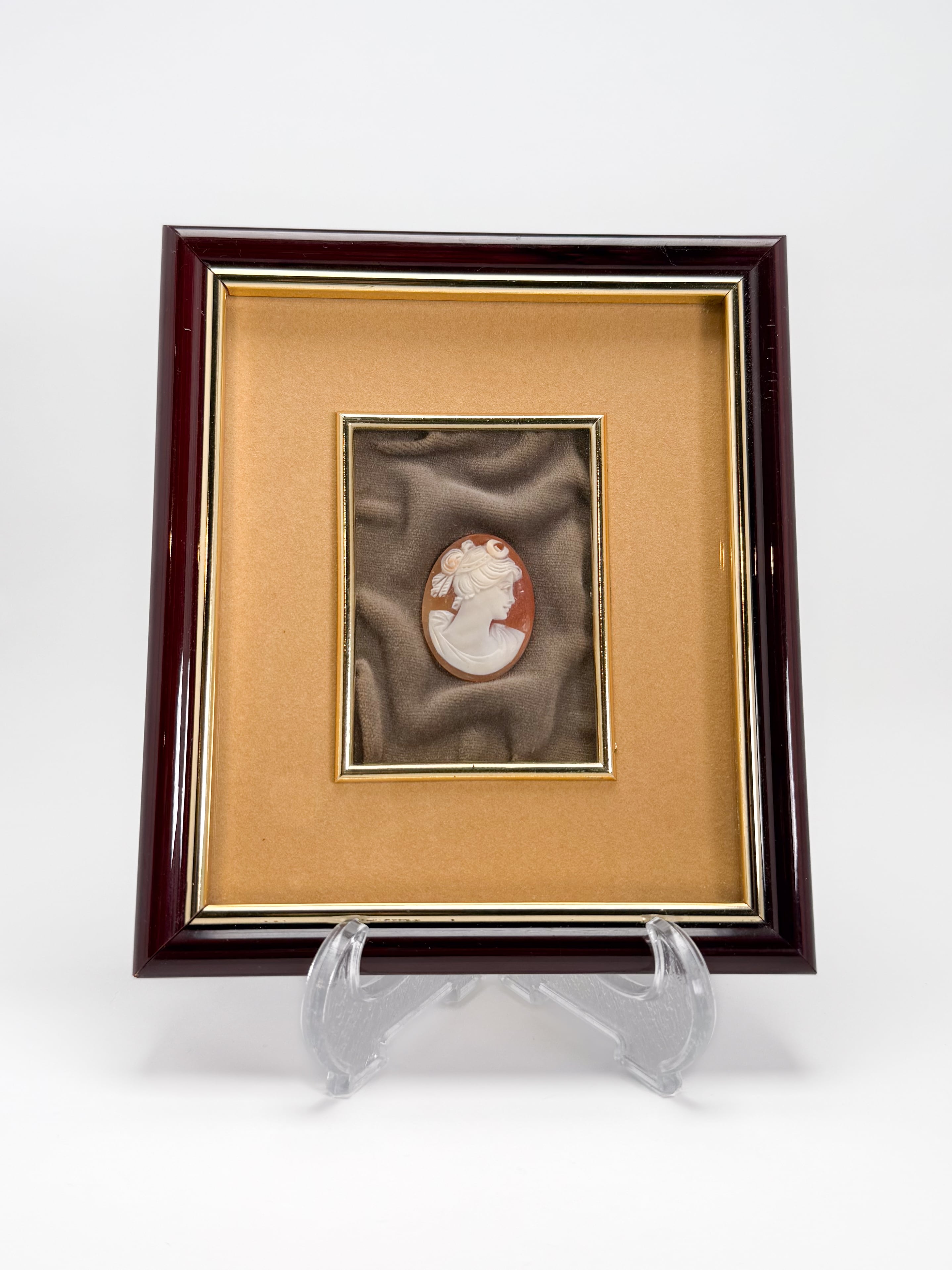 地中海の陽光を浴びた天然のシェルに、高貴な婦人の横顔を精緻な手彫りで写し取った、イタリア・Donato社による額装カメオです。
