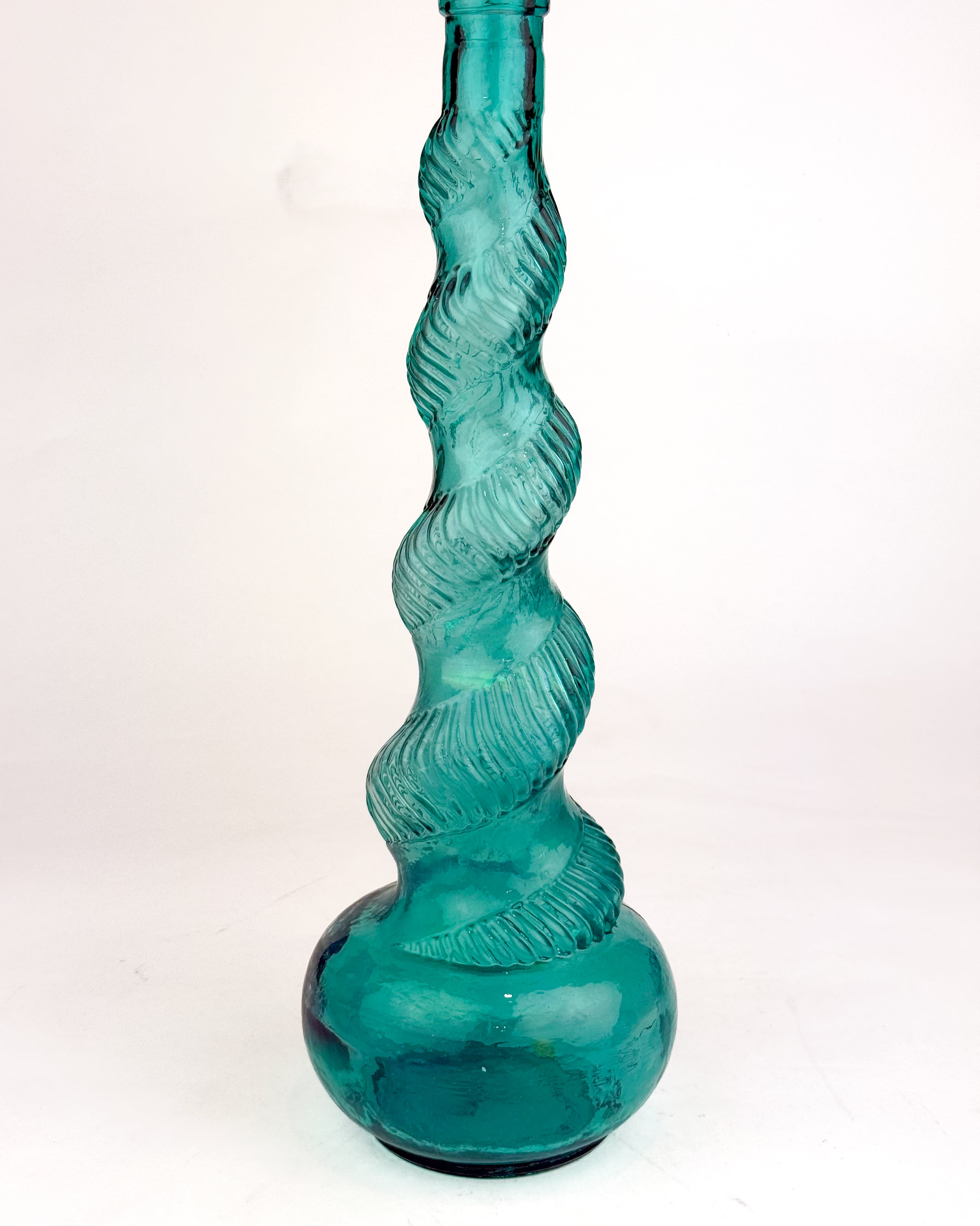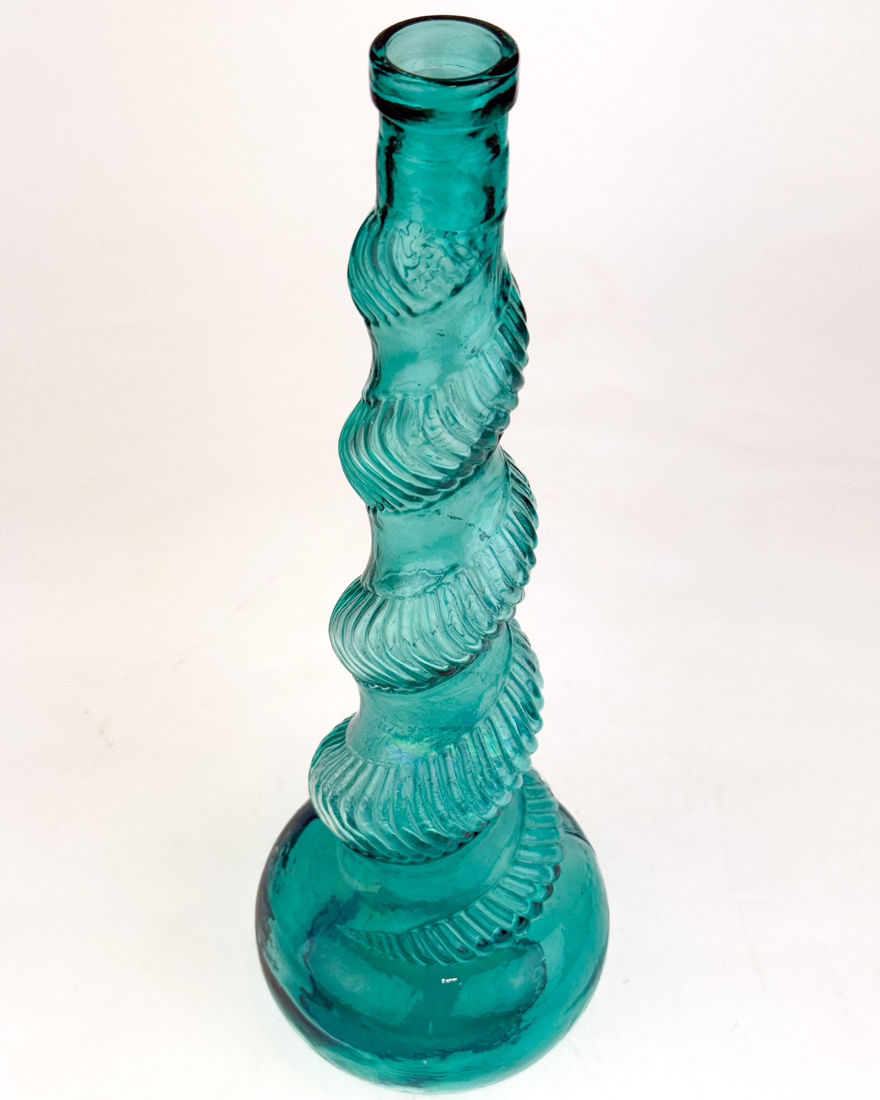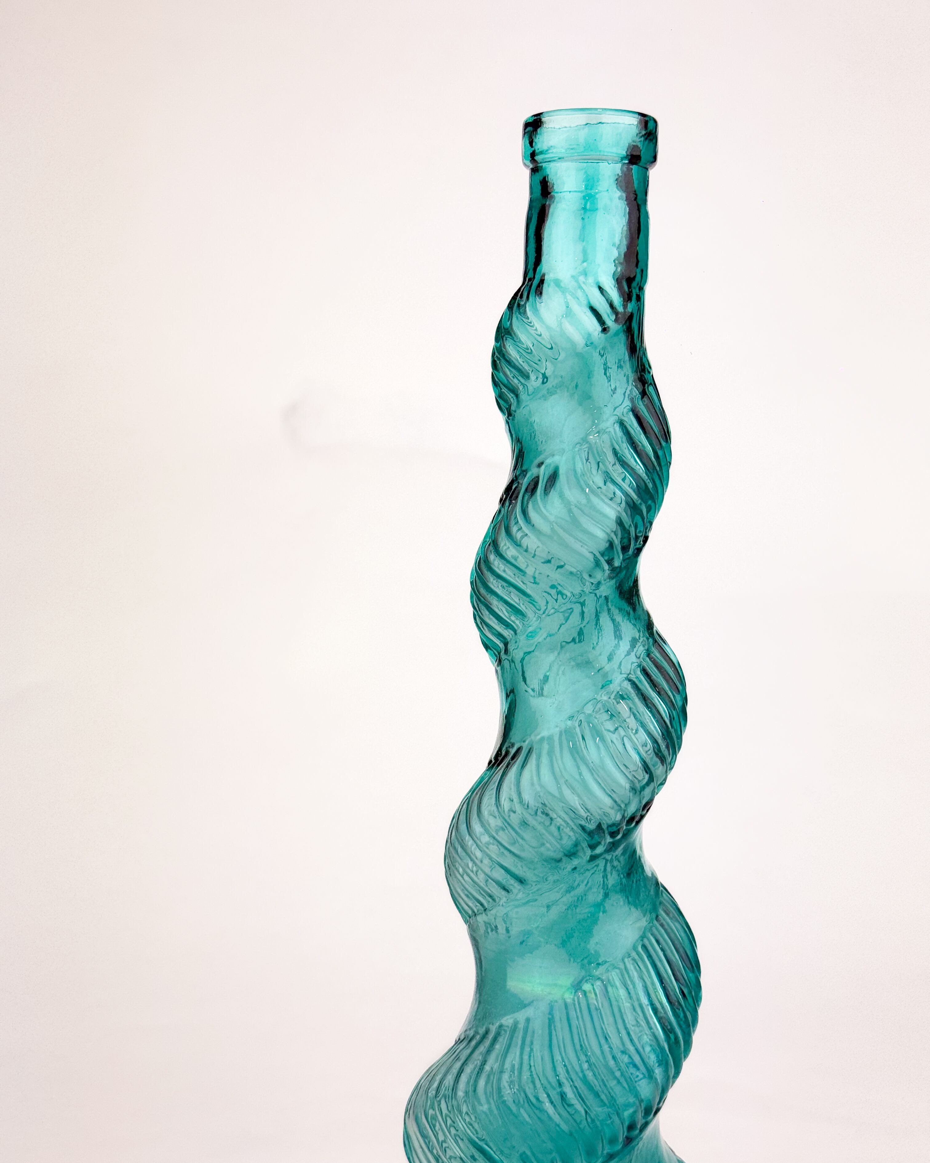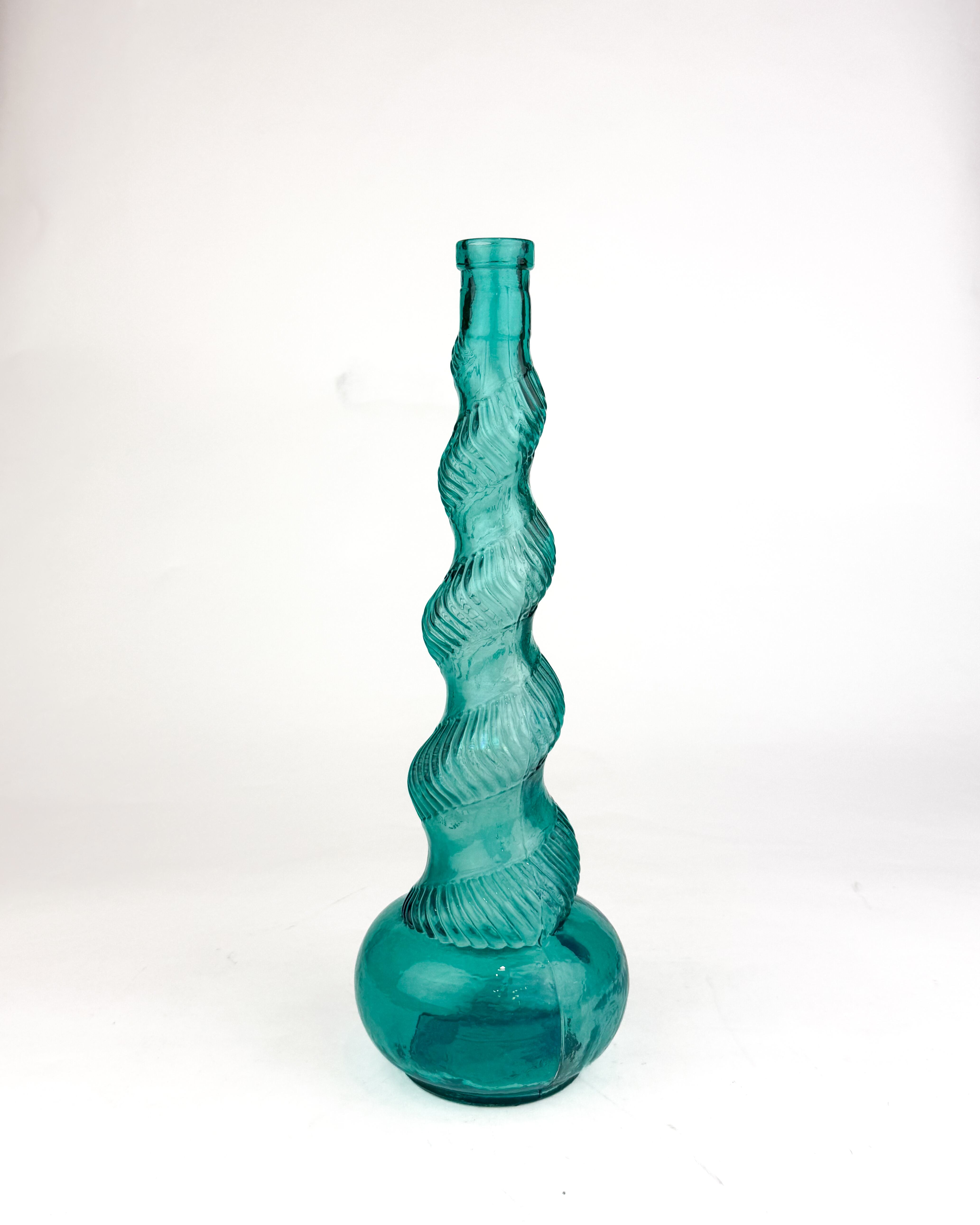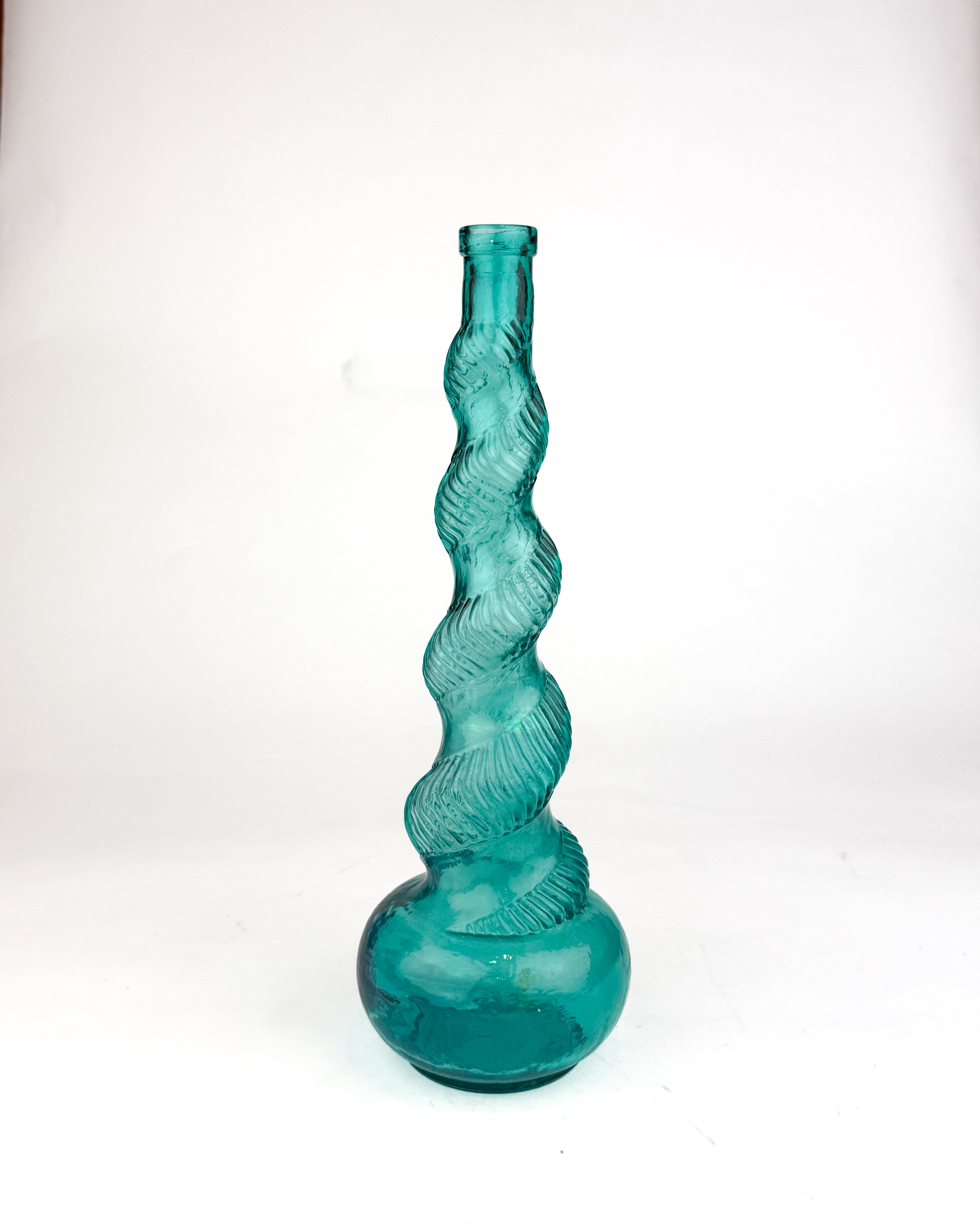 ブルーグリーンの色味が美しい、スパイラル状のねじりデザインが特徴的なフラワーベースです。