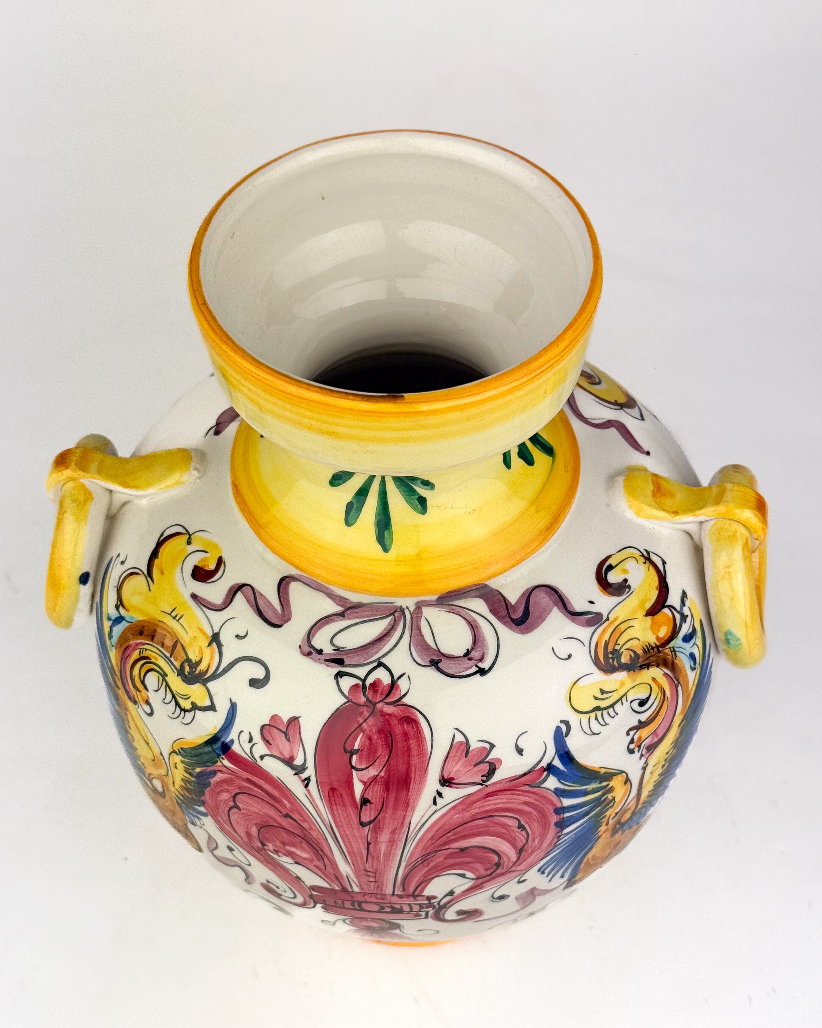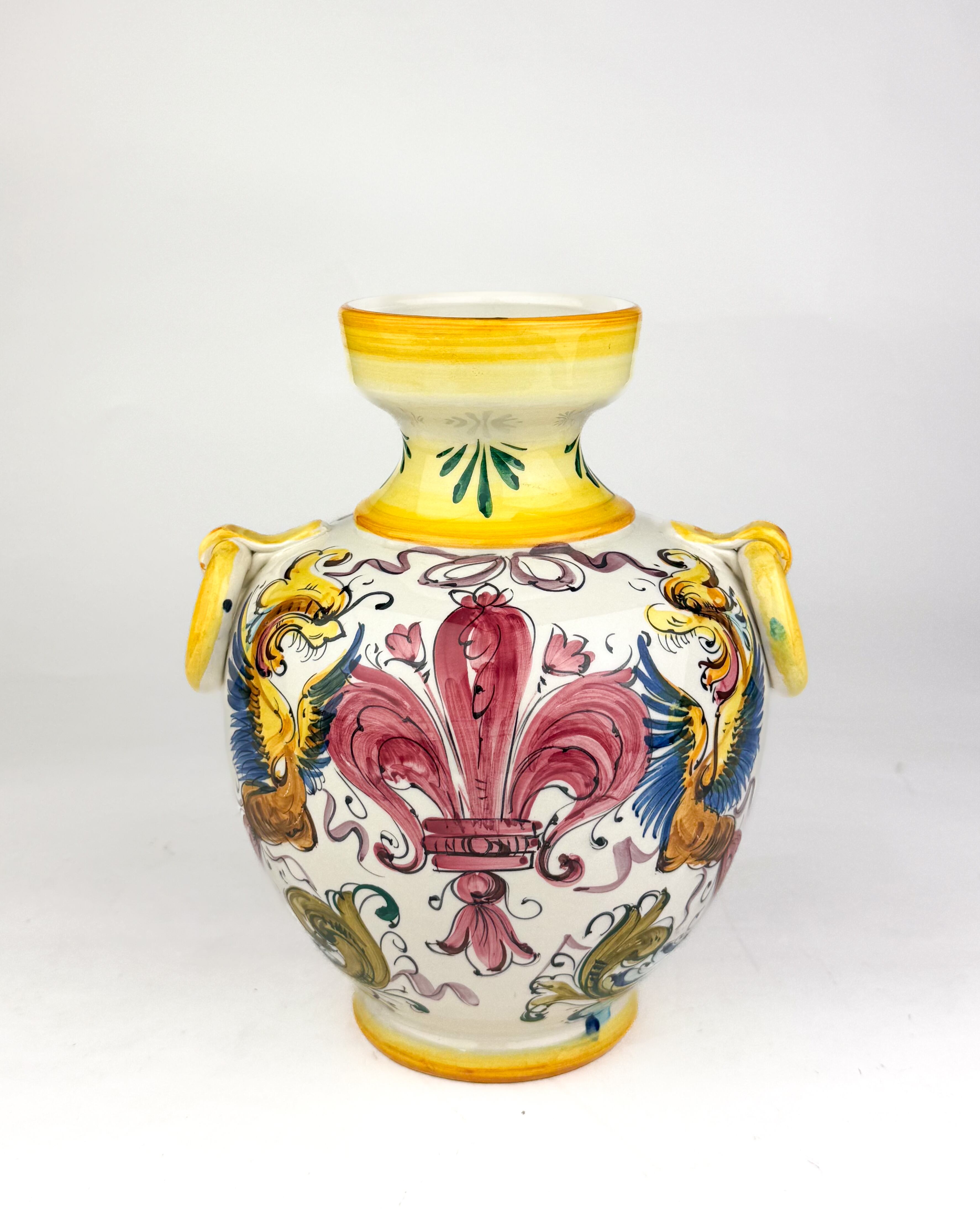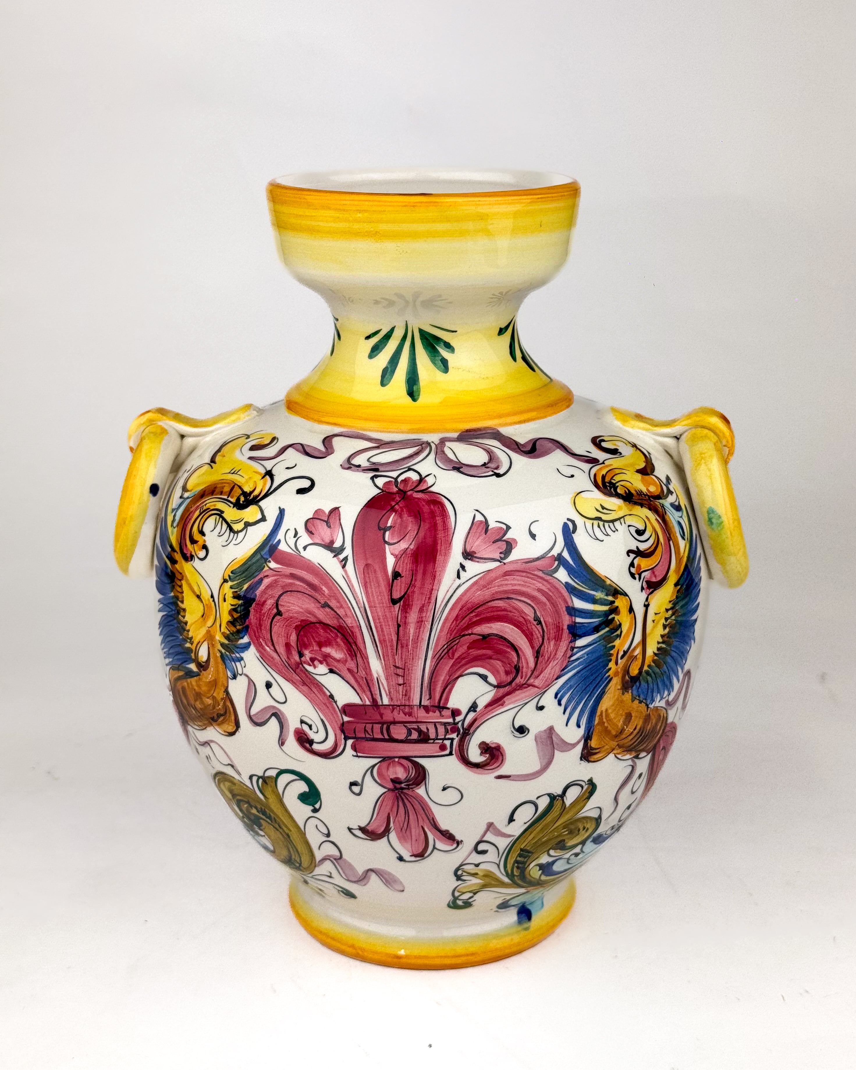 艶のある釉薬と華やかな手描き装飾が特徴で、中央にはユリを思わせる紋章モチーフが描かれています。周囲には植物文様や装飾的なデザインが施されており、全体としてクラシカルで存在感のある仕上がりです。