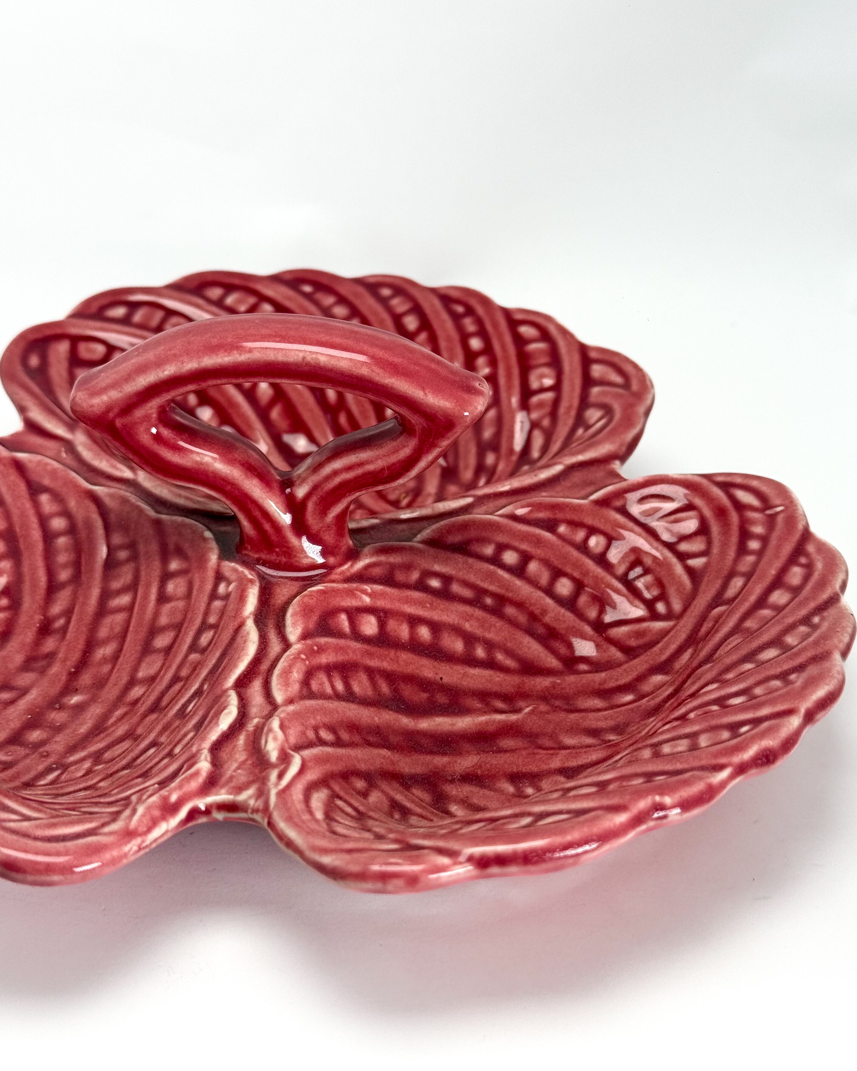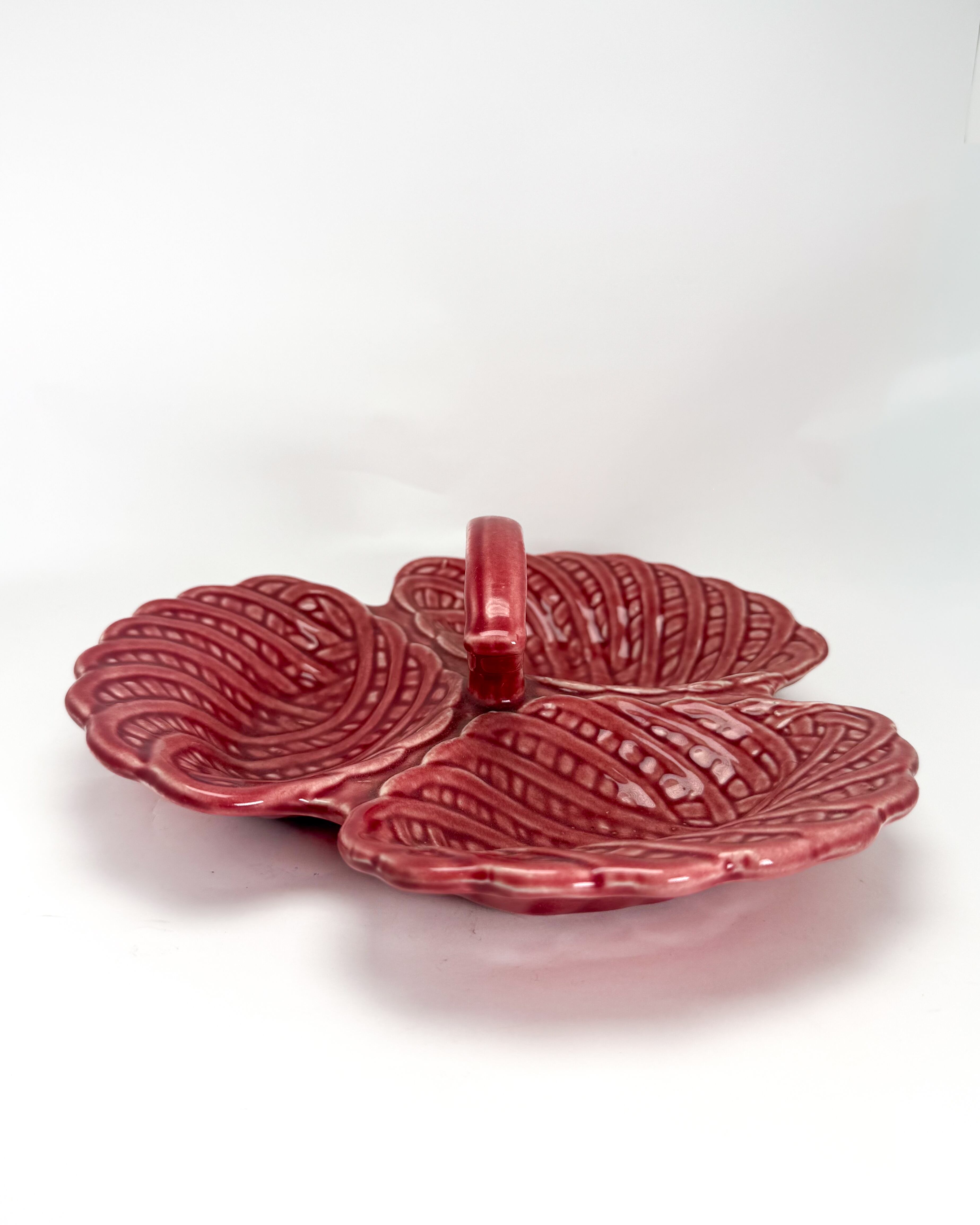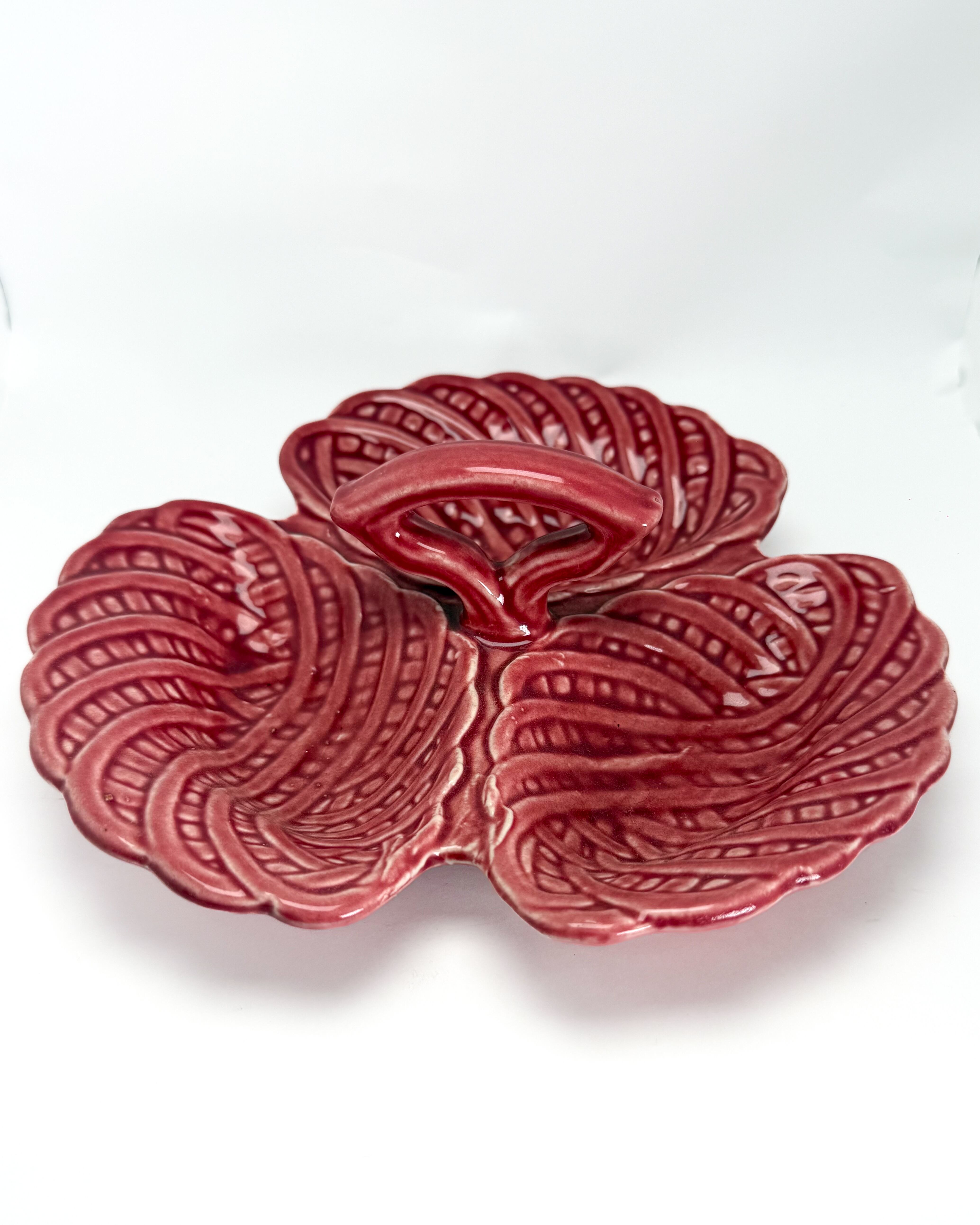 リーフ(葉)をモチーフにした立体的なフォルムで、3つに仕切られたデザインが特徴です。艶のある釉薬による鮮やかな色合いと、厚みのある質感がヴィンテージらしい存在感を感じさせます。中央にはハンドルが付いており、持ち運びやサービングにも便利な仕様です。