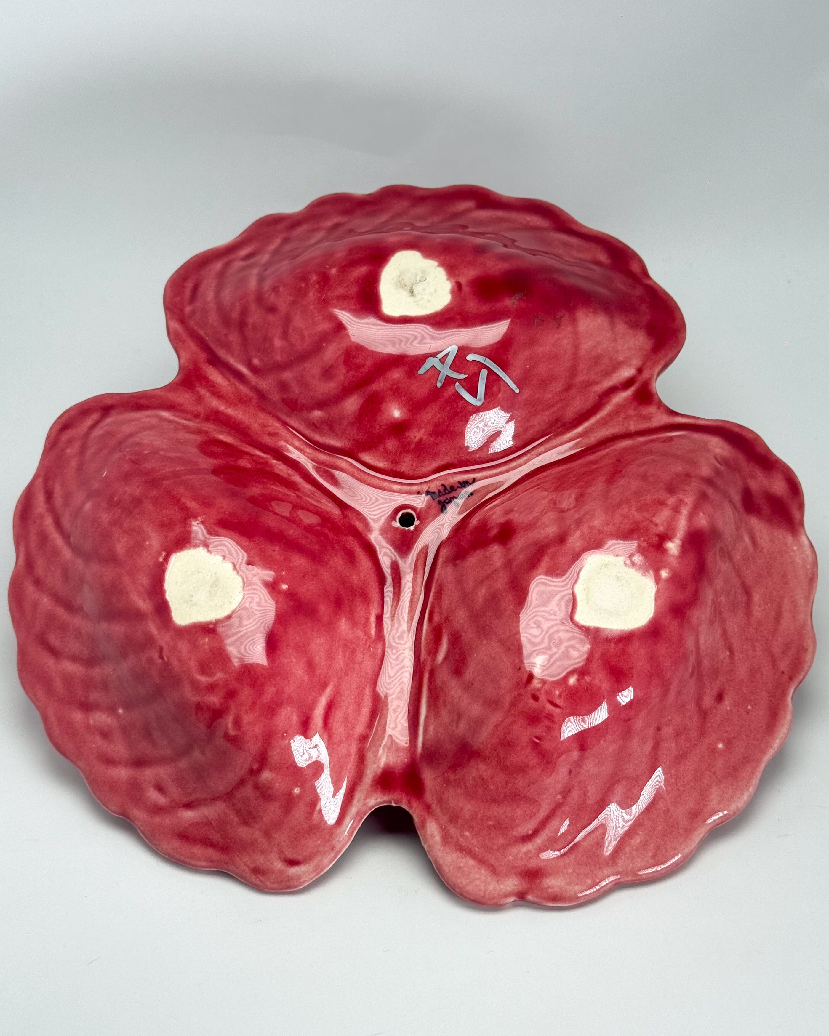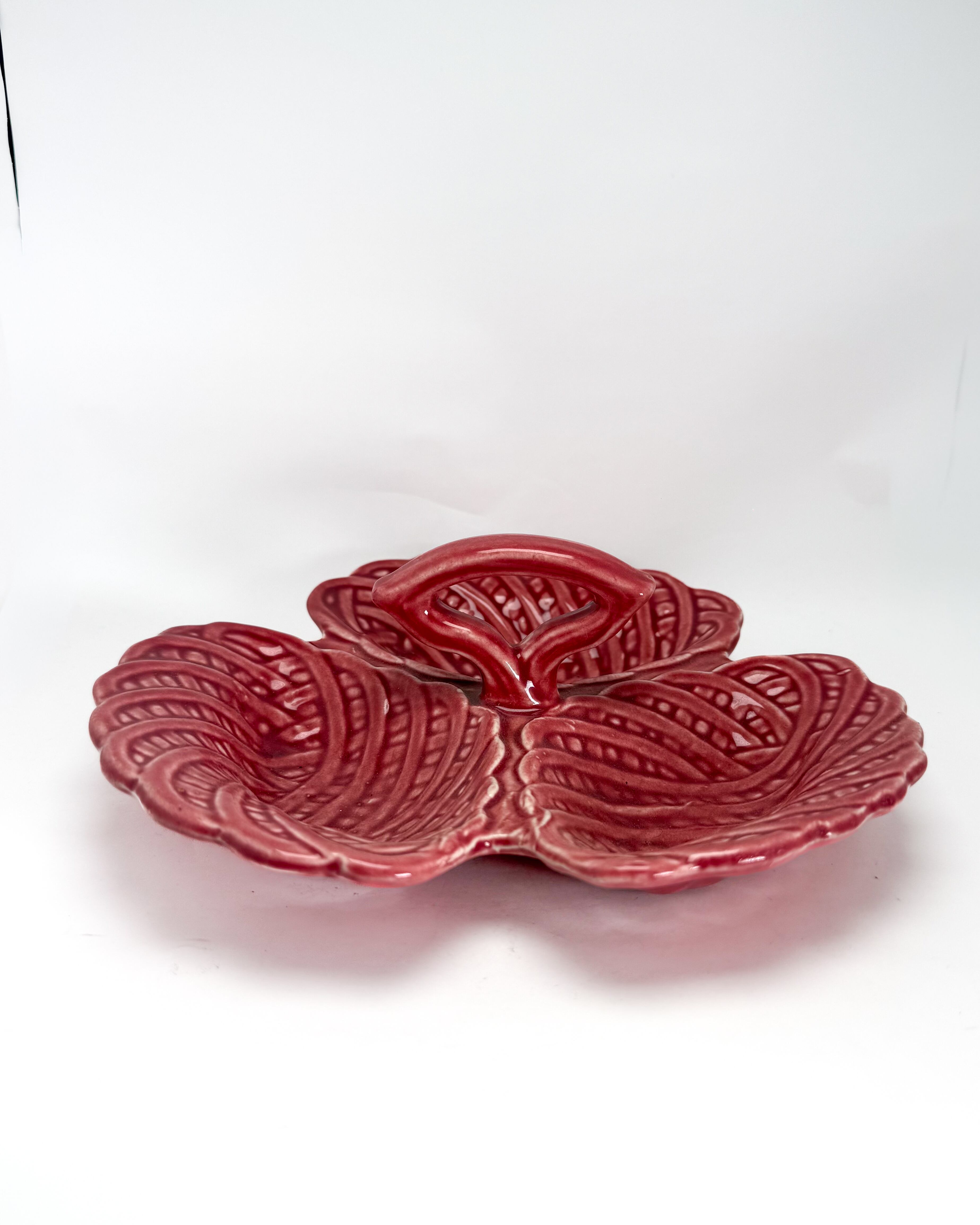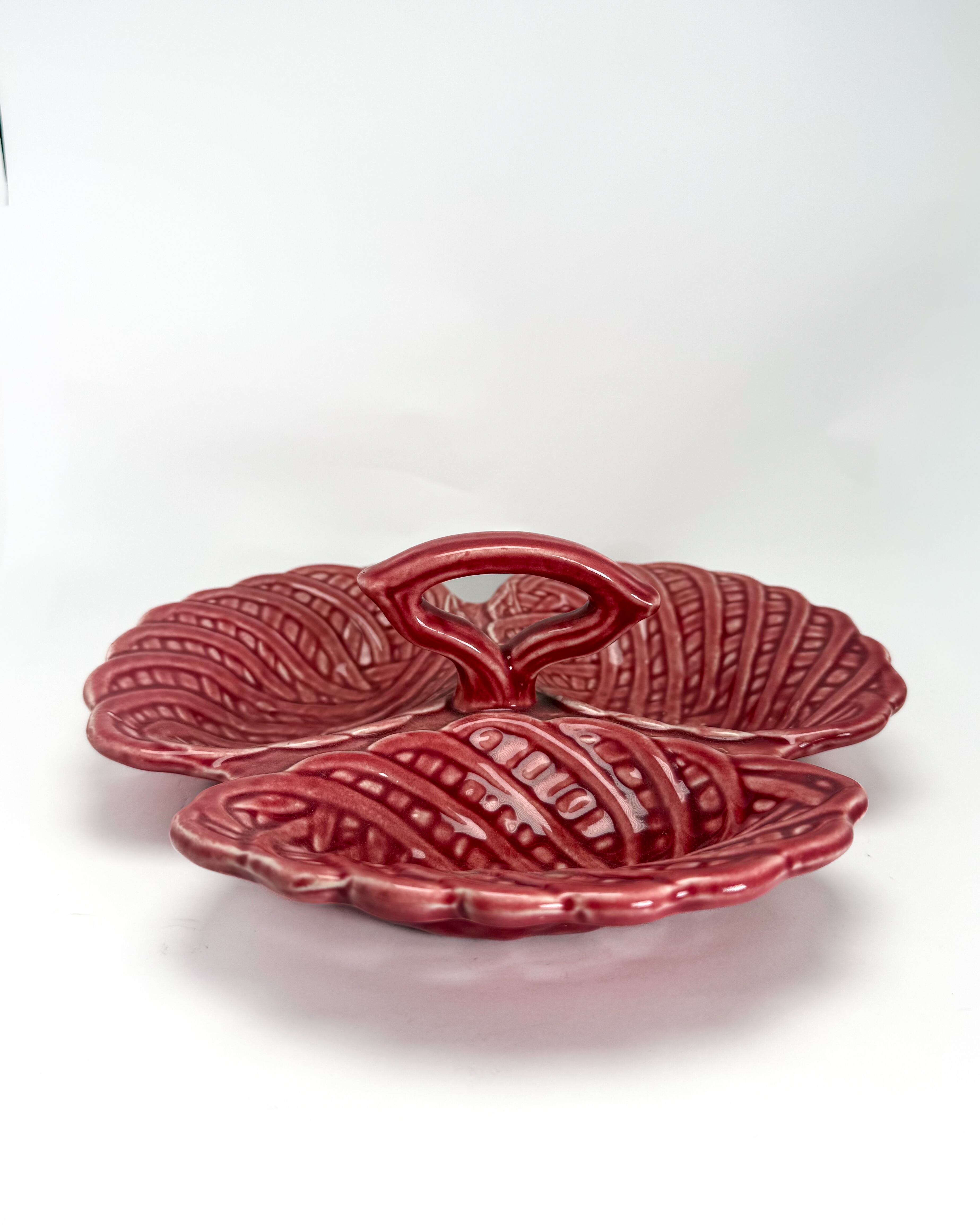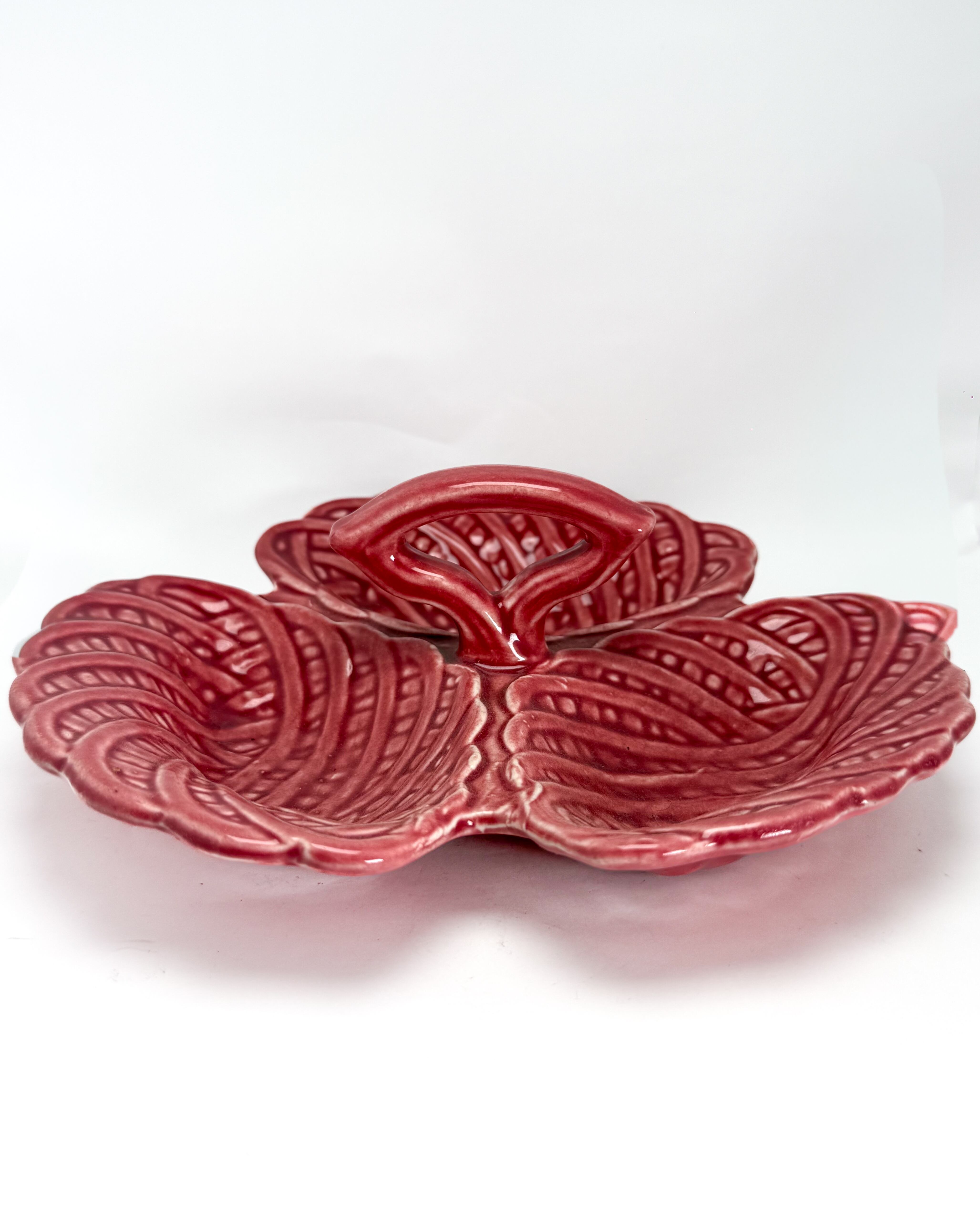 リーフ(葉)をモチーフにした立体的なフォルムで、3つに仕切られたデザインが特徴です。艶のある釉薬による鮮やかな色合いと、厚みのある質感がヴィンテージらしい存在感を感じさせます。中央にはハンドルが付いており、持ち運びやサービングにも便利な仕様です。