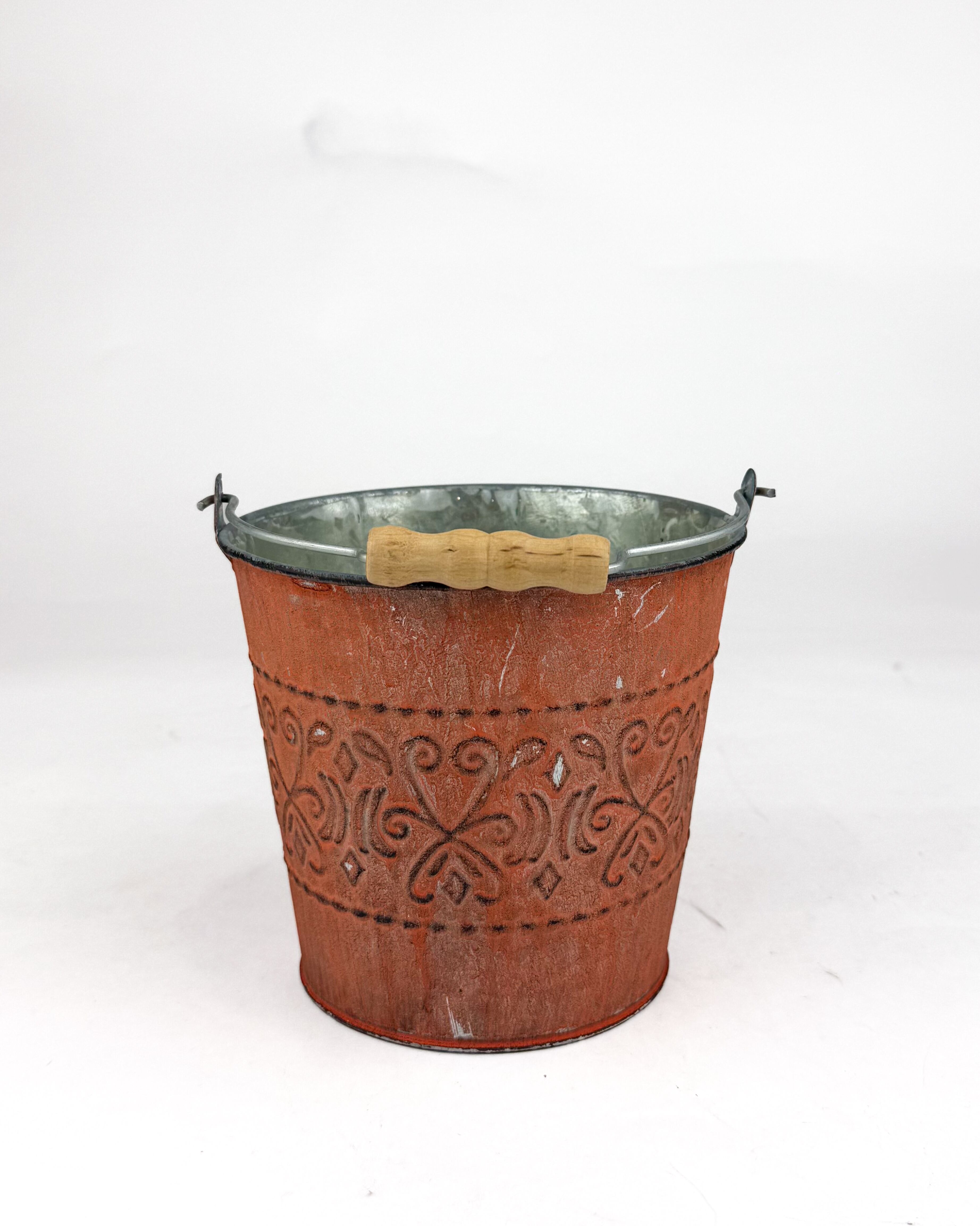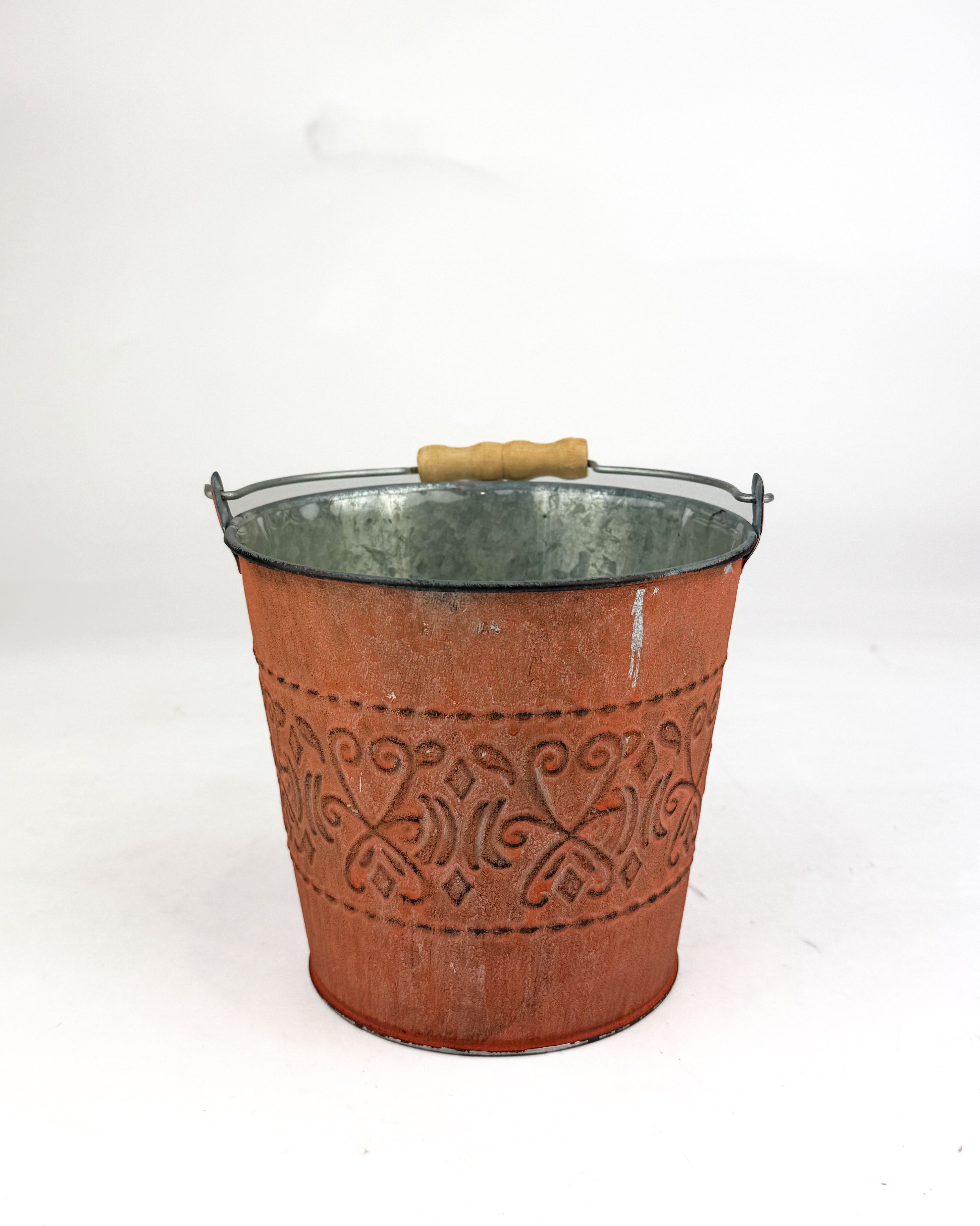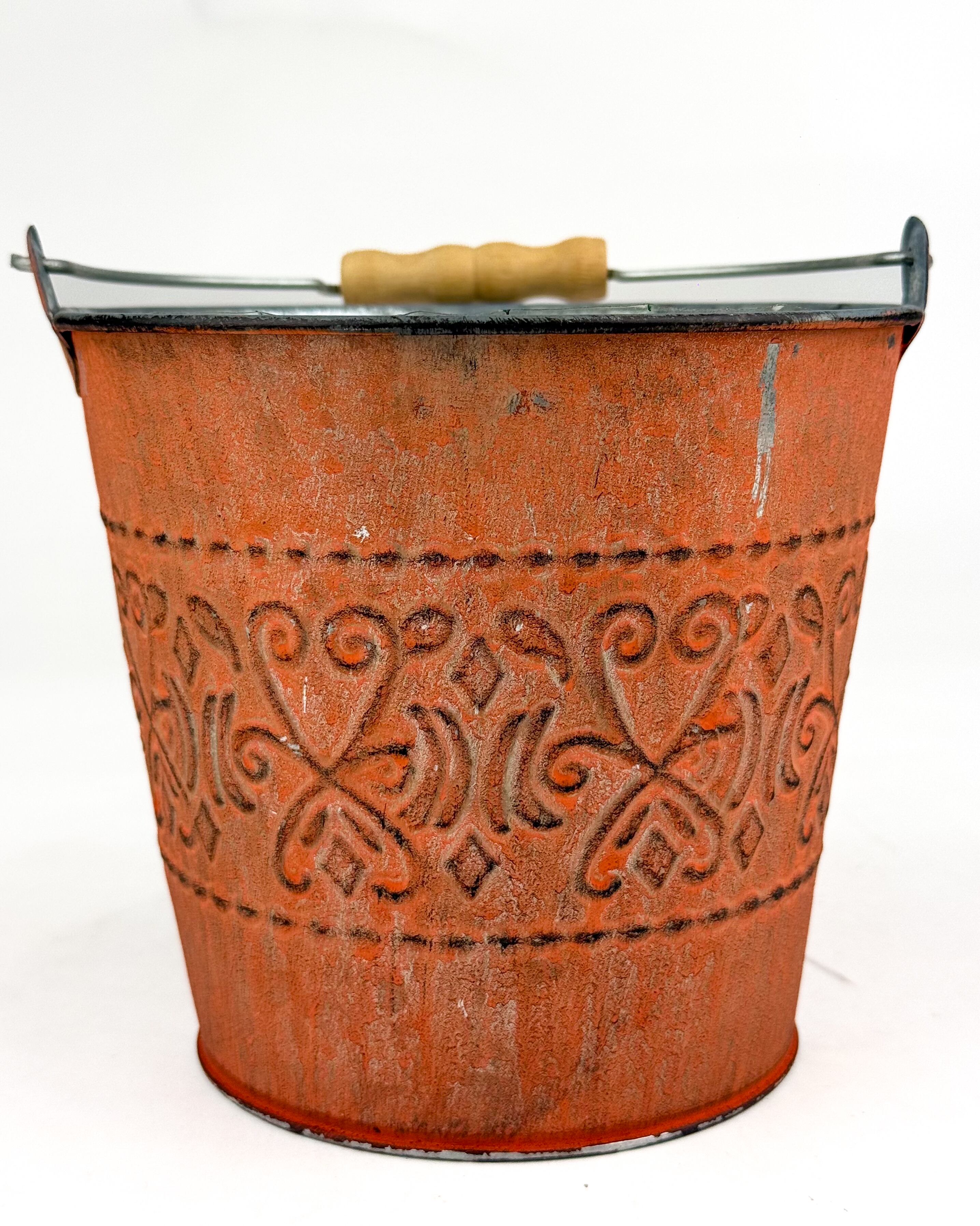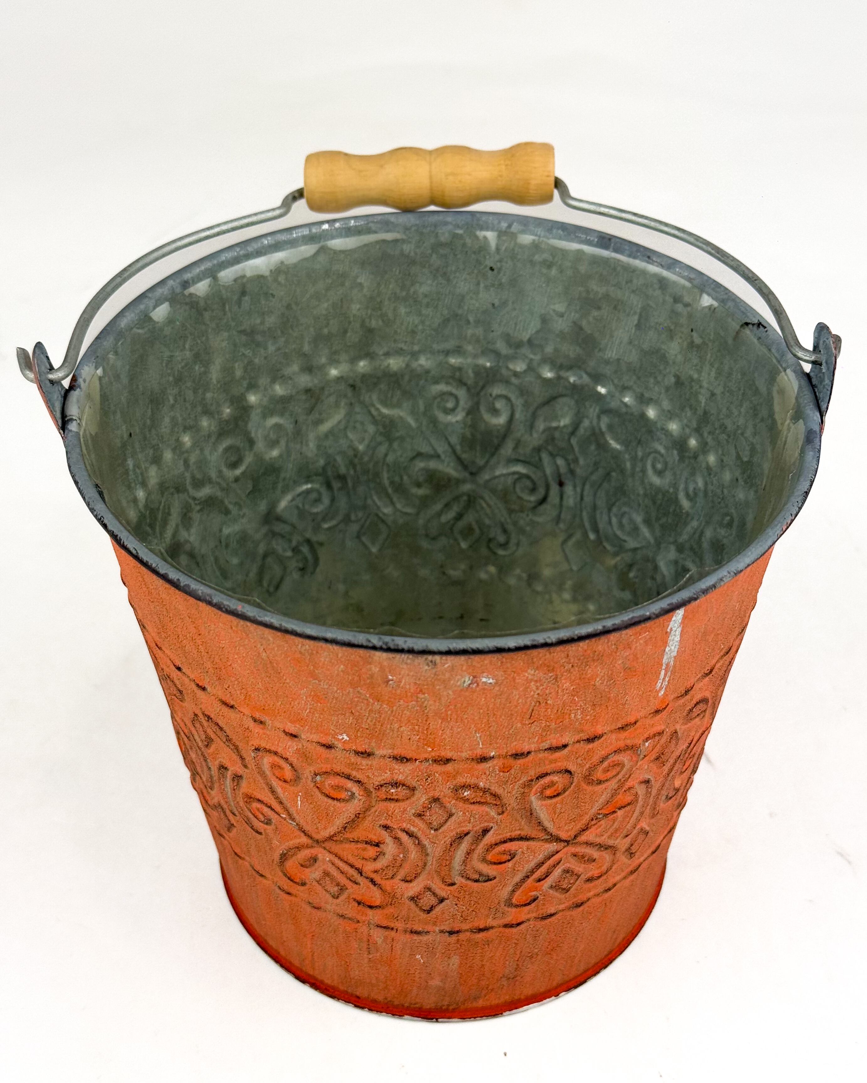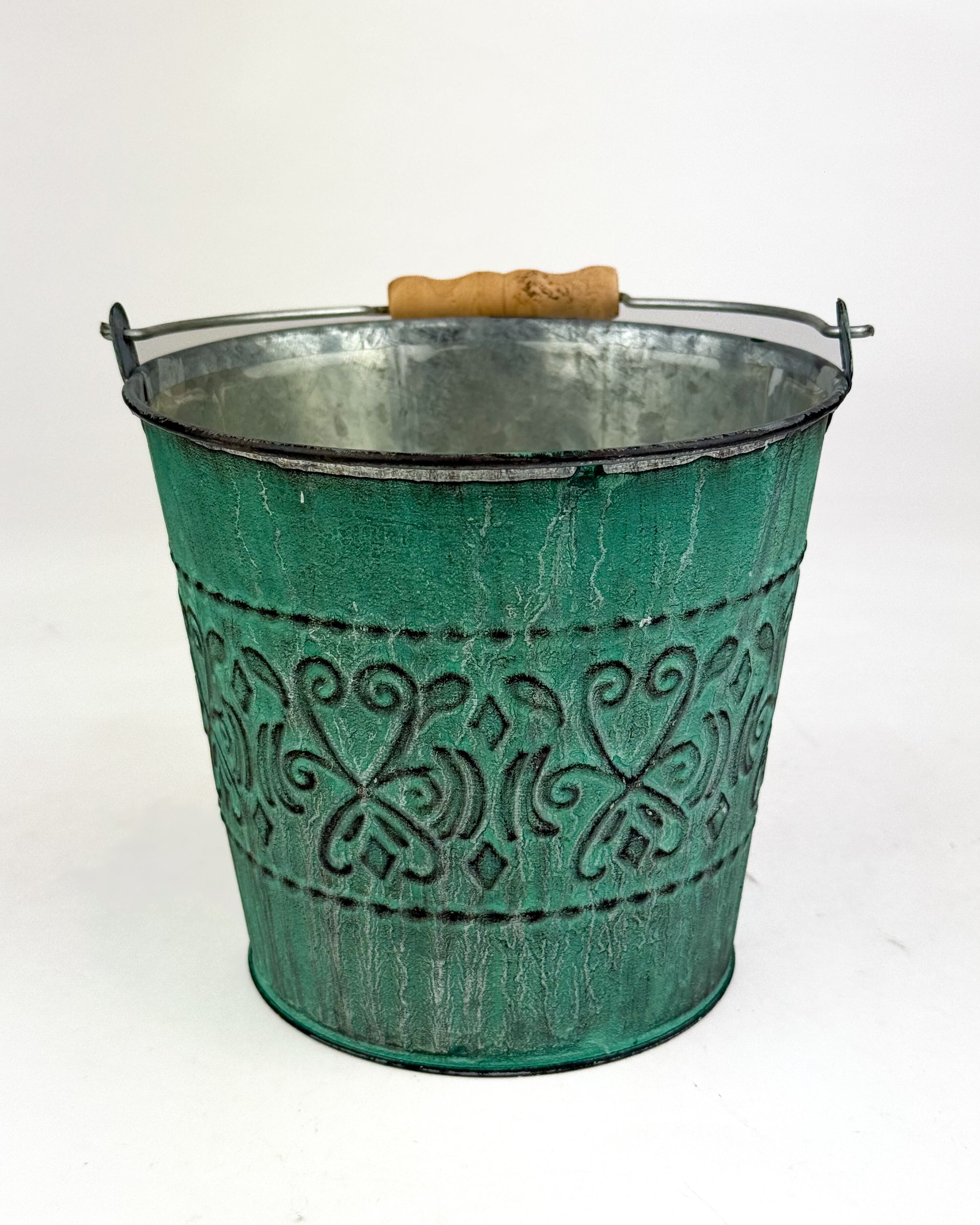 クラシックなエンボス(型押し)模様が施された、アンティーク調のブリキバケツです。