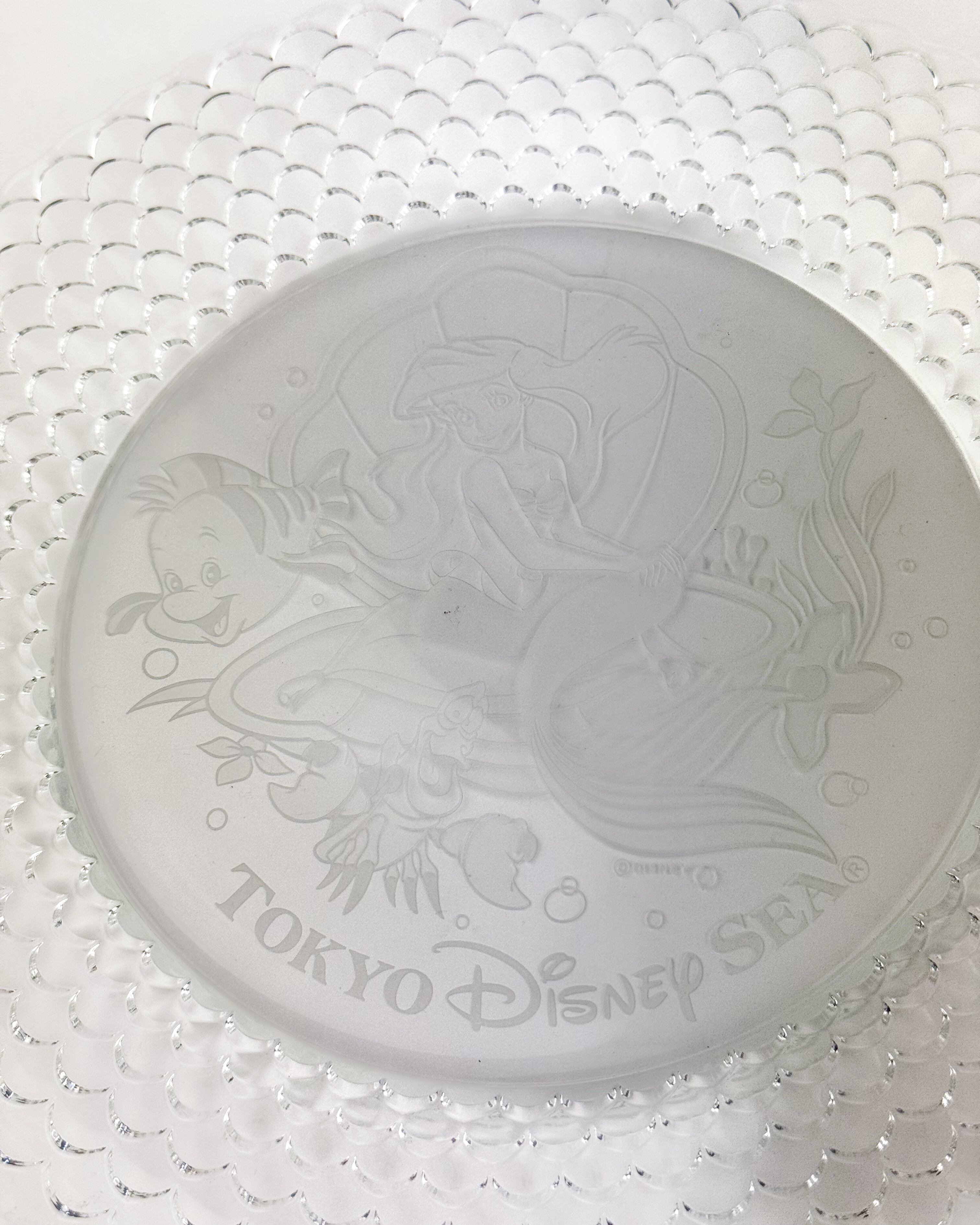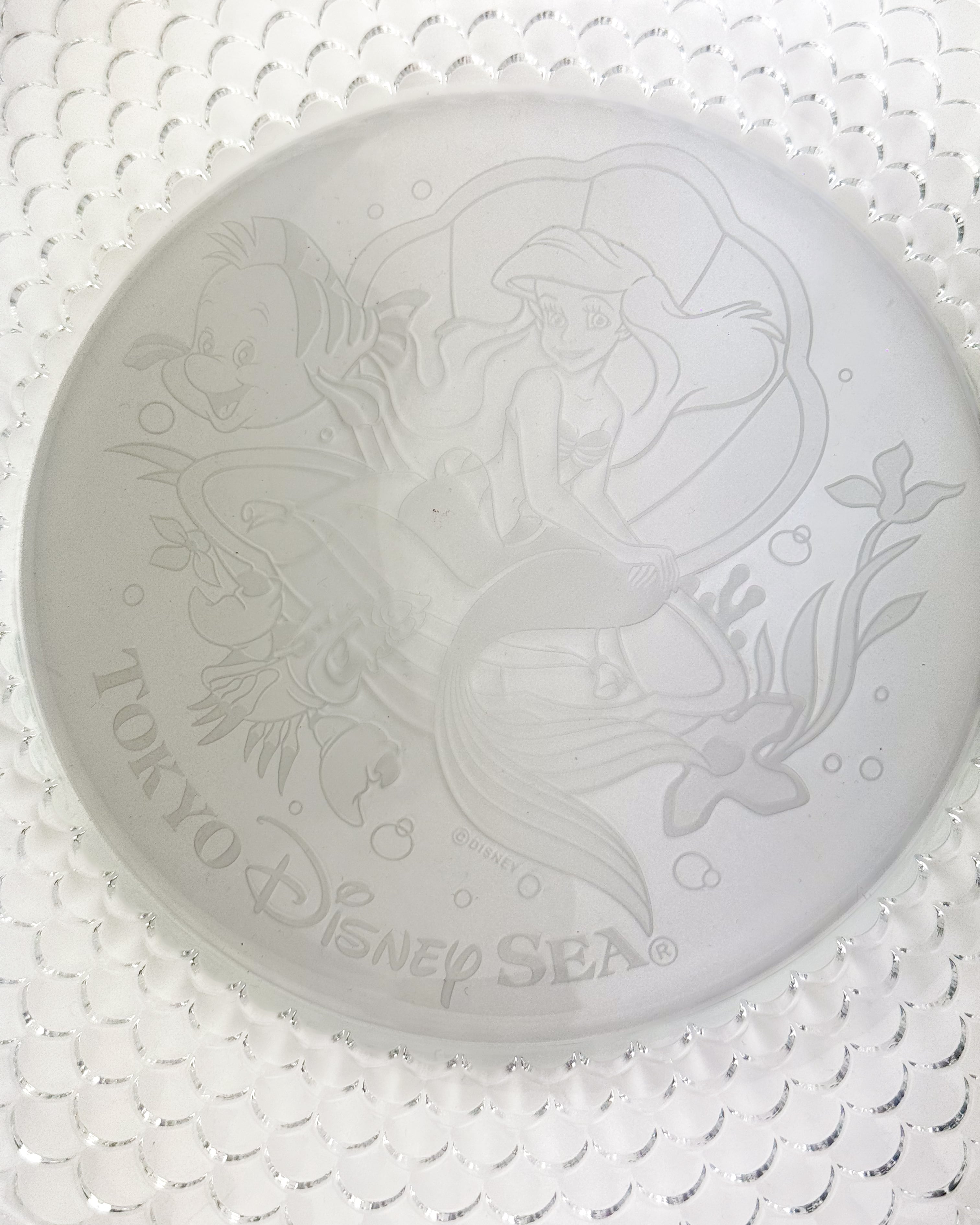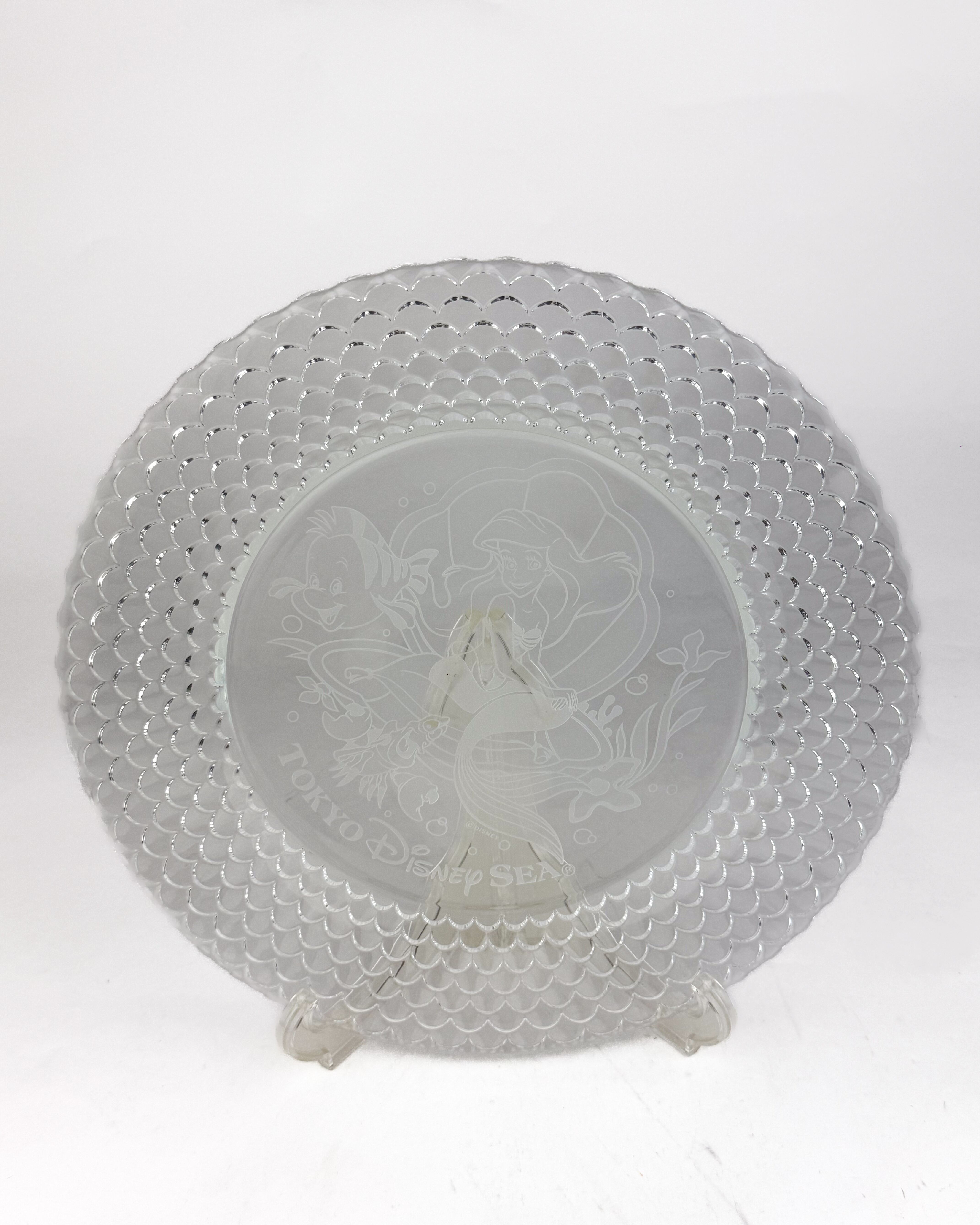 中央にはアリエルとフランダーがエッチングで表現されており、透明感のあるガラスに繊細なデザインが映える仕上がりとなっています。縁部分にはうろこを思わせるカット装飾が施され、海の世界観を感じさせるデザインです。